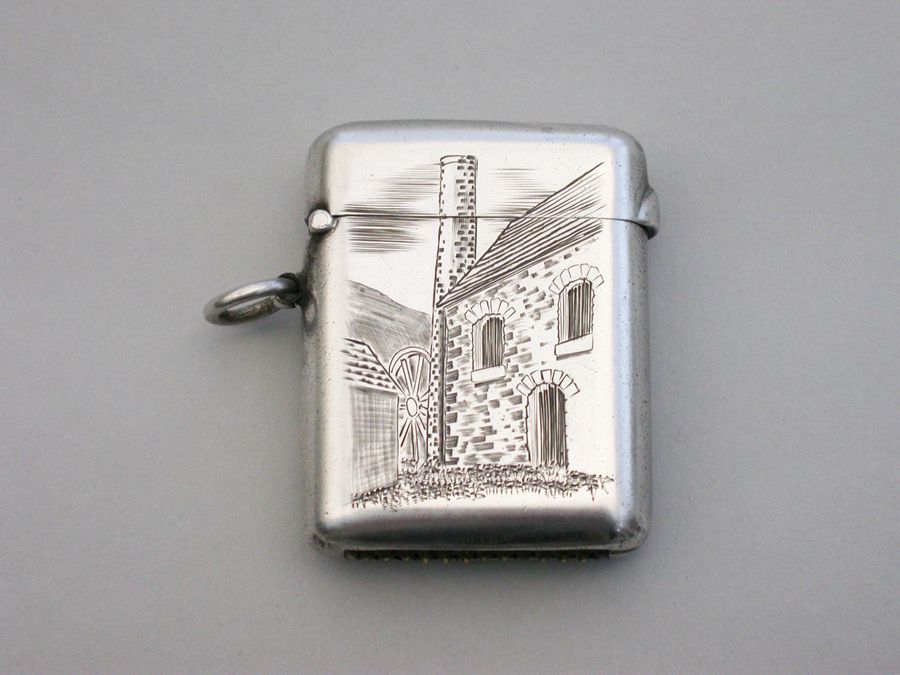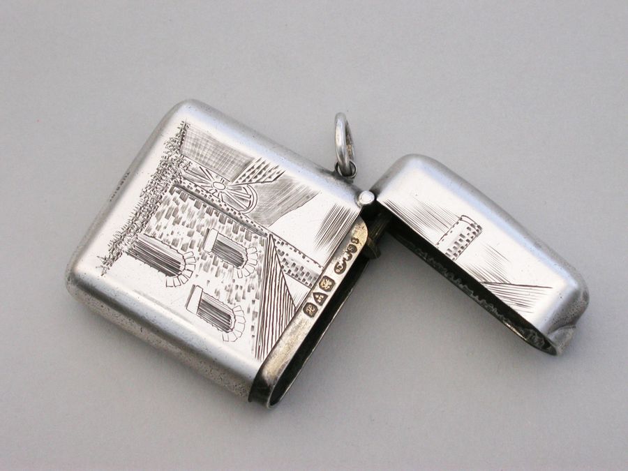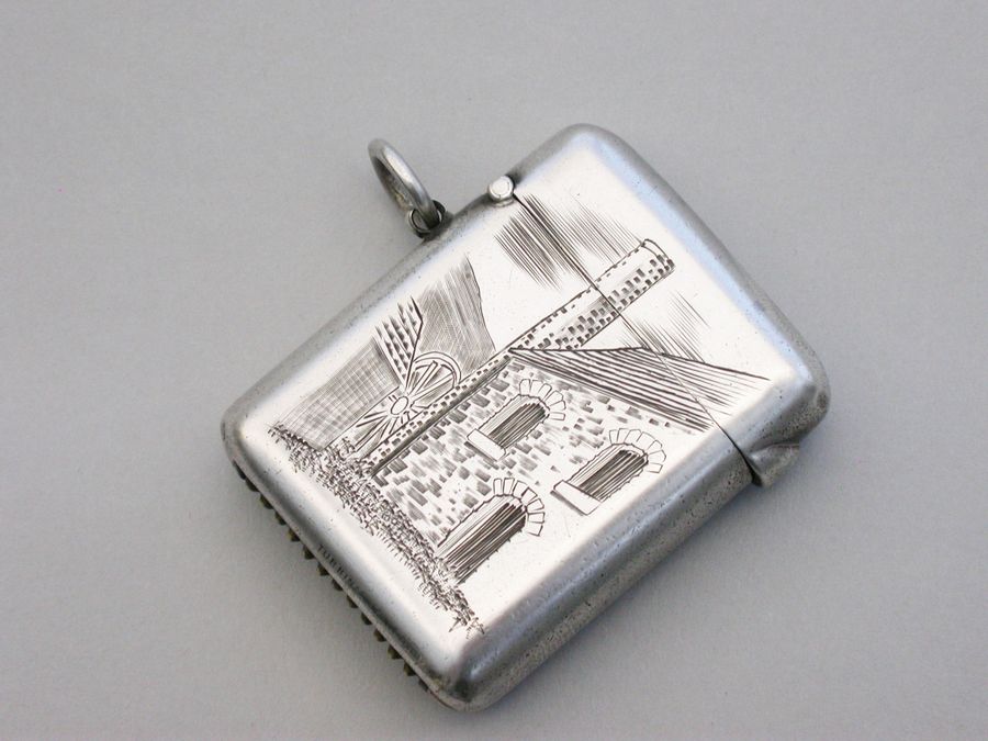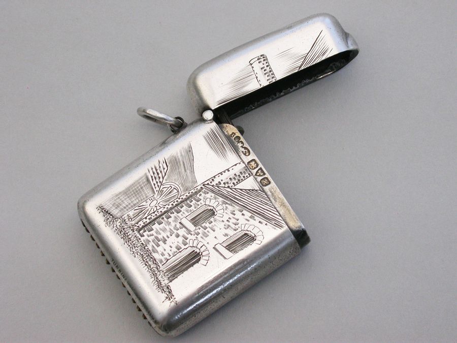 A good quality Edwardian silver Vesta Case of rounded rectangular seamless non-choke form with patent turbine striker. The face engraved with a scene depicting a brick built Mill House.