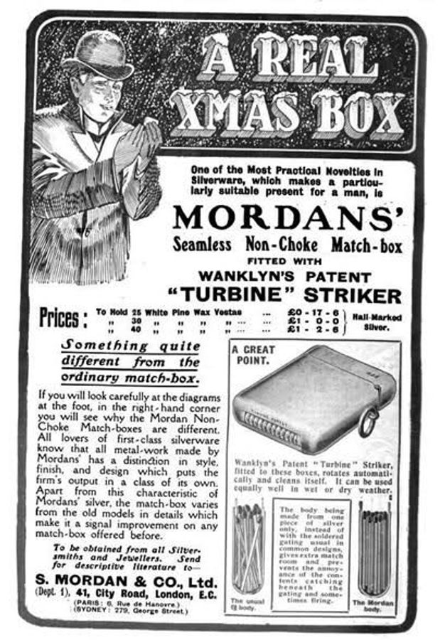 Mordans' seamless non-choke Match Box is described in the contemporary advert as ""something quiet different from the ordinary matchbox"". The body being made from one piece of silver only, instead of with the soldered gating usual in common designs, gives extra match room and prevents the annoyance of the contents catching beneath the gating and sometimes firing.