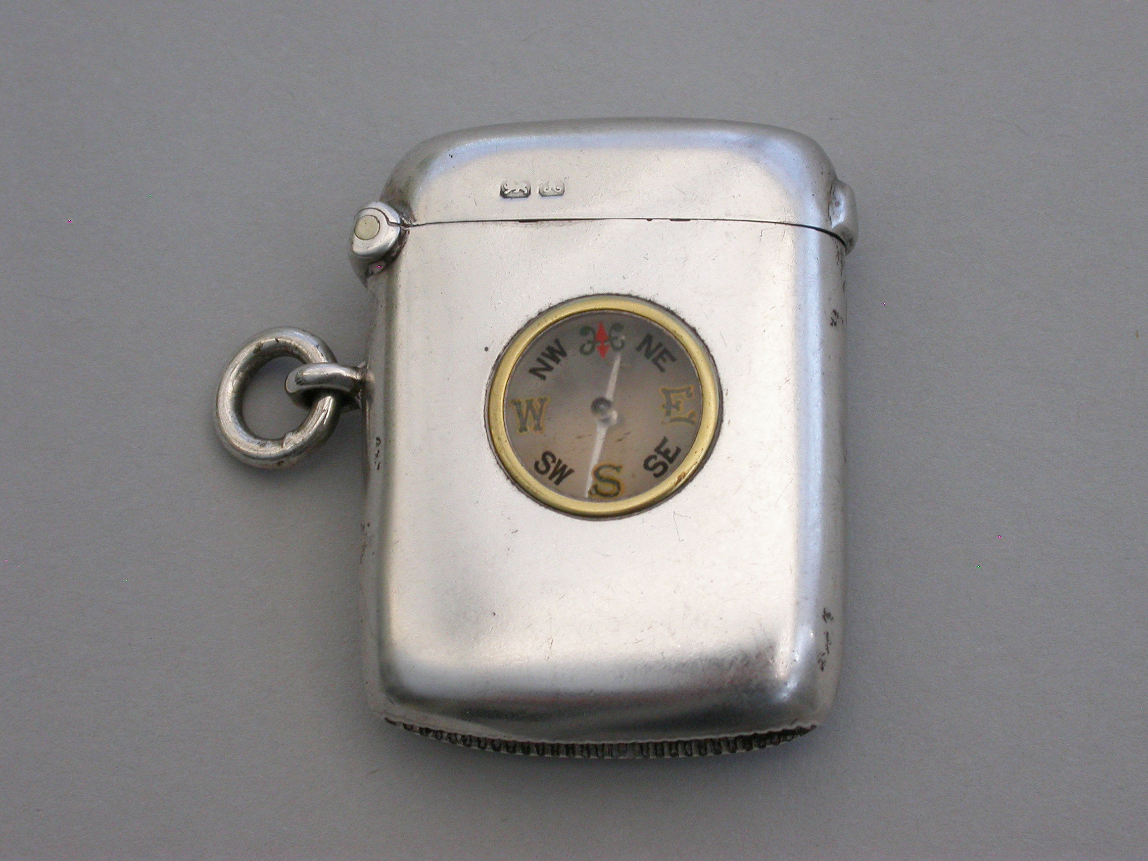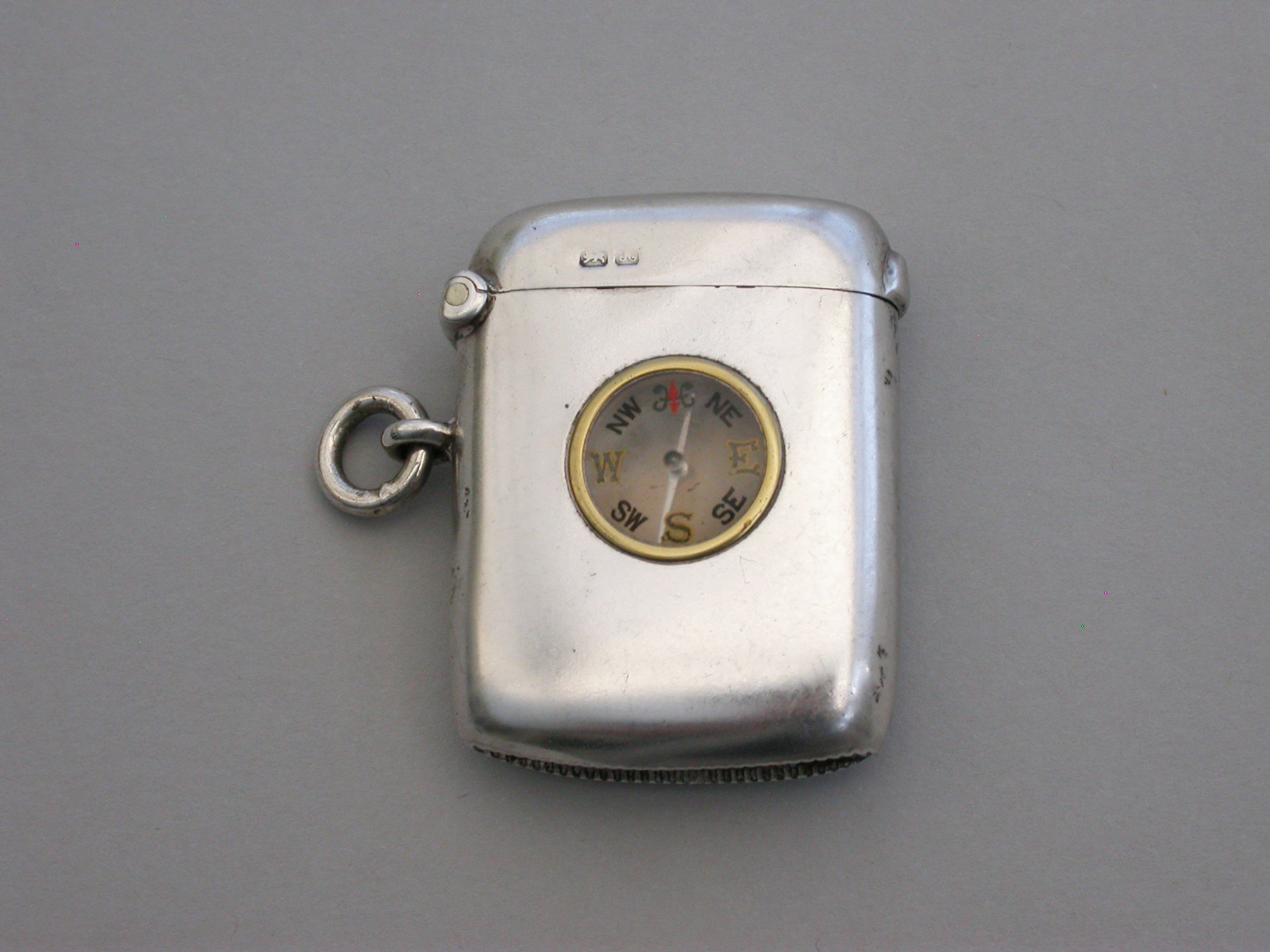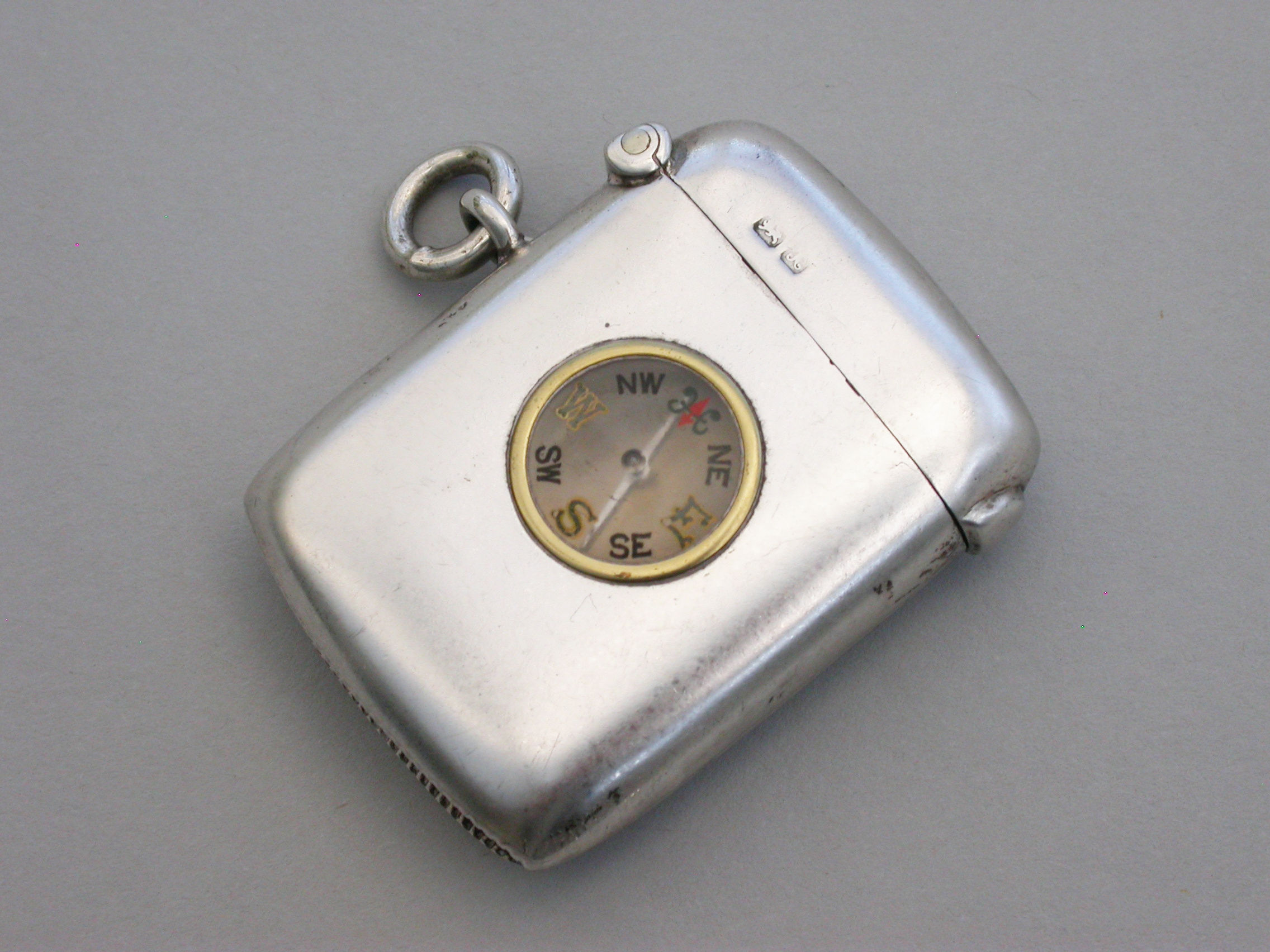 A rare Edwardian silver Vesta Case of plain rounded rectangular form with hinged flip-top lid and attached suspension ring, the face inset with a compass.