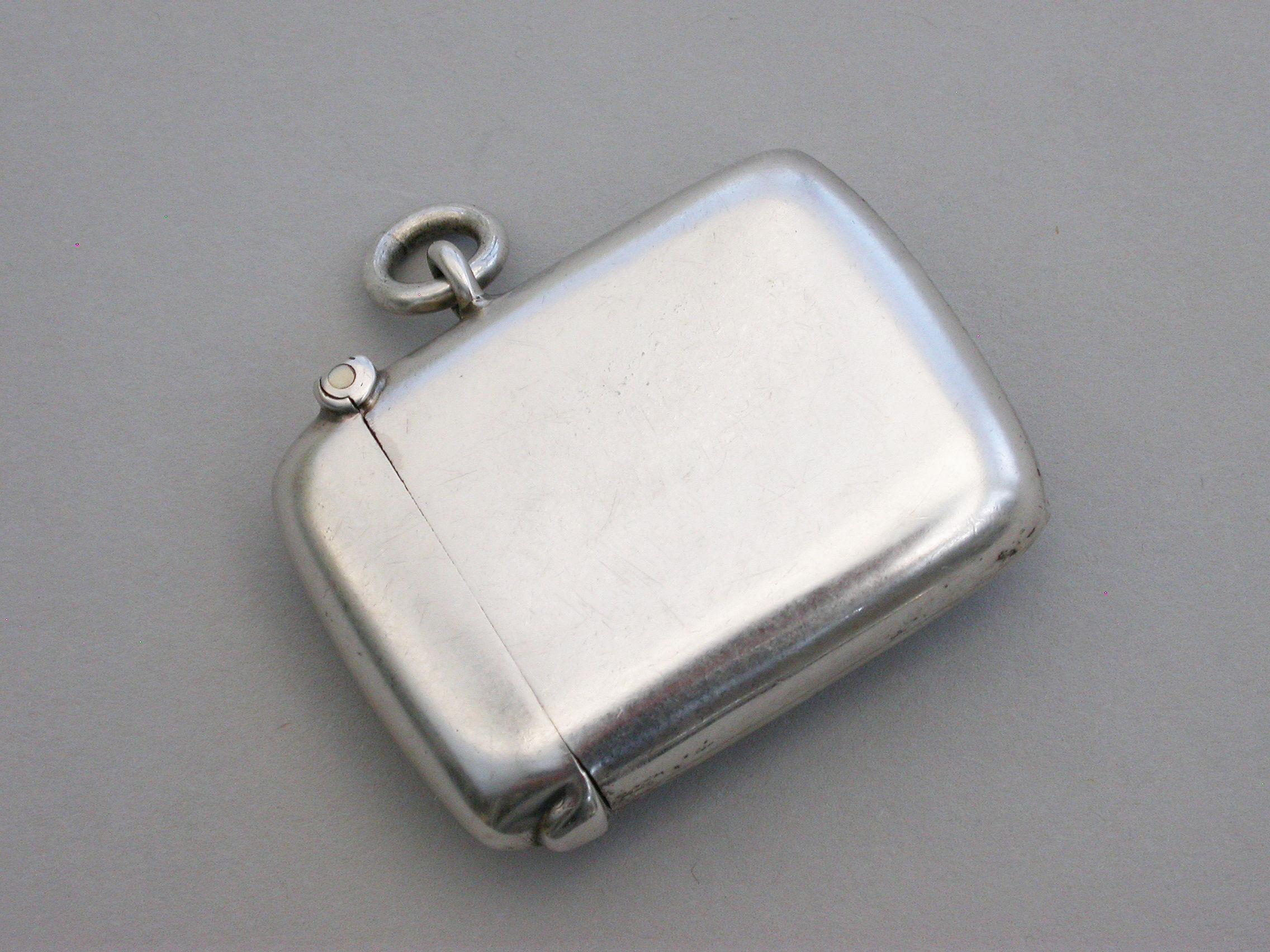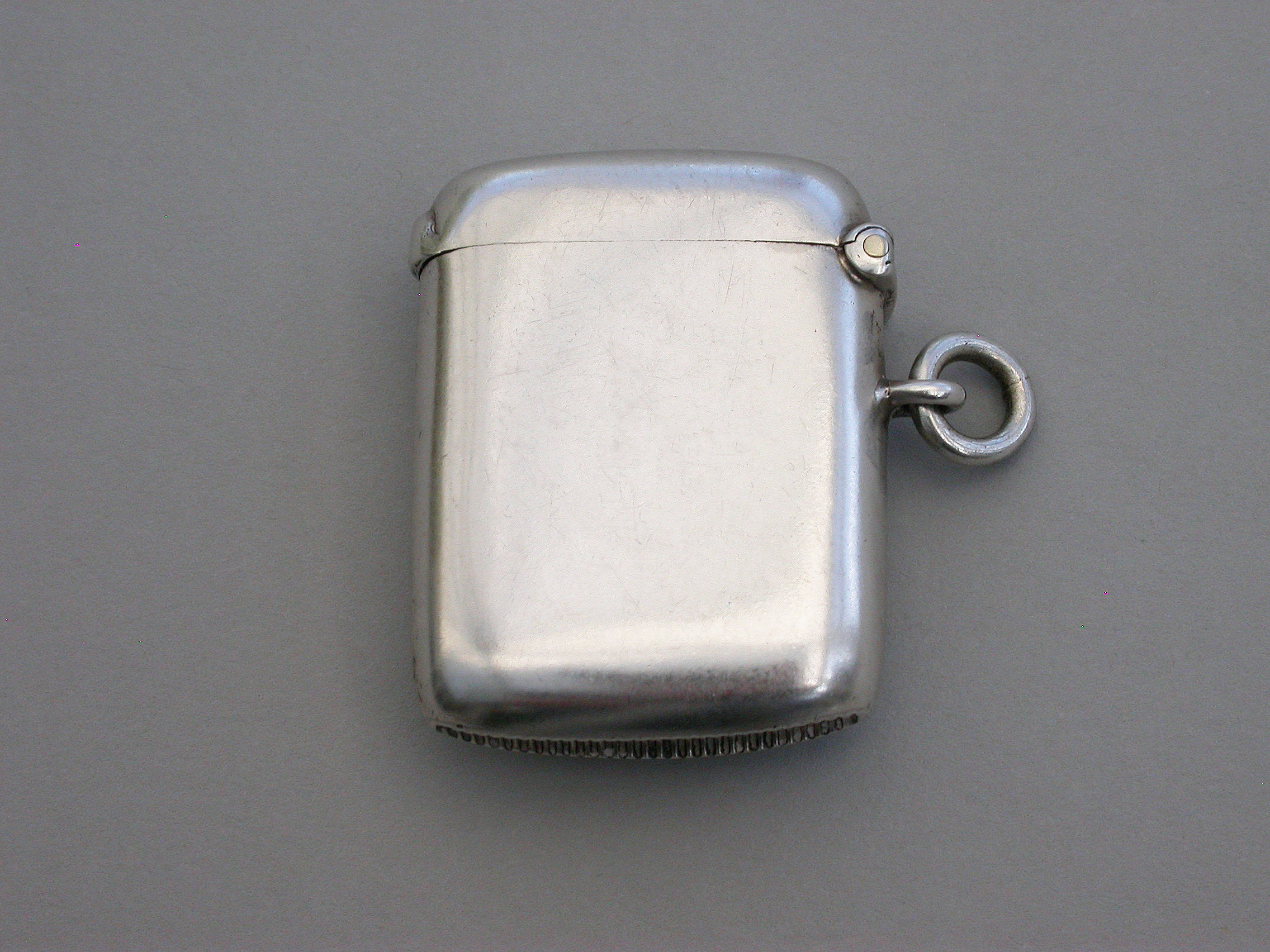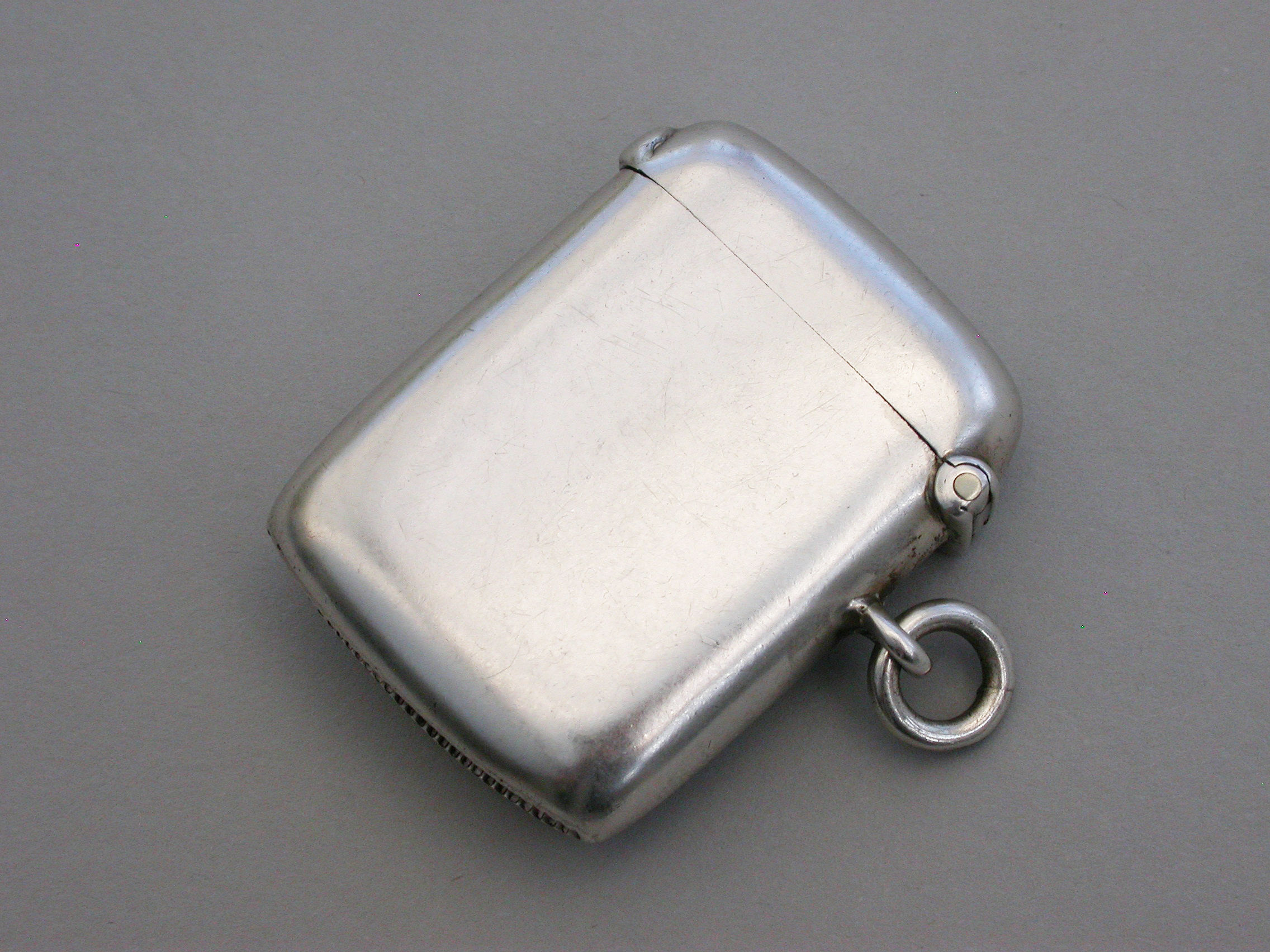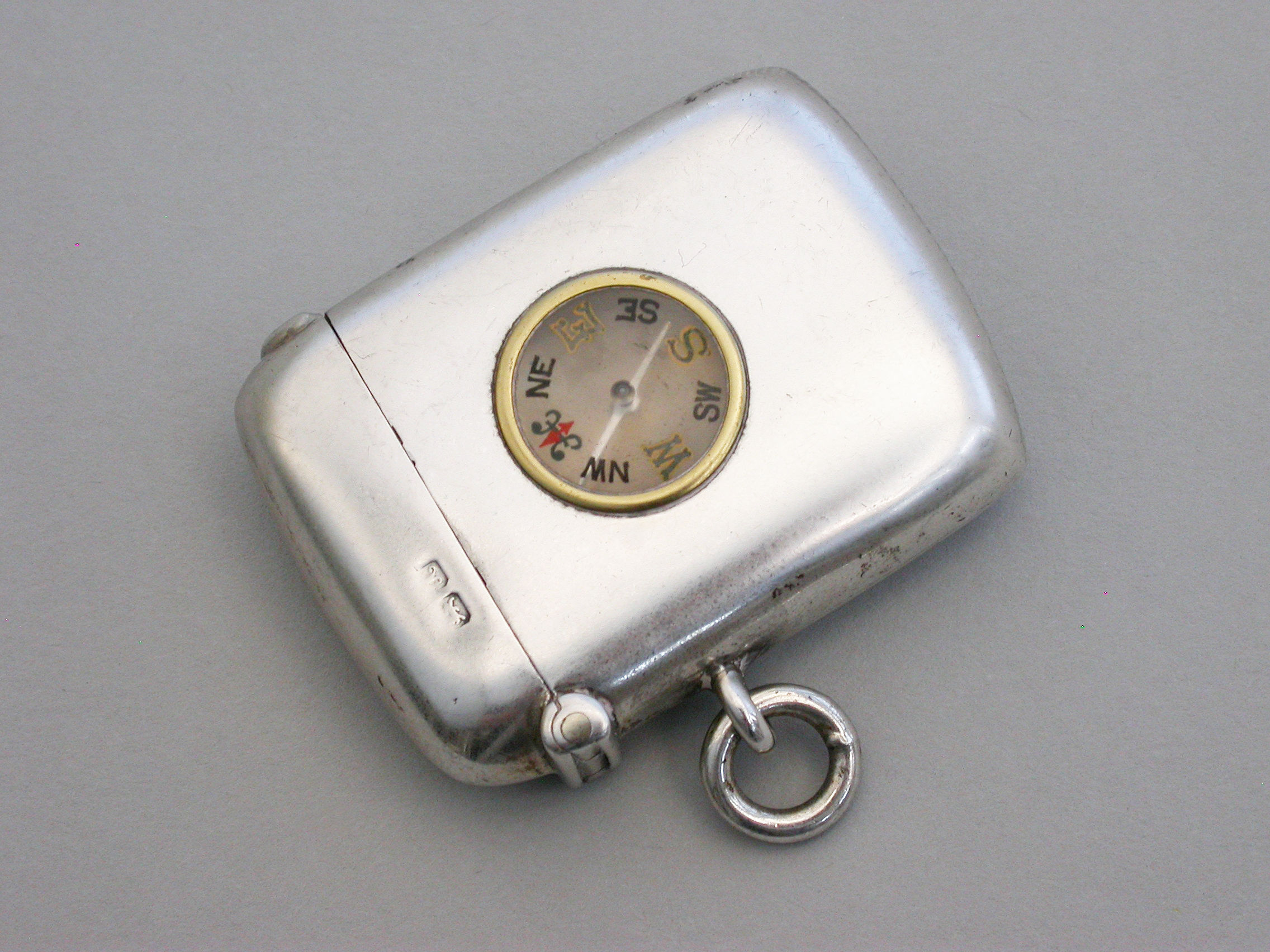 A rare Edwardian silver Vesta Case of plain rounded rectangular form with hinged flip-top lid and attached suspension ring, the face inset with a compass.