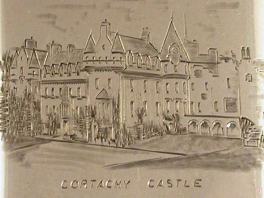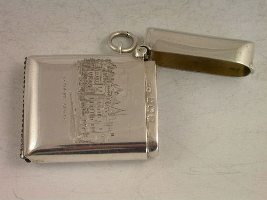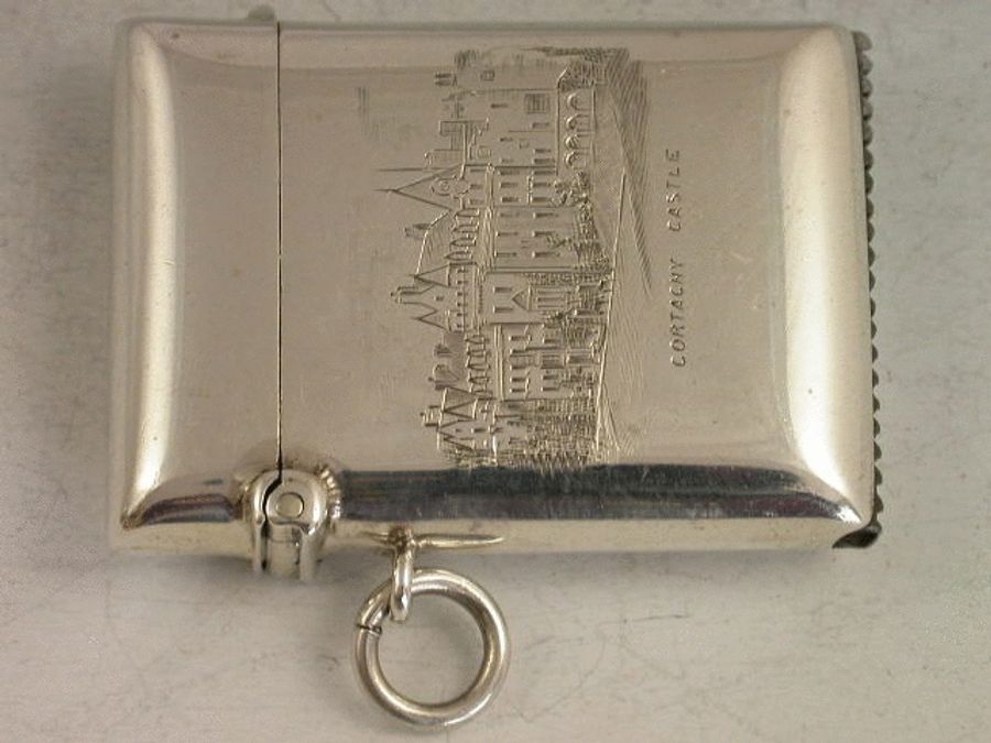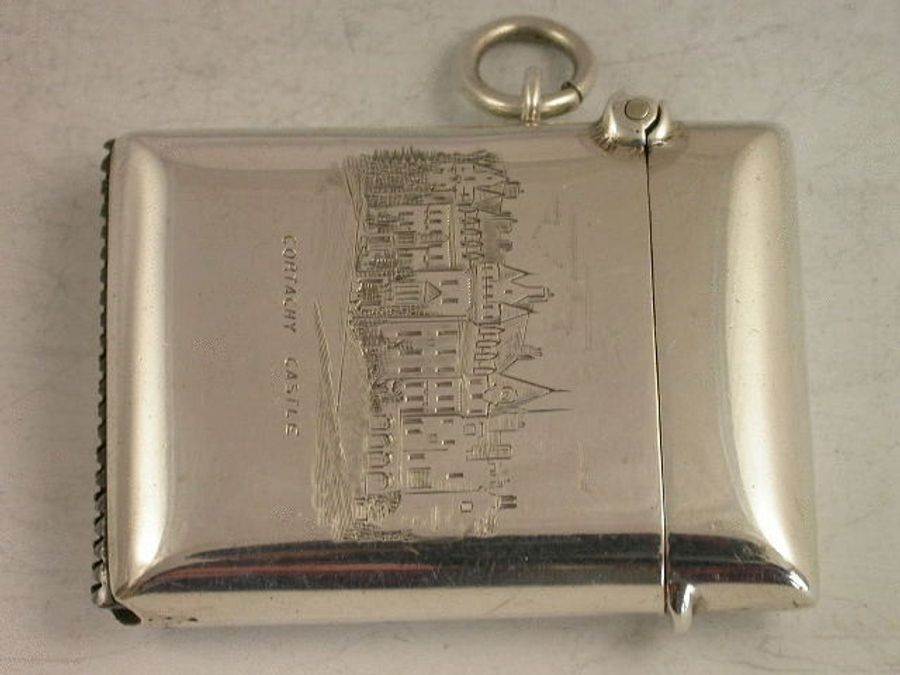 A rare Edwardian silver Vesta Case of plain rounded rectangular form, the front engraved with a view of Cortachy Castle in Scotland.