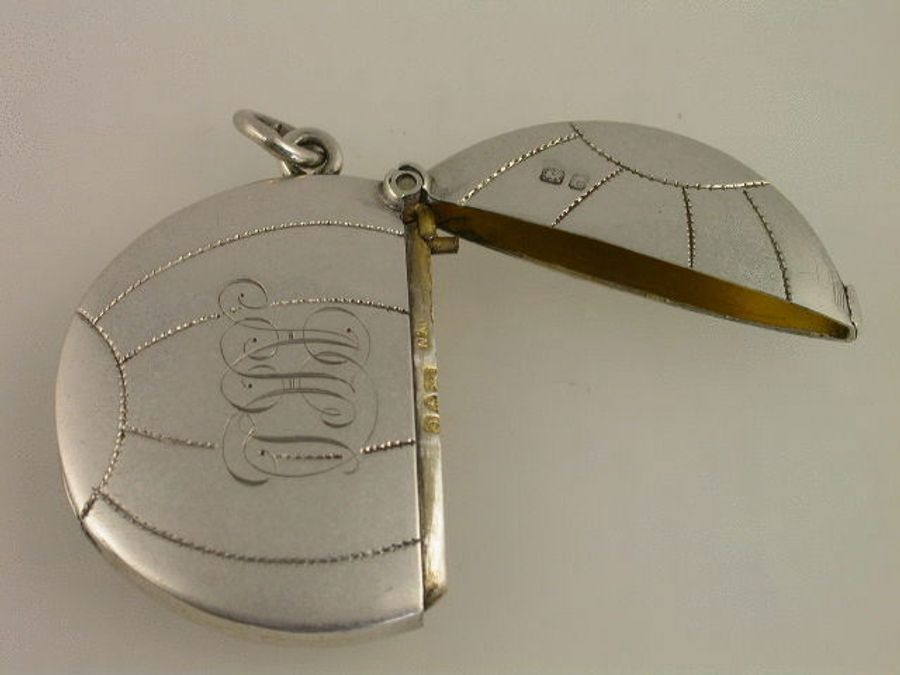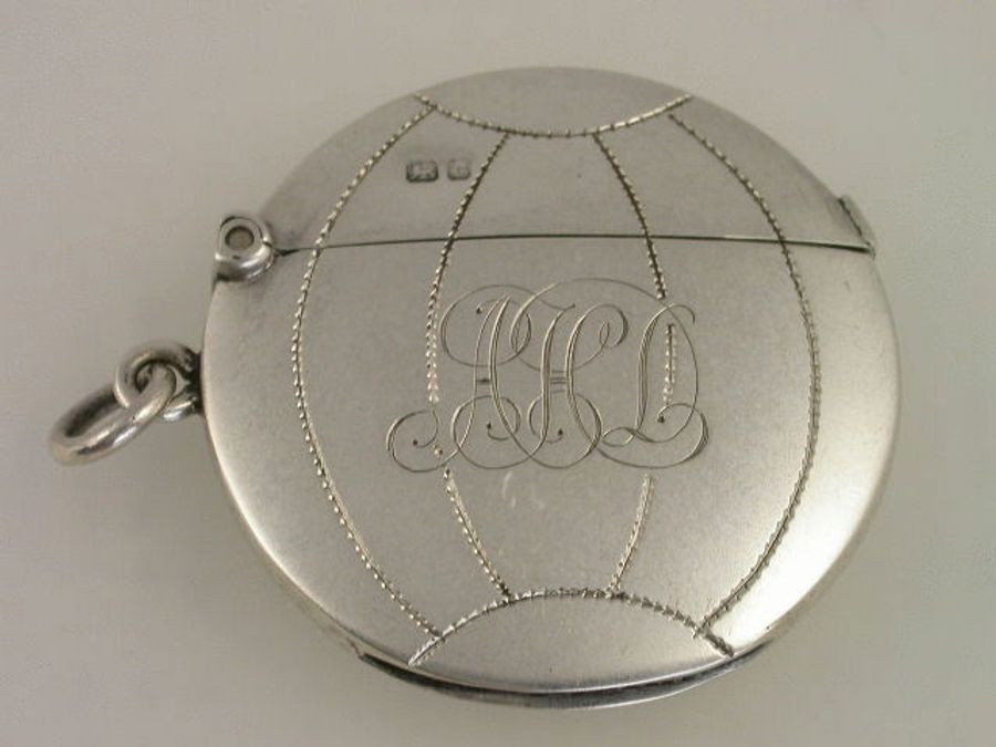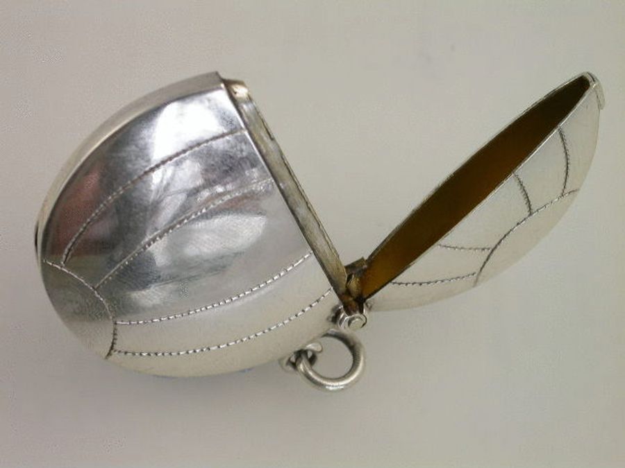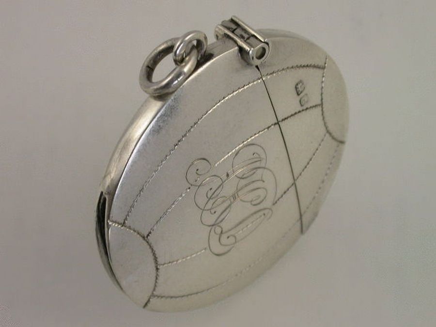 A rare Edwardian silver Novelty Vesta Case modelled in the form of a leather football with engraving to represent the stitching, silver gilt interior, hinged flip top lid and attached suspension ring. The front engraved with initials ‘AHL’ in script.