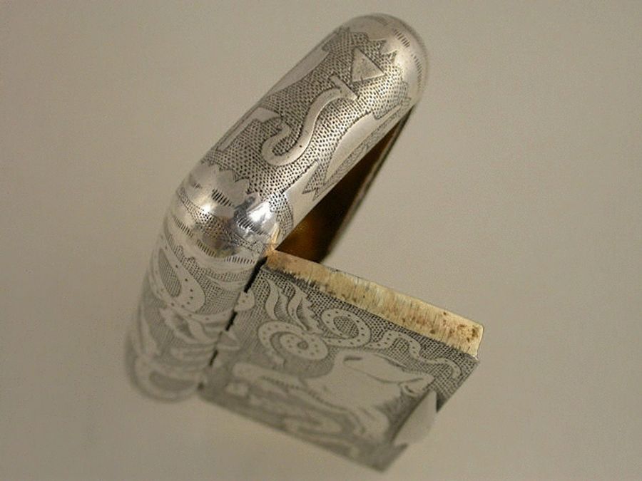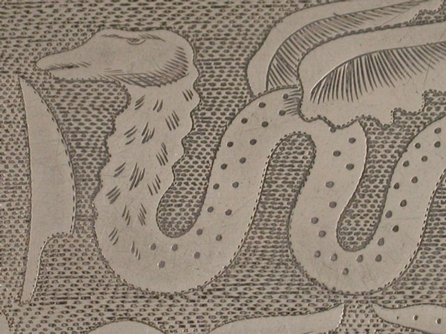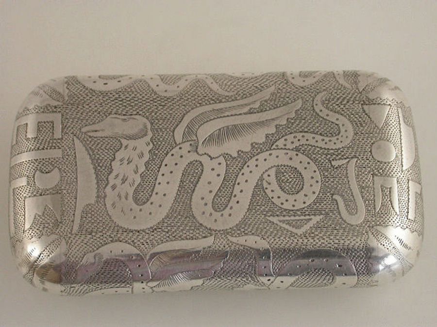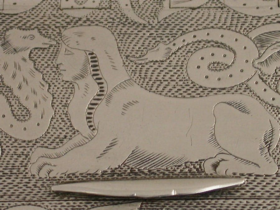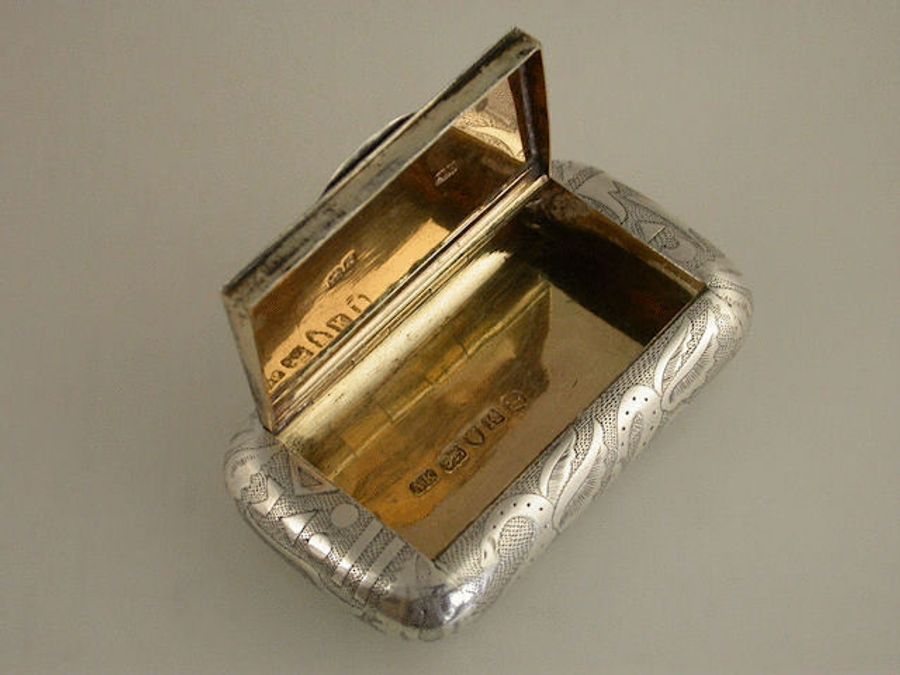 A fine early 19th century silver Snuff Box of rounded rectangular form with concealed flat hinge and raised thumbpiece, all over bright-cut and prick dot engraved with various Egyptian Symbols including a Sphinx and Winged Serpents. Silver gilt interior.