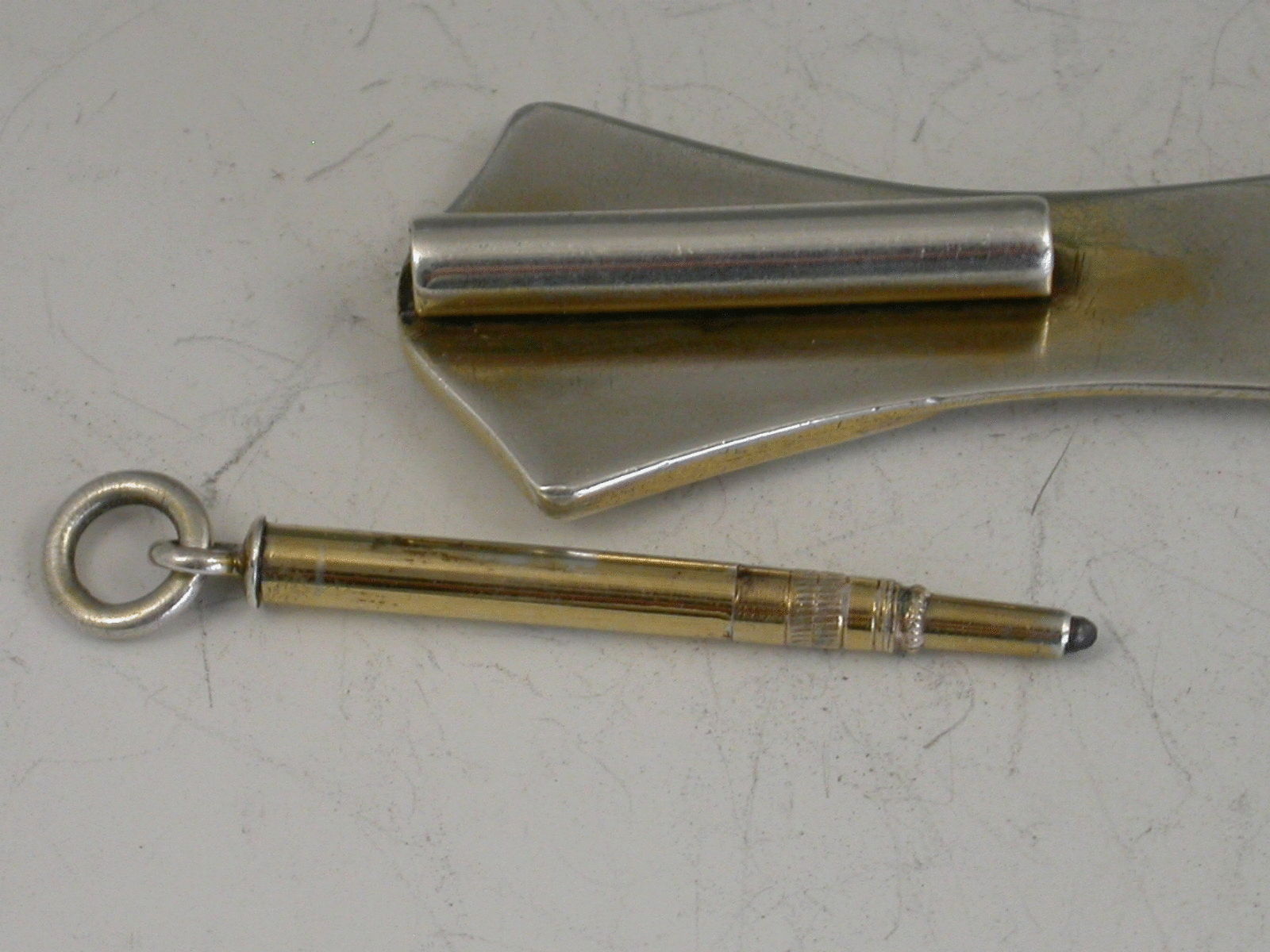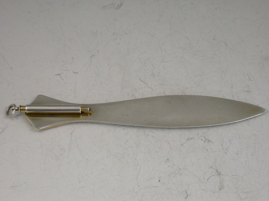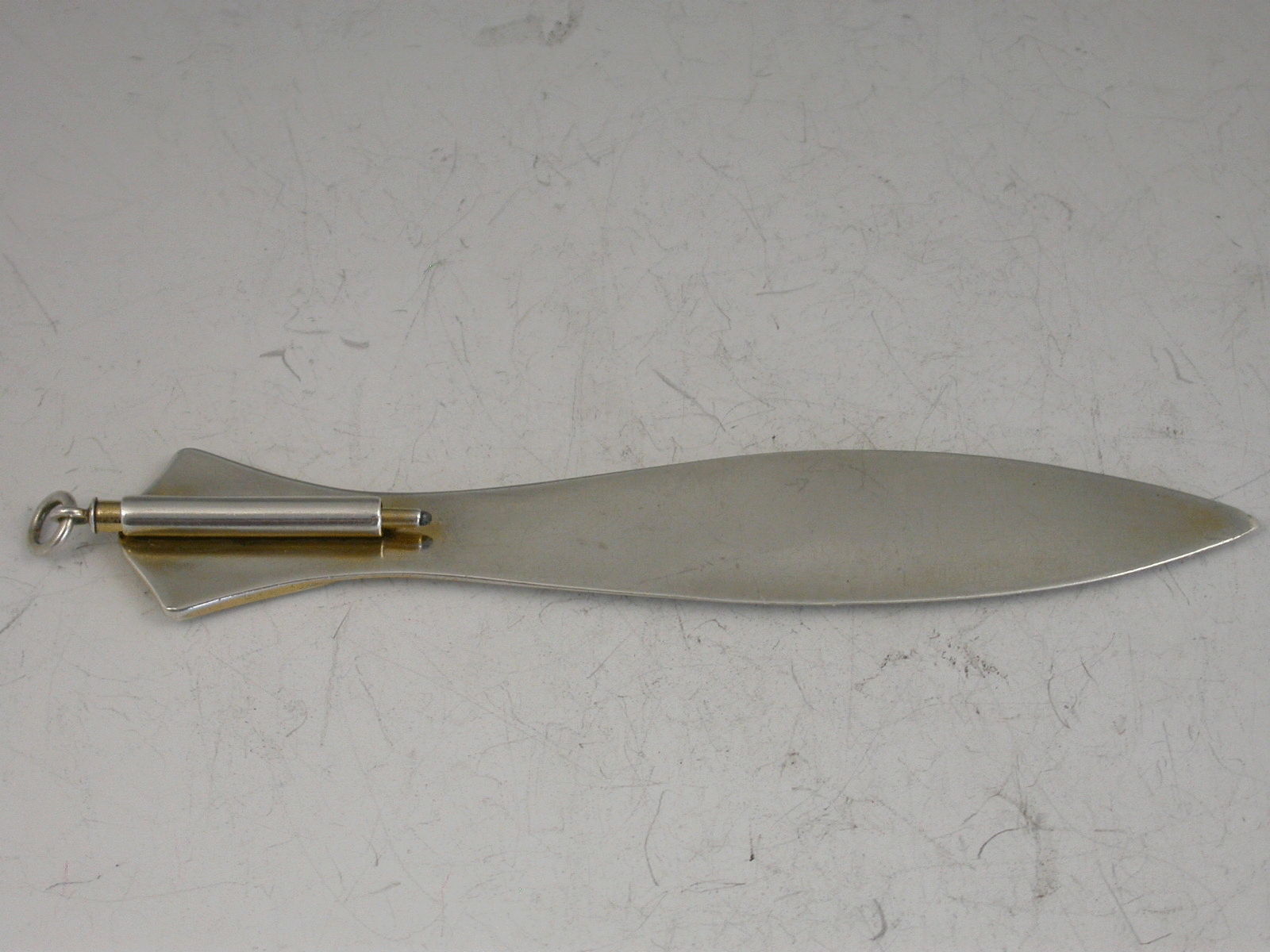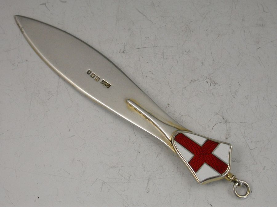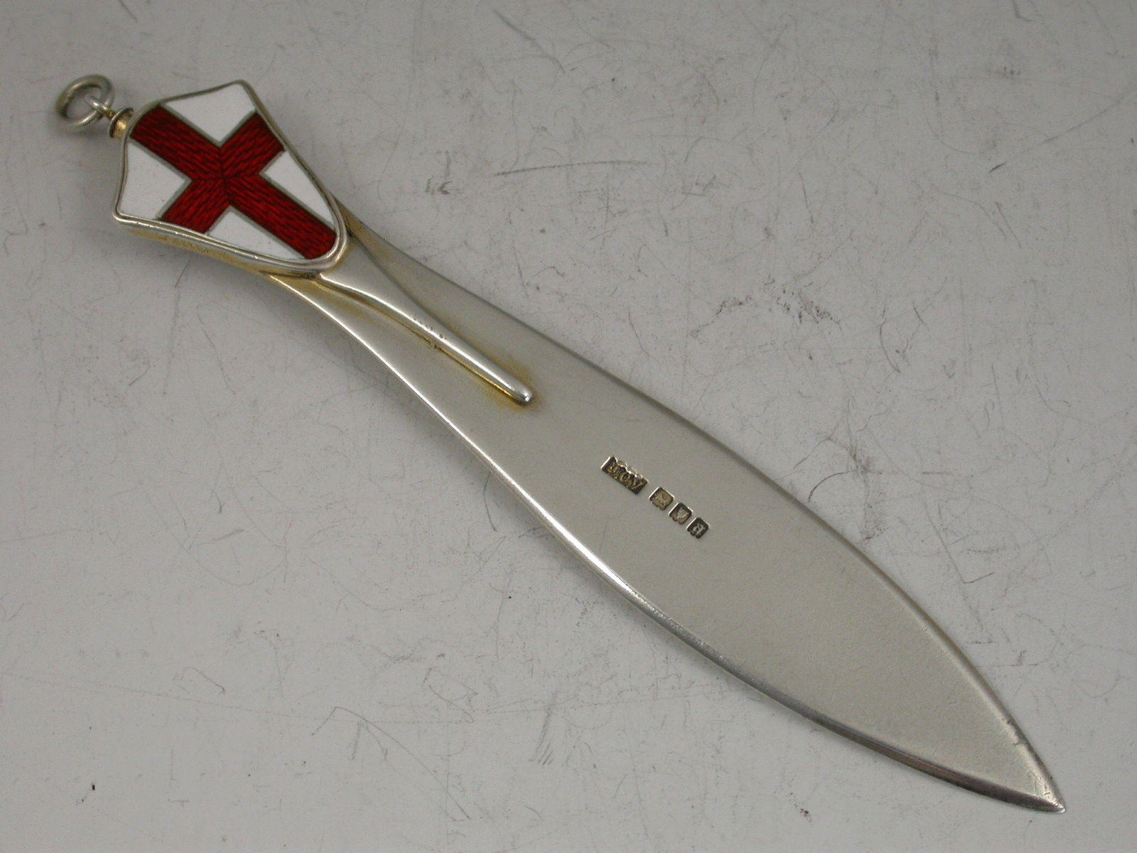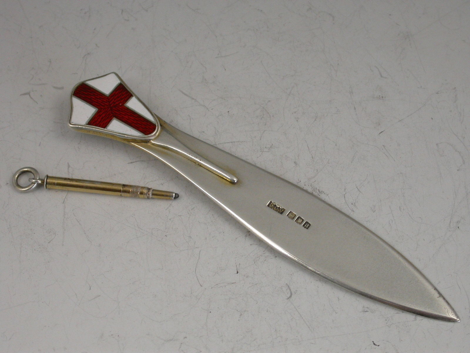 A very fine and rare George V silver Bookmark with dagger shaped blade, the shield shape terminal with enamelled flag of St George, the reverse with attached removable silver gilt propelling pencil.