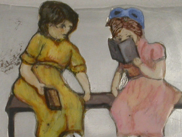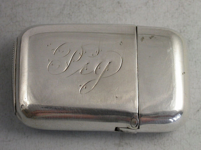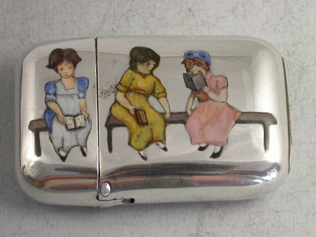 An early 20th century silver Vesta Case of rounded rectangular form with sprung hinged lid, the face enamelled with three young ladies in colourful dresses seated on wooden benches and reading books. The reverse engraved with the script name Pig or Peg.