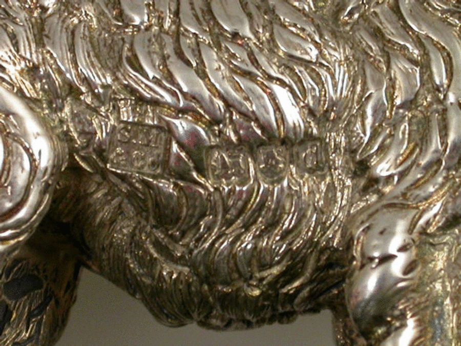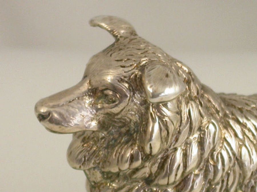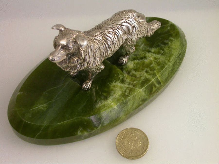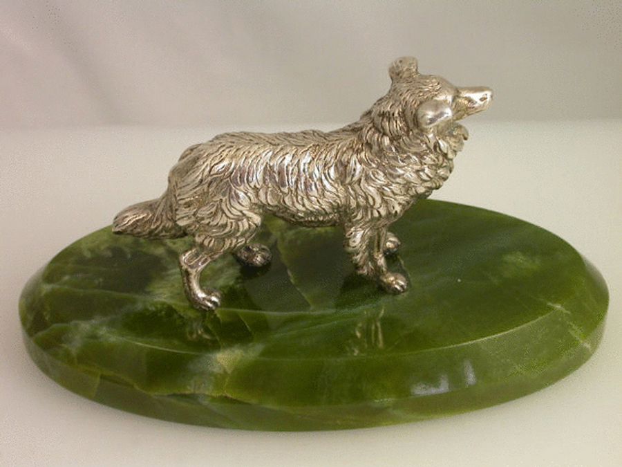 A very fine quality and large Victorian cast silver model of an English Collie Dog standing on an oval green Connemara marble base with bevelled edge. Well modelled and larger than average size.