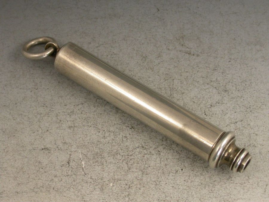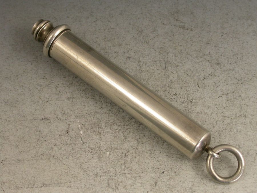 An unusually large Victorian silver telescopic Propelling Pencil with plain cylindrical barrel and attached suspension ring, the two drawer extensions engraved with calibrations for a three an a half inch ruler. Stamped W Thornhill & Co.