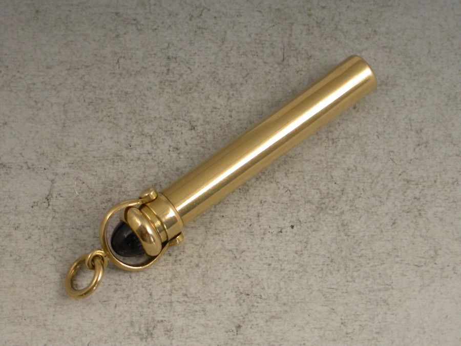 A very fine quality Edwardian 18 carat gold telescopic Propelling Pencil, with Cabochon Amethyst terminal, contained within its own cylindrical sheath with attached stirrup and suspension ring .