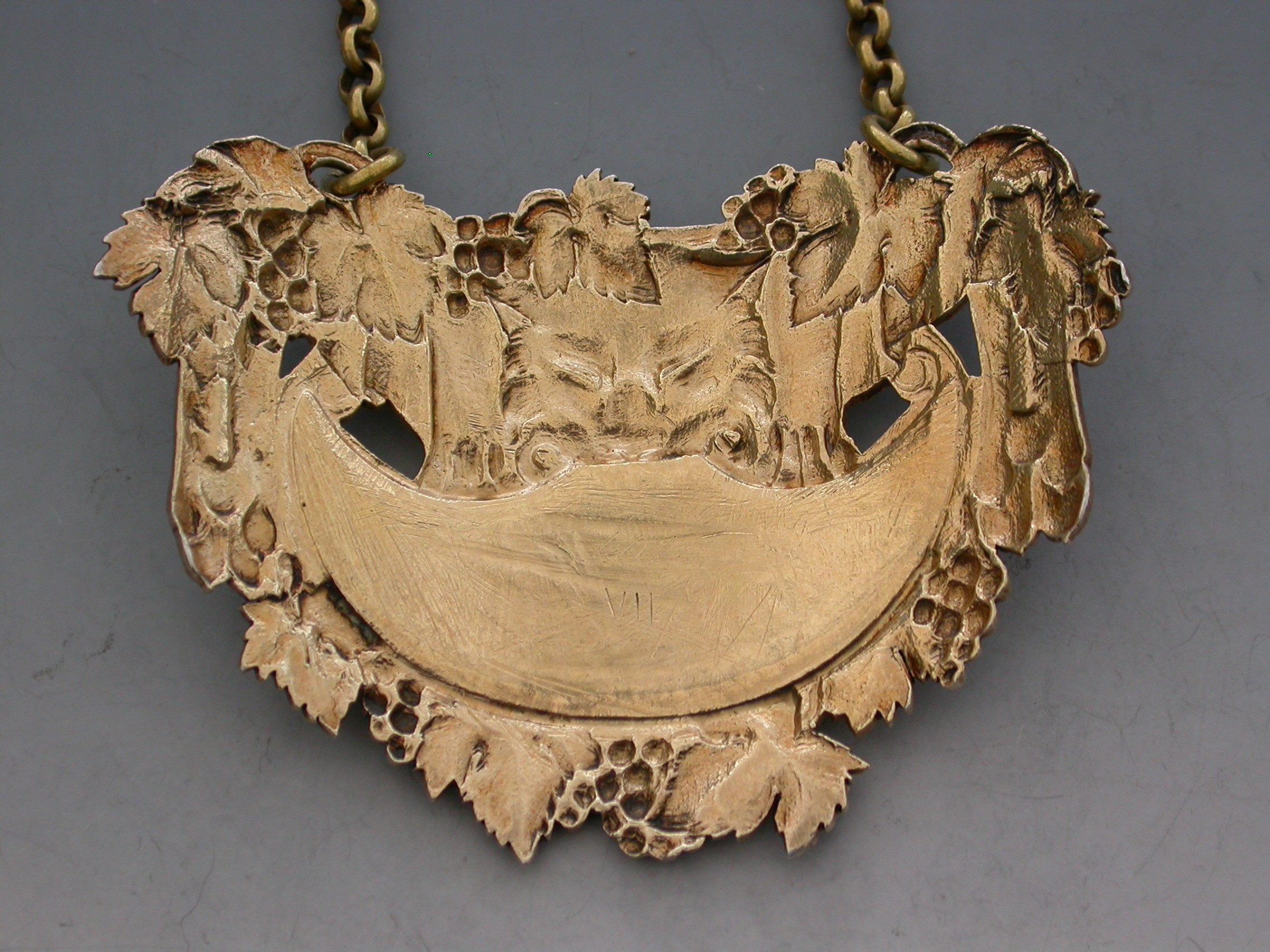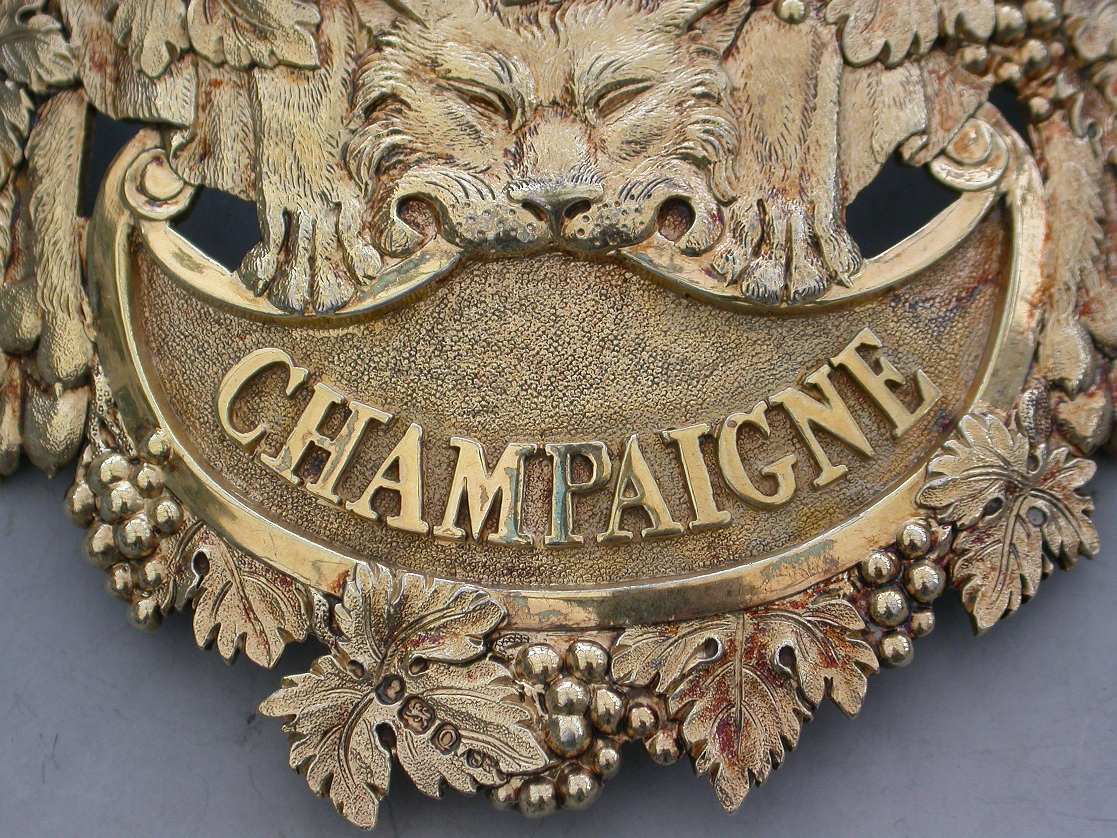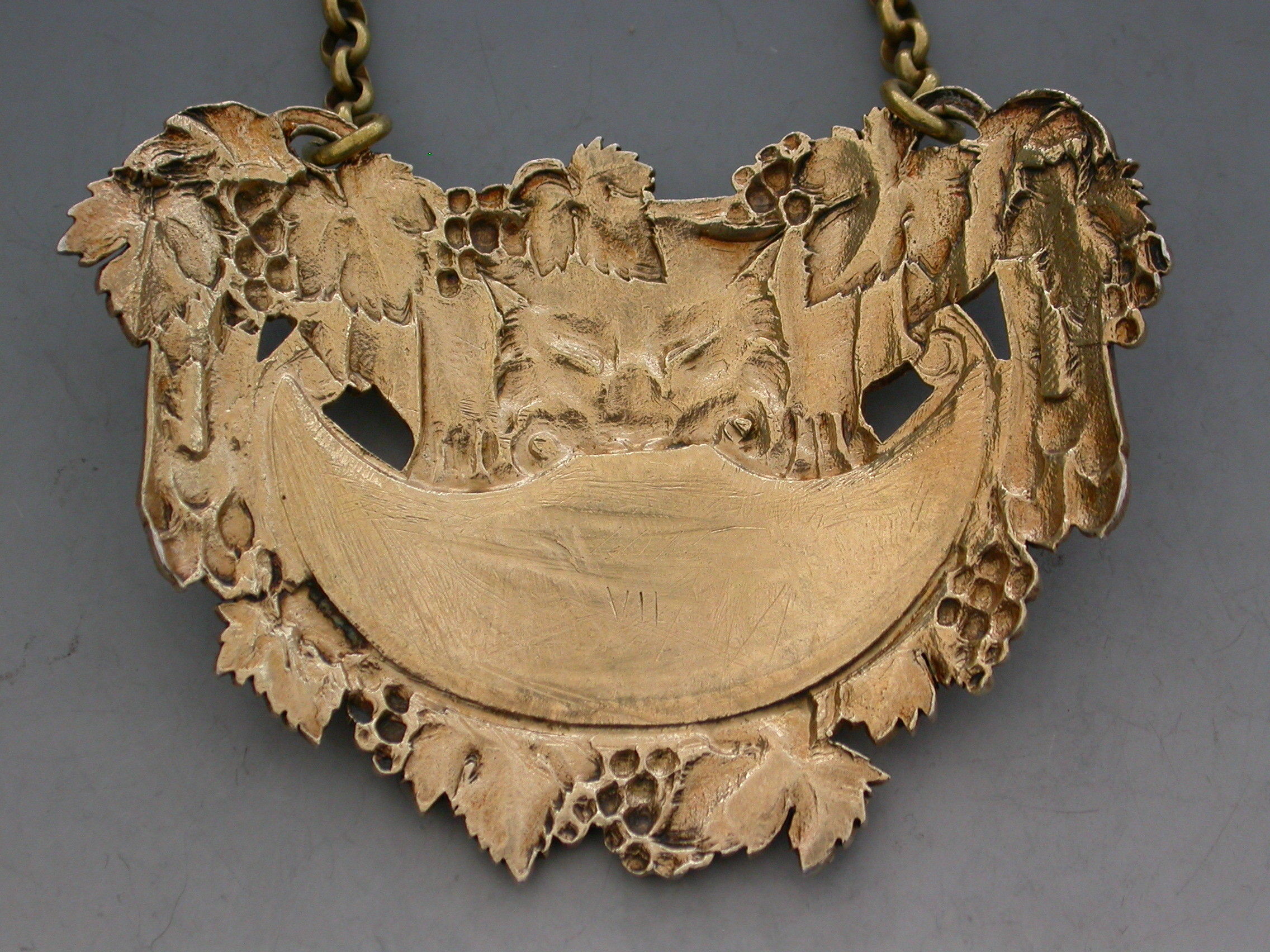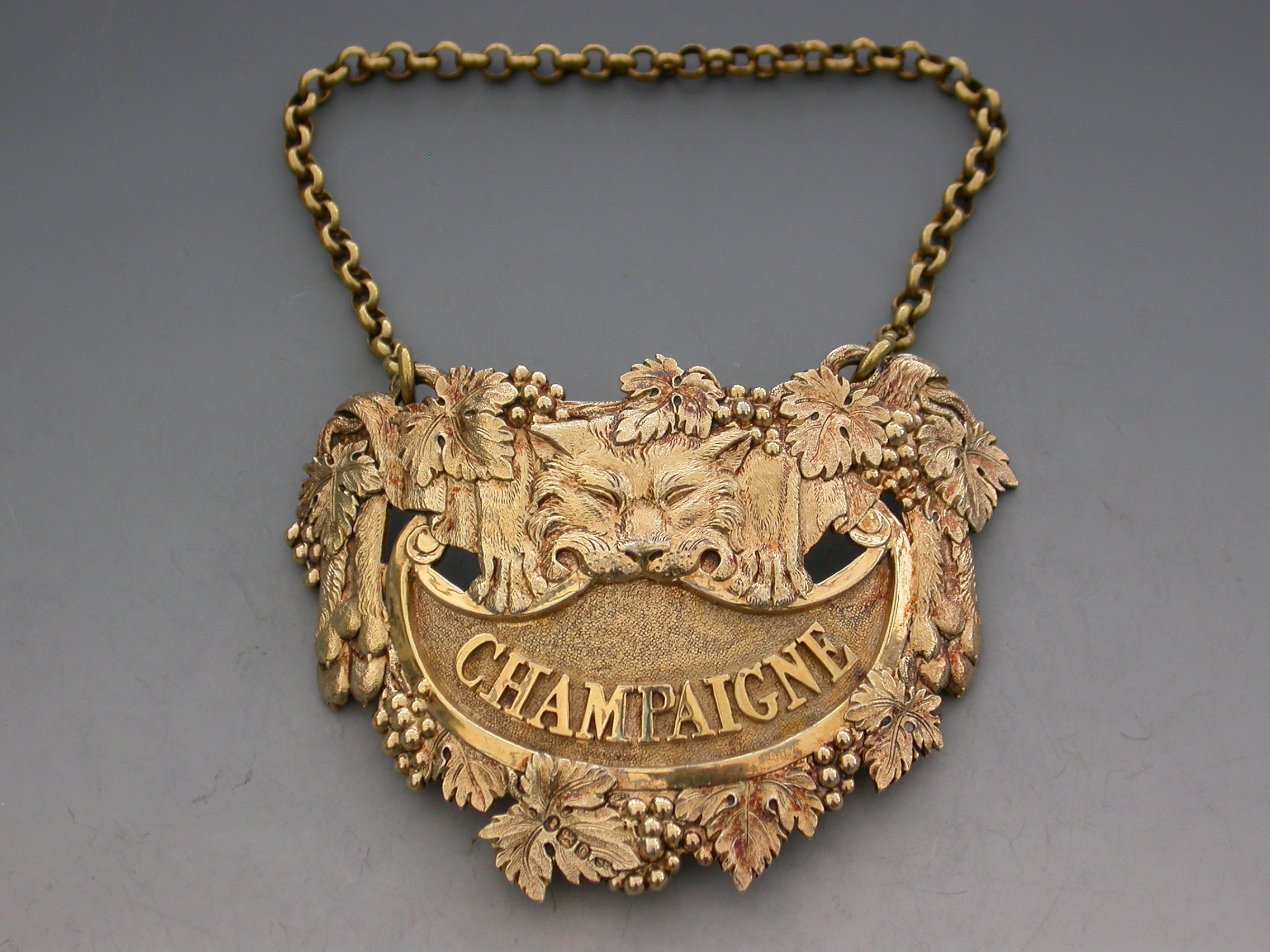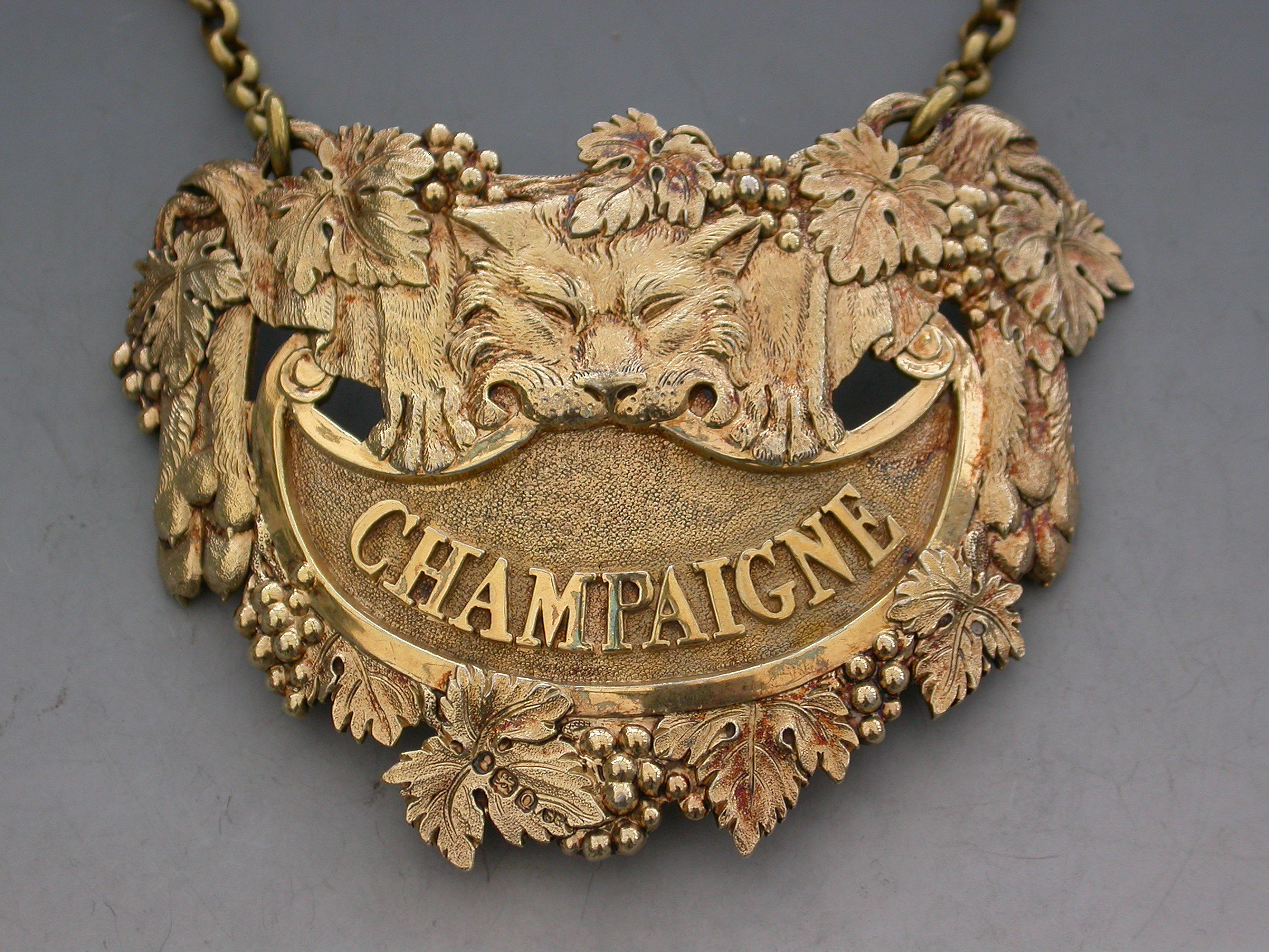 A very fine George III cast silver gilt Wine Label, the design known as the ""Leopards Pelt"", of cartouche form with vine leaf and grape surround, a leopards skin with head and paws draped over the peaked crescent shaped name plate with raised letters for Champaigne on a matt background. Complete with large heavy gauge suspension chain. The larger of the two known sizes of this design.