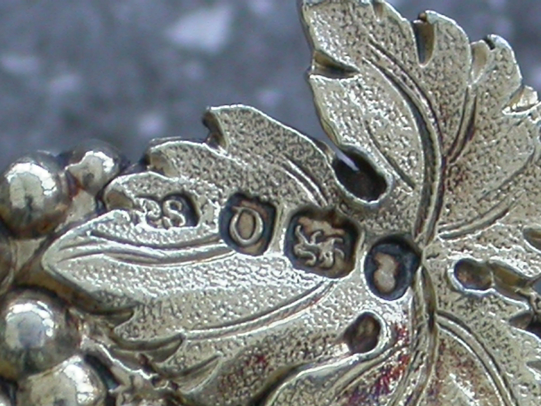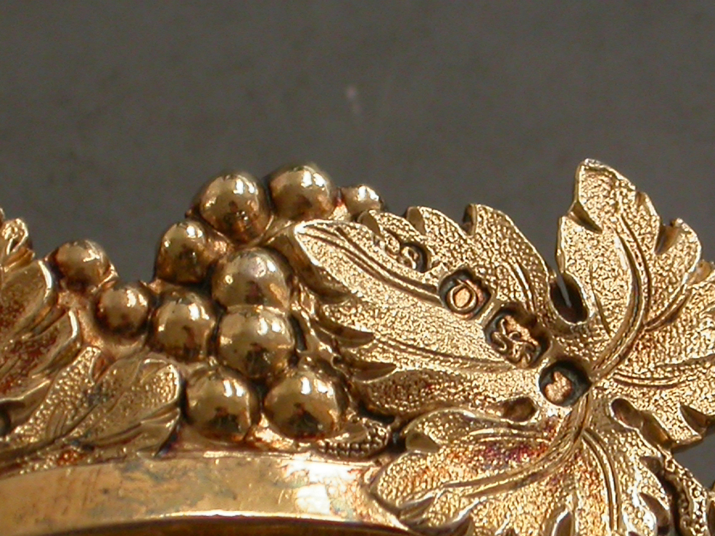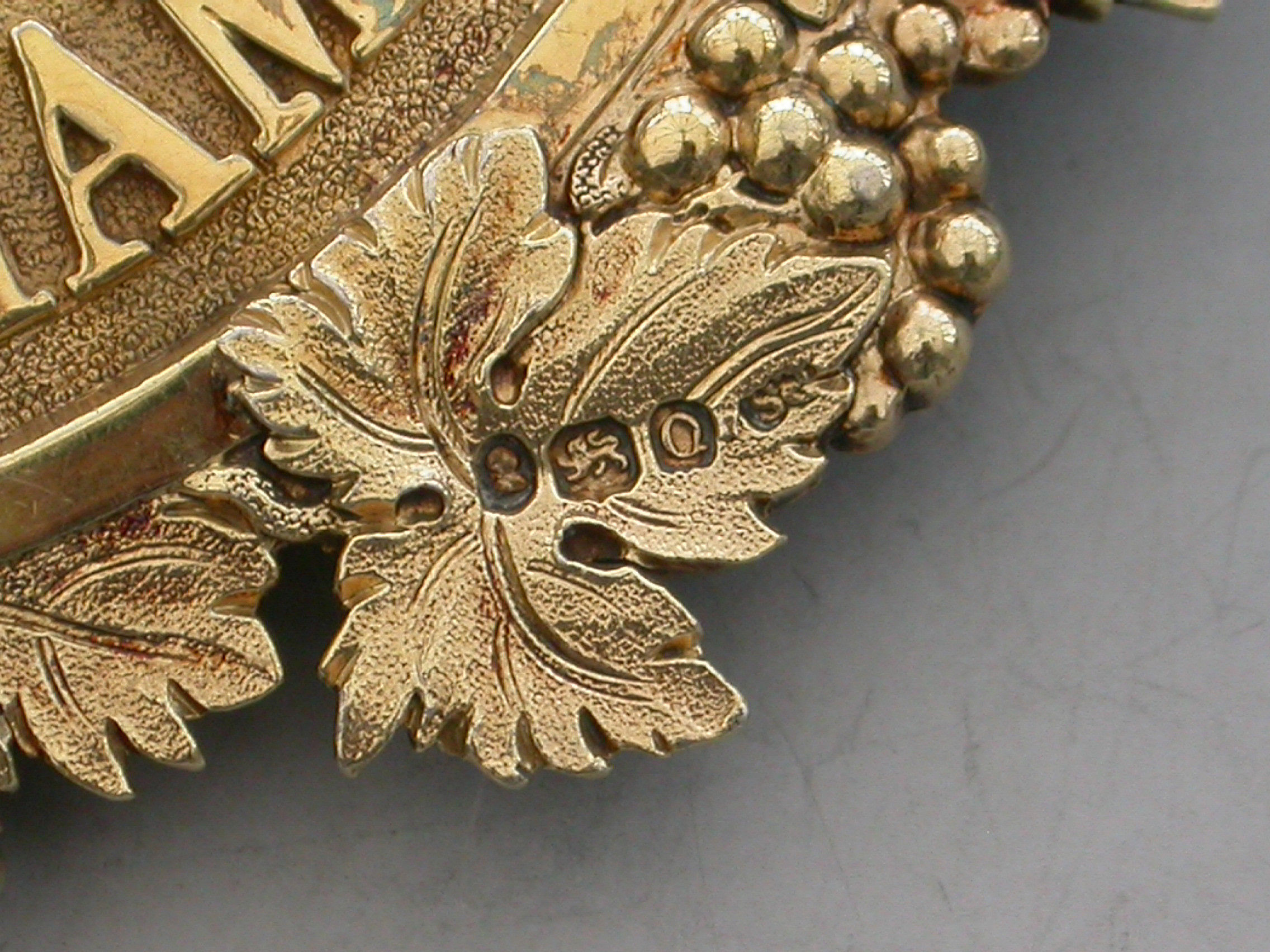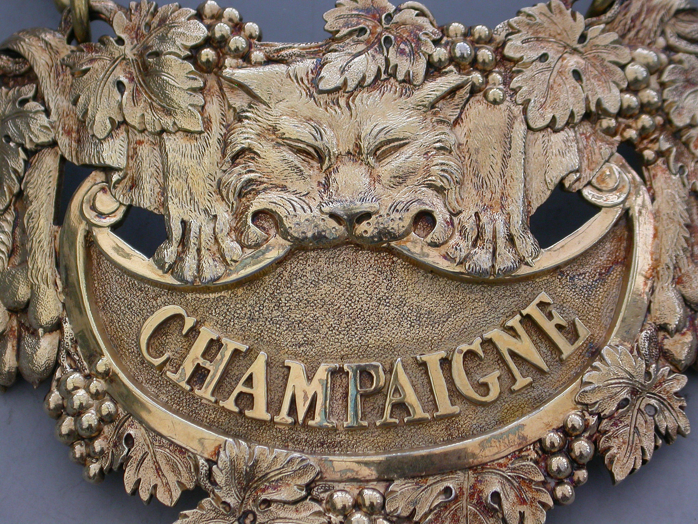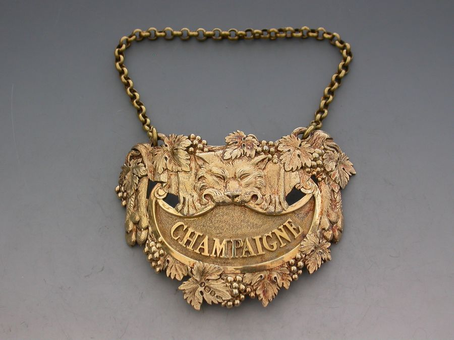 A very fine George III cast silver gilt Wine Label, the design known as the ""Leopards Pelt"", of cartouche form with vine leaf and grape surround, a leopards skin with head and paws draped over the peaked crescent shaped name plate with raised letters for Champaigne on a matt background. Complete with large heavy gauge suspension chain. The larger of the two known sizes of this design.