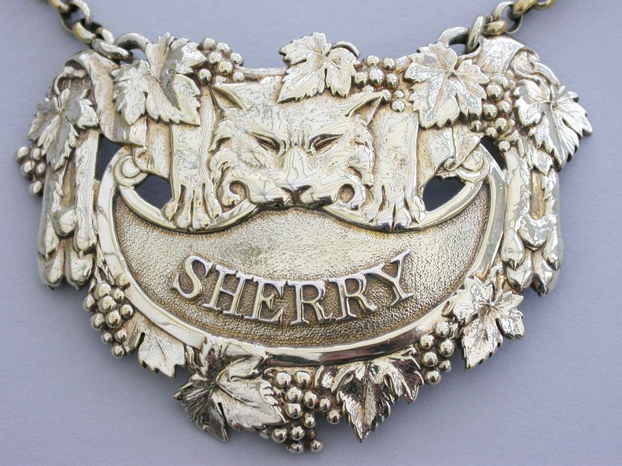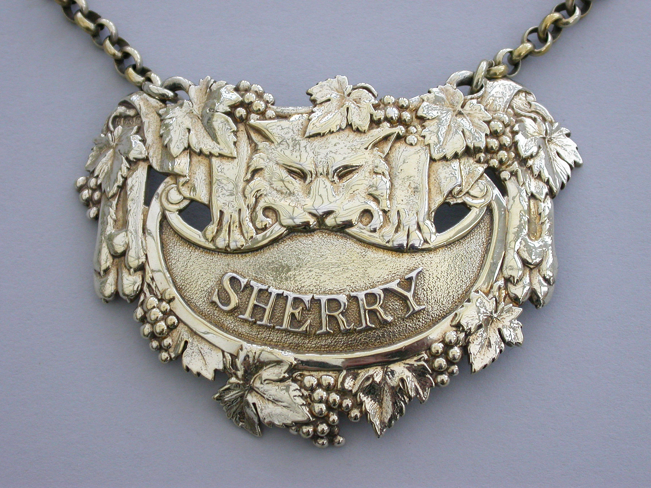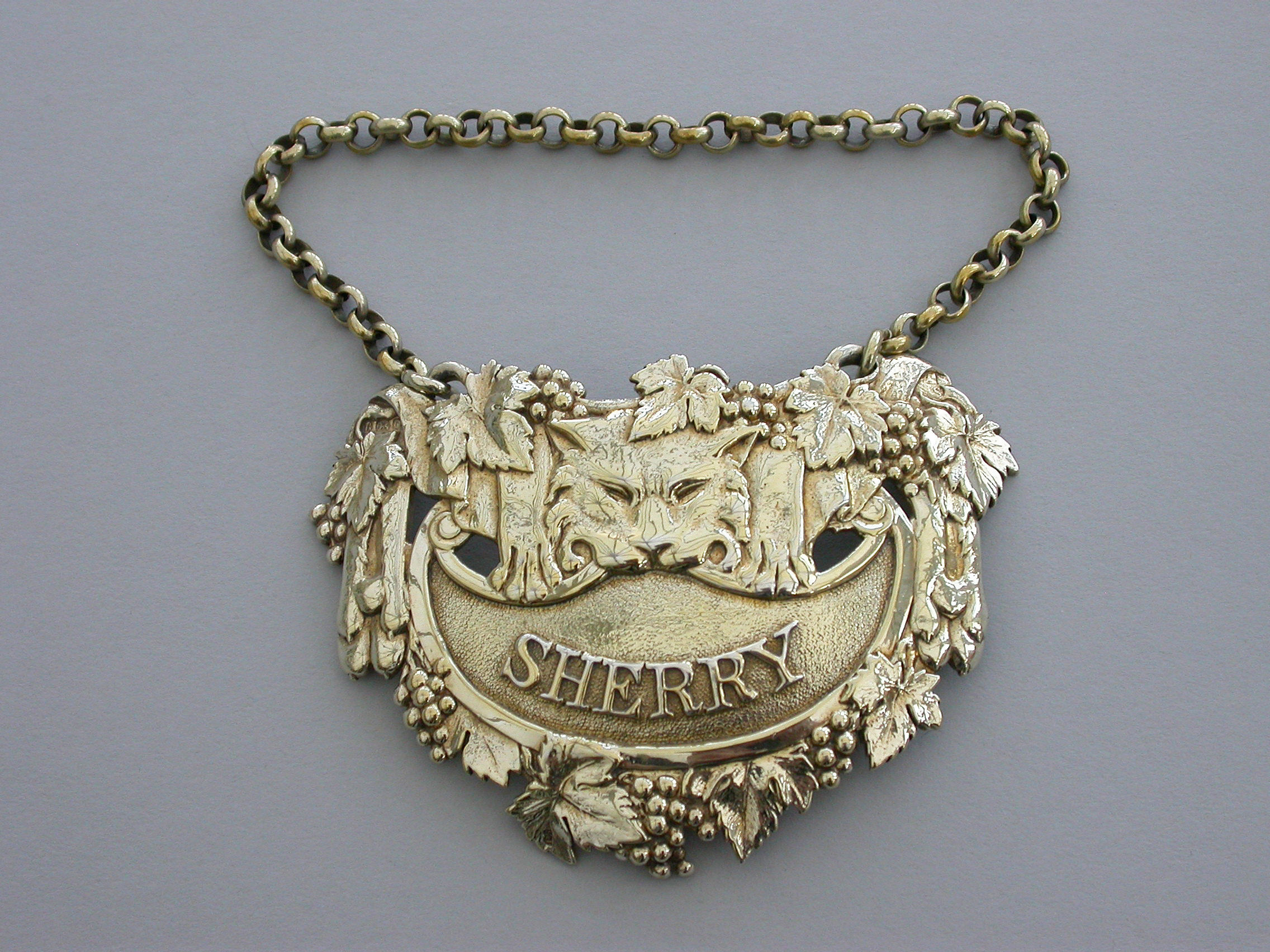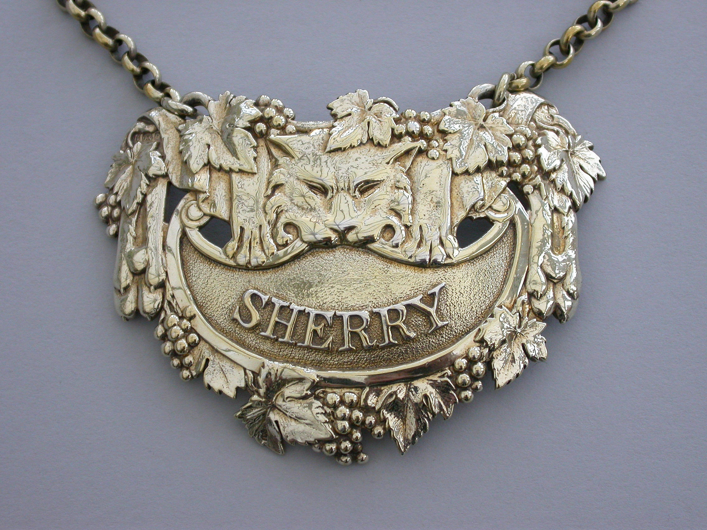 A very fine George III cast silver gilt Wine Label, the design known as the ""Leopards Pelt"", of cartouche form with vine leaf and grape surround, a leopards skin with head and paws draped over the peaked crescent shaped name plate with raised letters for Sherry on a matt background. Complete with large heavy gauge suspension chain.
