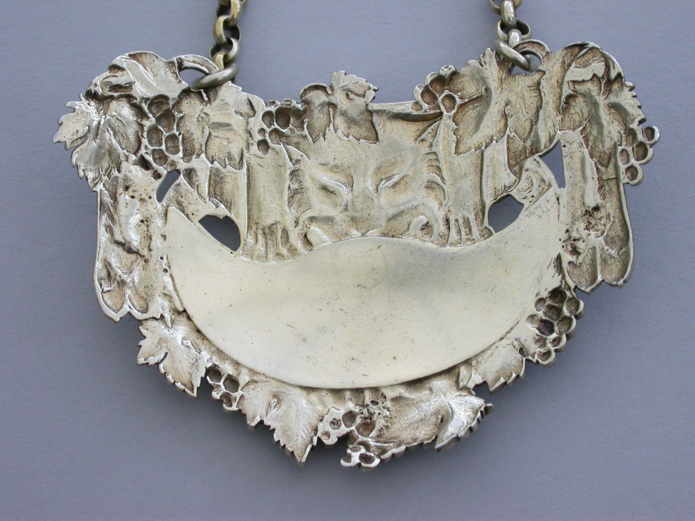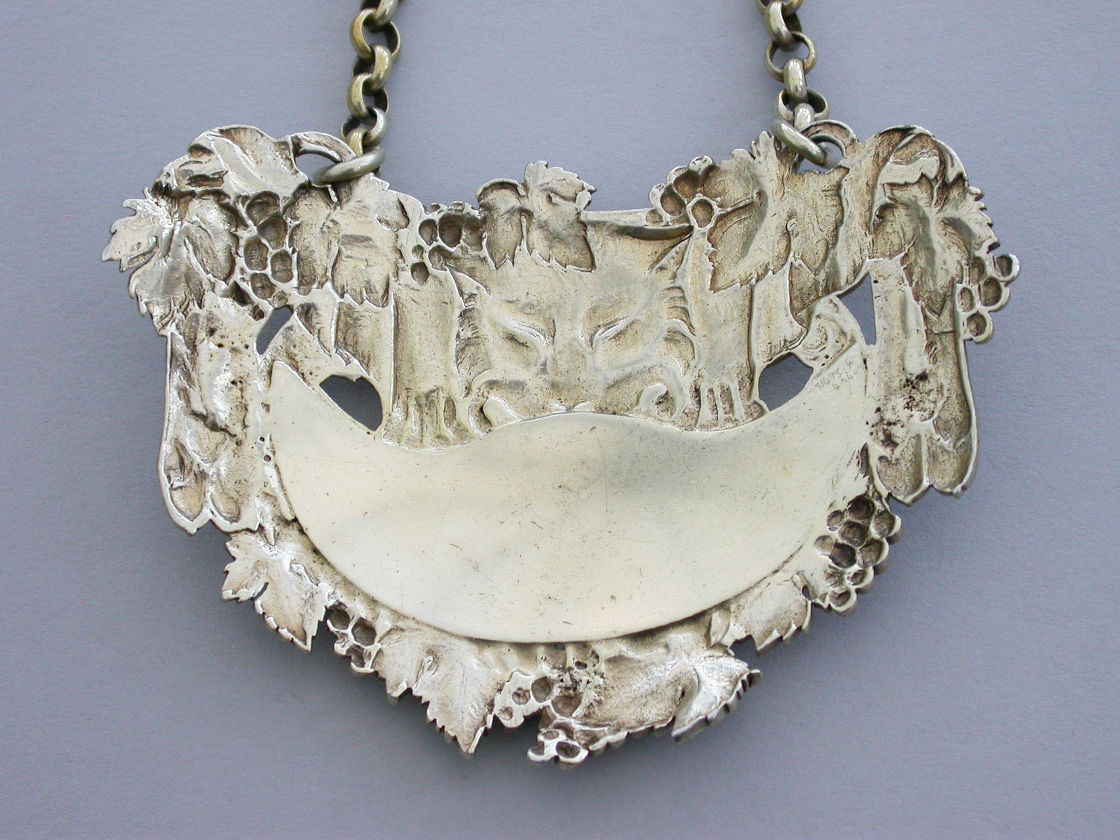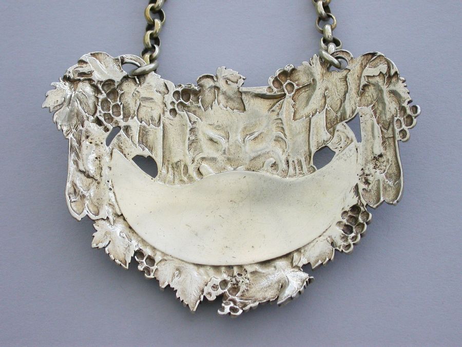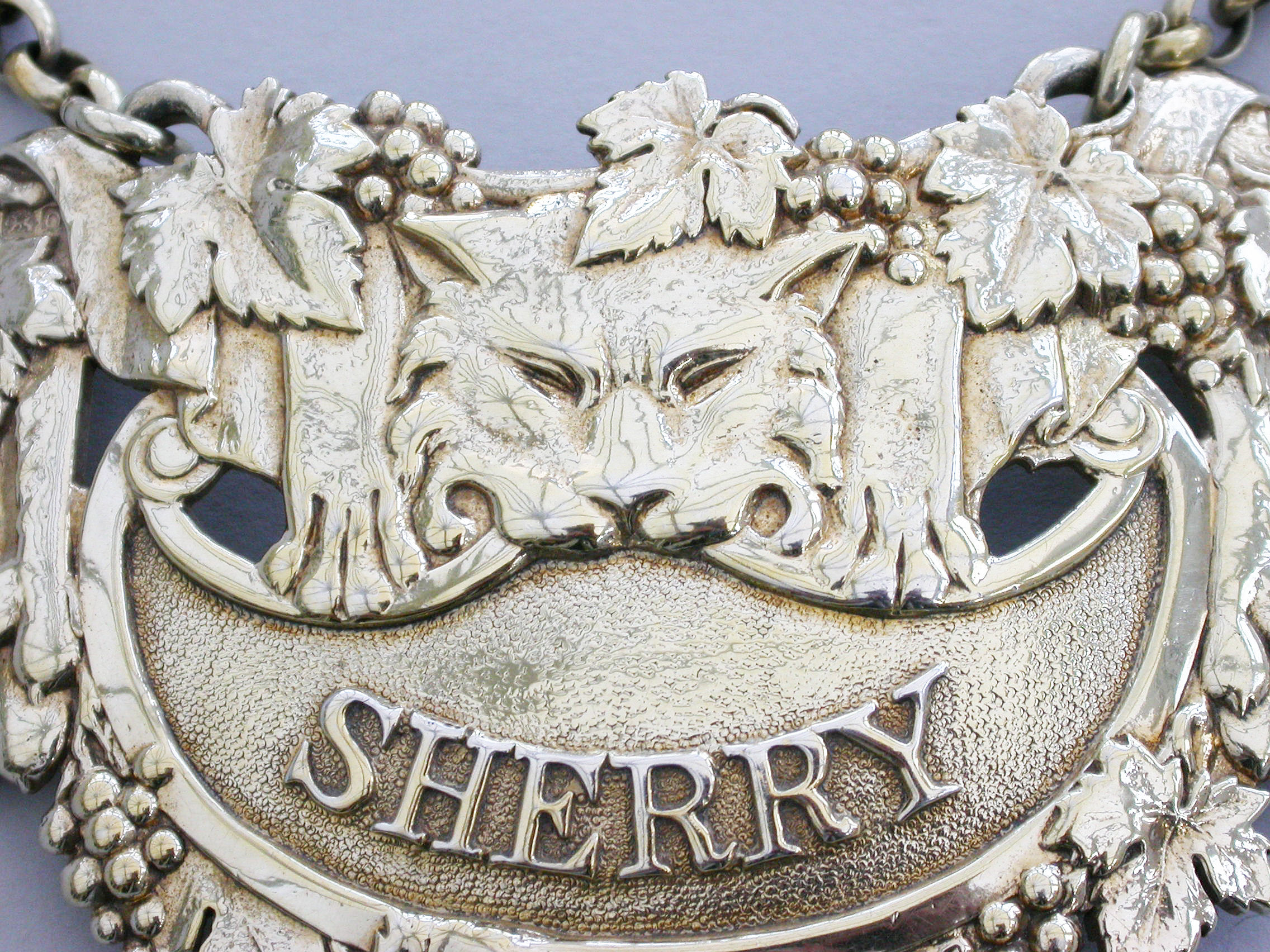 A very fine George III cast silver gilt Wine Label, the design known as the ""Leopards Pelt"", of cartouche form with vine leaf and grape surround, a leopards skin with head and paws draped over the peaked crescent shaped name plate with raised letters for Sherry on a matt background. Complete with large heavy gauge suspension chain.