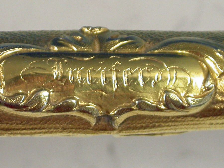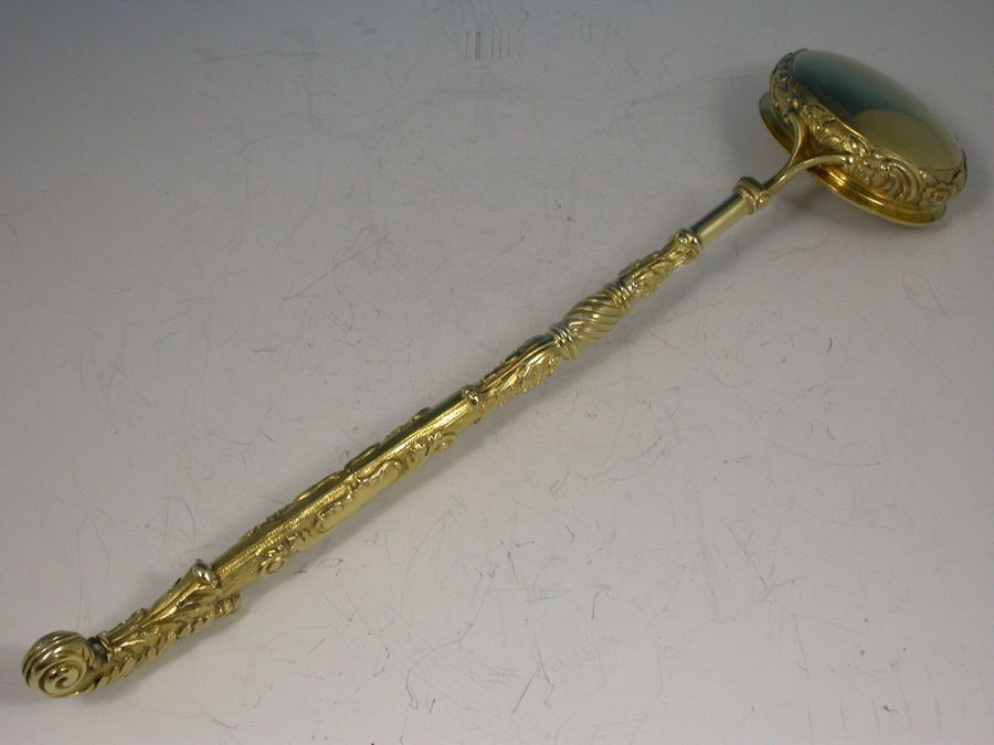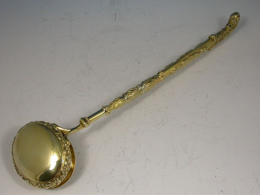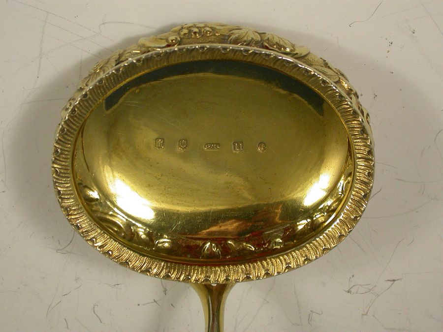 A very fine quality George III Presentation silver gilt Punch Ladle, the oval bowl with an everted gadrooned rim and chased with flowers, foliage and grapes on a matt background, the similarly ornate handle chased with scrolls and acanthus leaves with a leaf capped curled terminal, an oval cartouche surrounded by scrolls and engraved ""LUCIFER"".