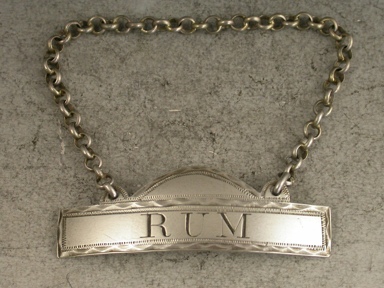 A very fine and rare George III Provincial silver Wine Label of narrow rectangular form with domed surmount and raised eyelets, bright-cut engraved and wriggle work decoration, incised for Rum.