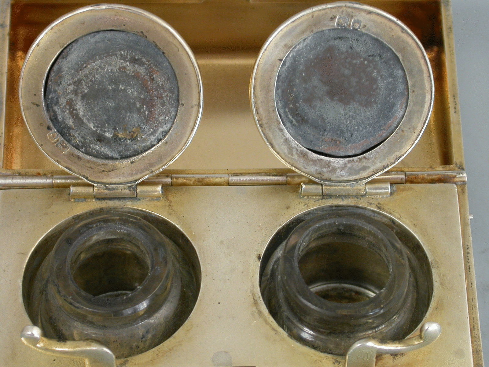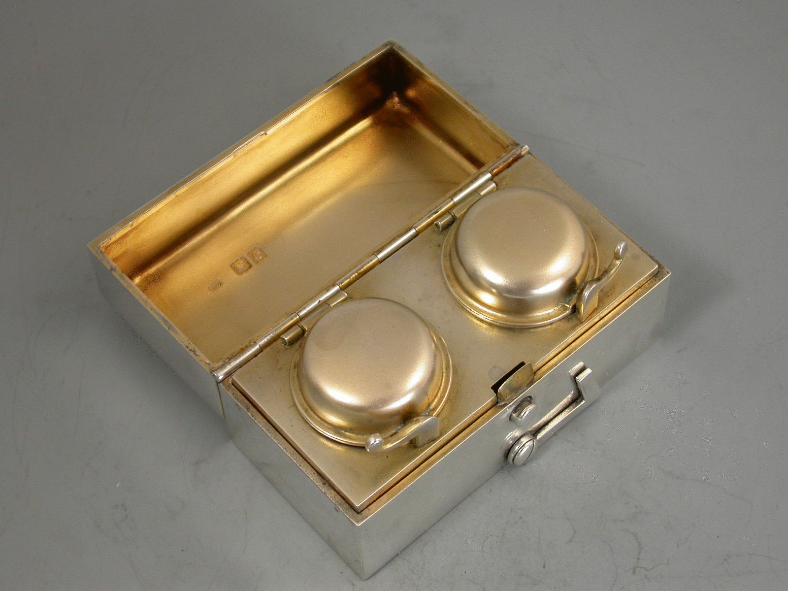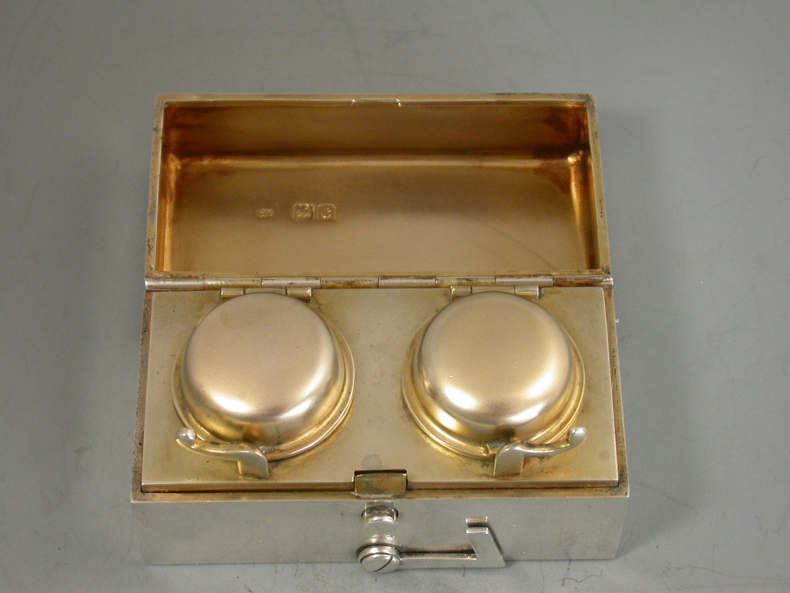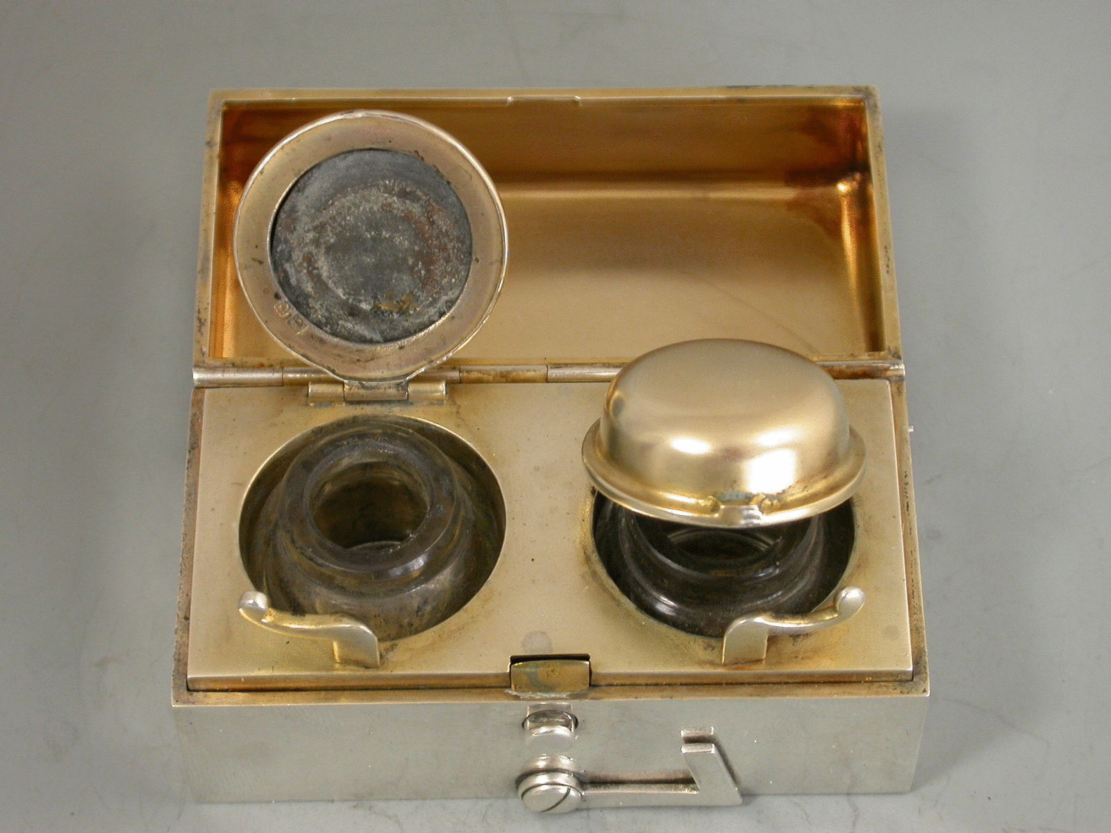 A good quality Victorian silver Travelling double Inkwell of plain oblong form with slightly bevelled cover, operated by a button release secured by a hooked catch, the gilt interior fitted with two ink wells each with a sprung cover operated by a small lever.