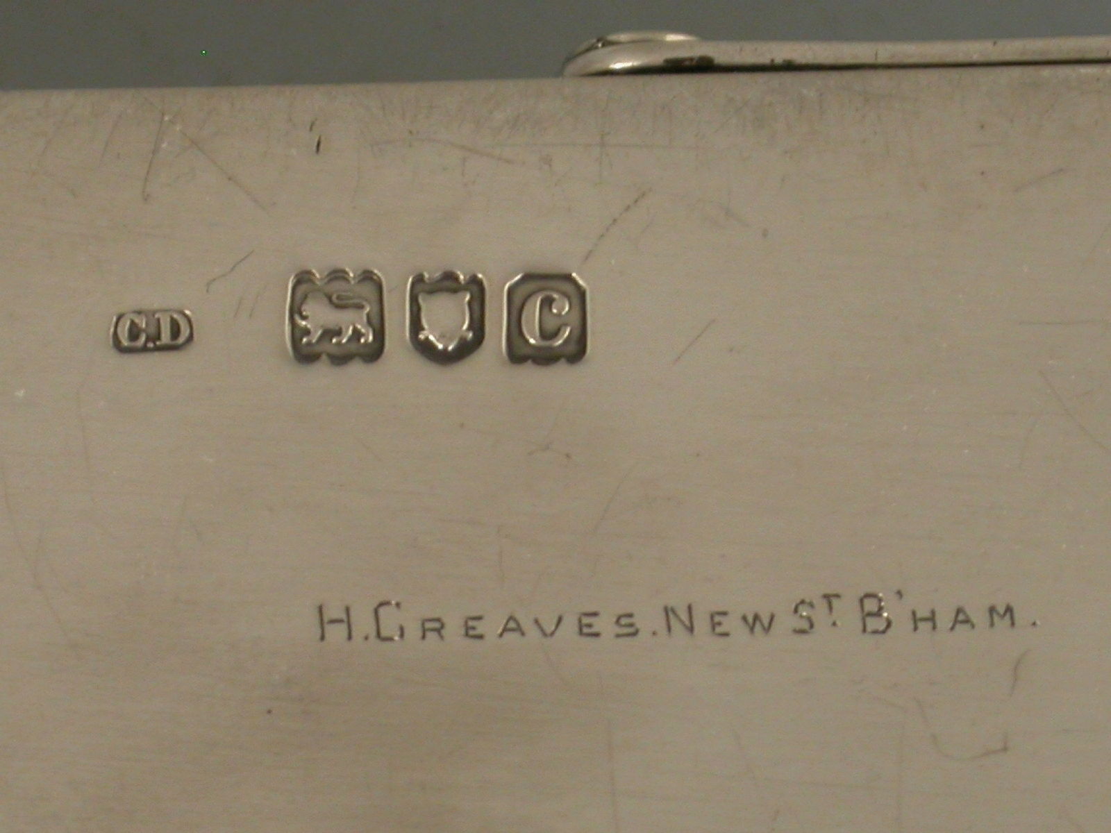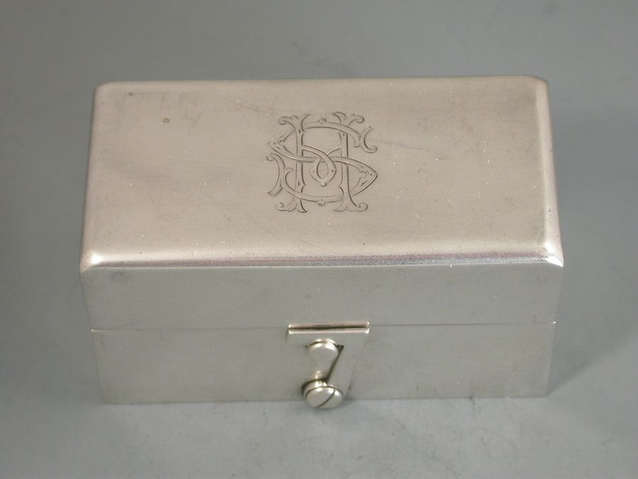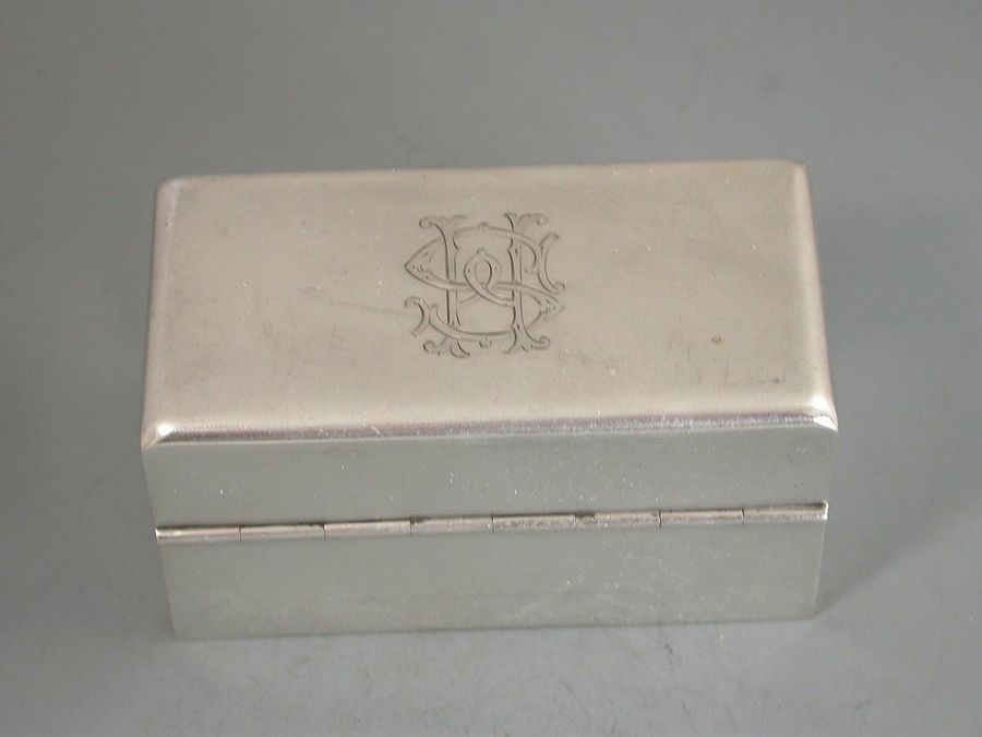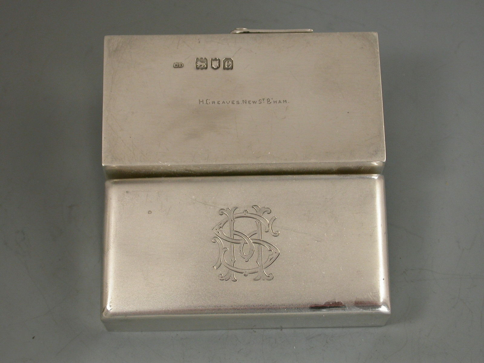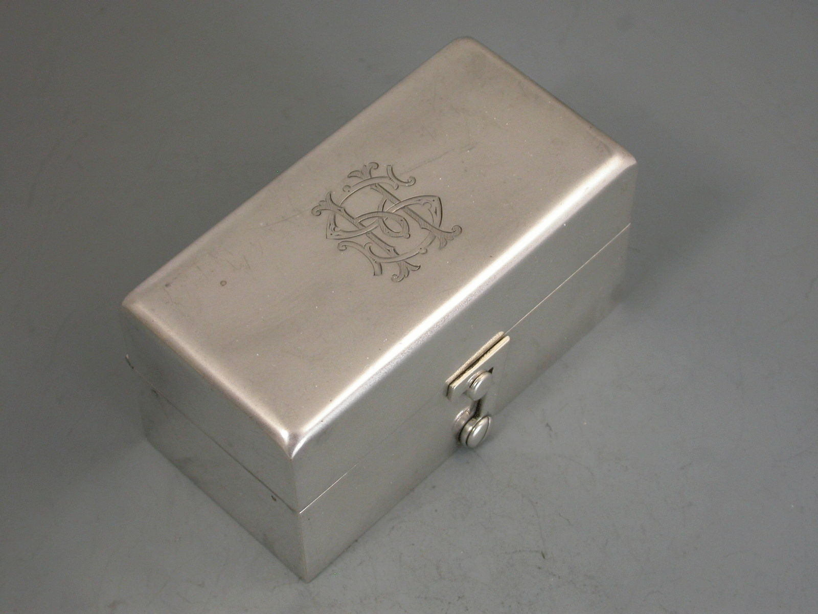 A good quality Victorian silver Travelling double Inkwell of plain oblong form with slightly bevelled cover, operated by a button release secured by a hooked catch, the gilt interior fitted with two ink wells each with a sprung cover operated by a small lever.