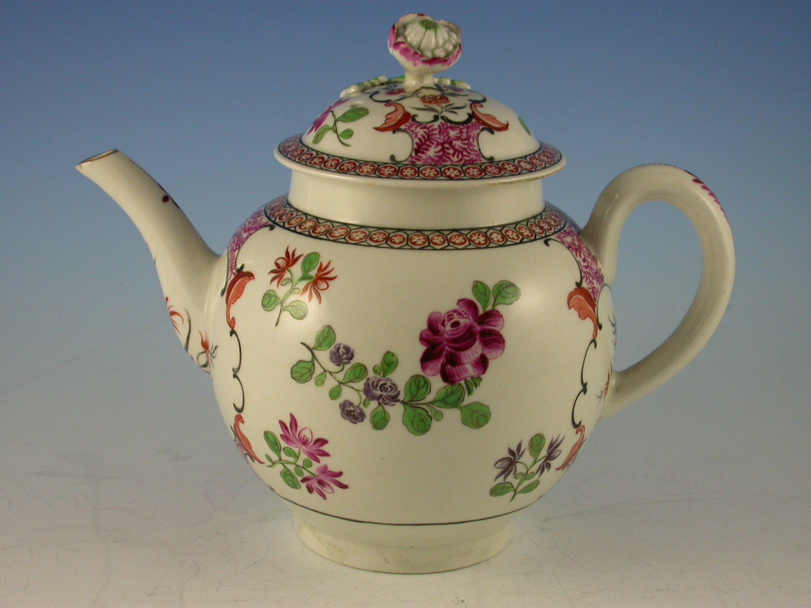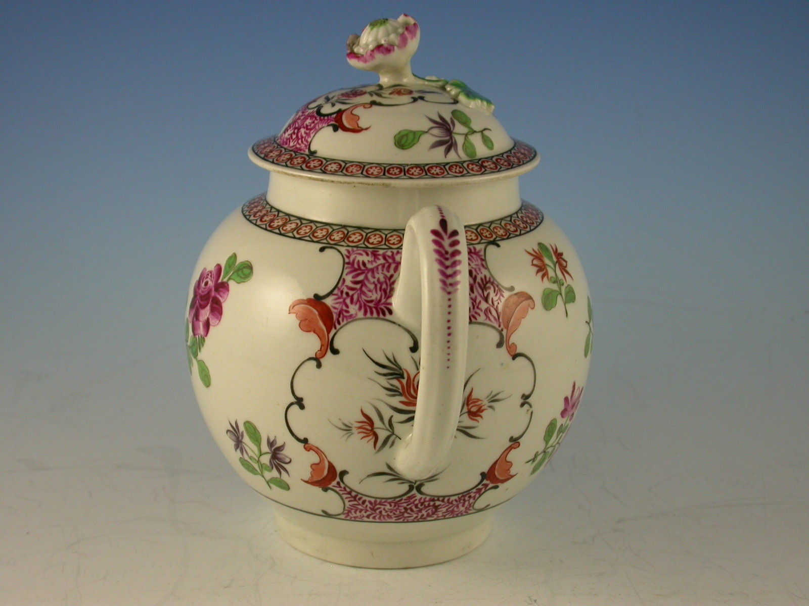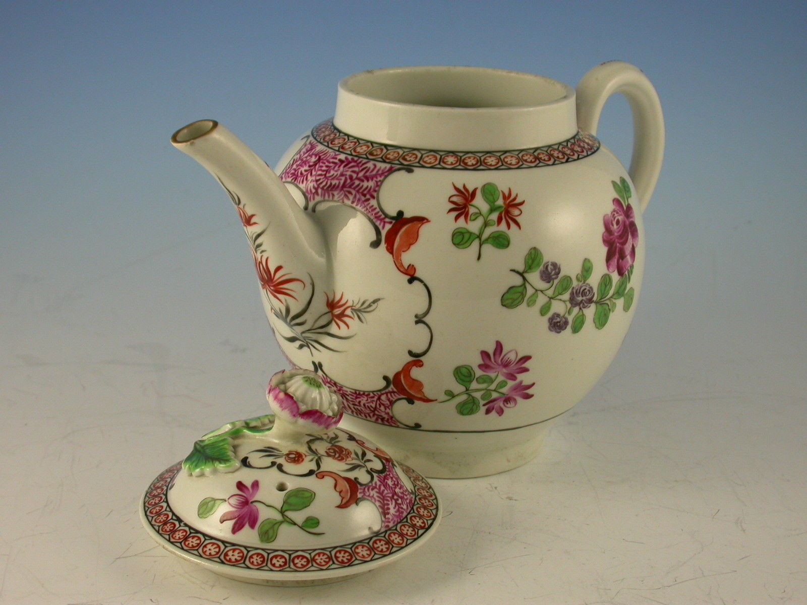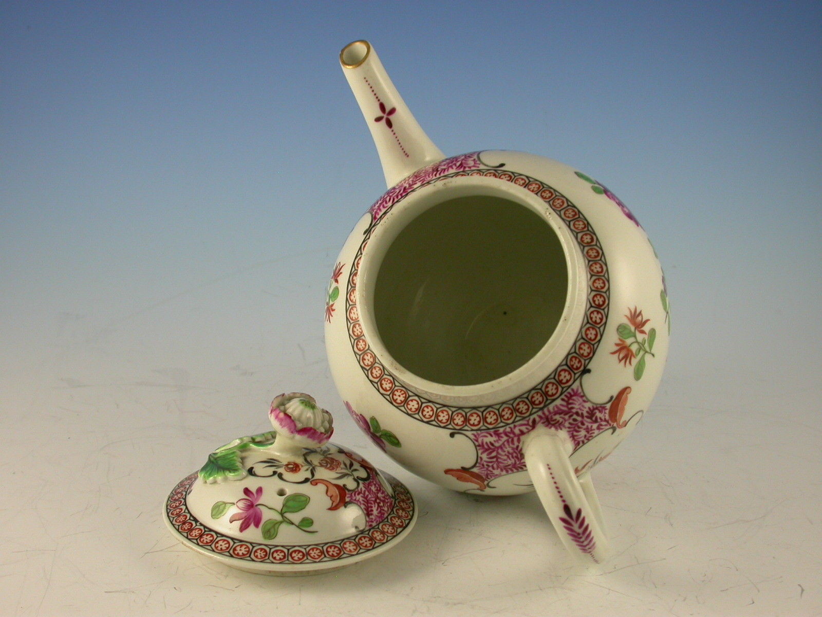 A First Period Worcester globular shaped Teapot and Cover decorated in polychrome enamels with the so called ""Compagne des Indes"" pattern.