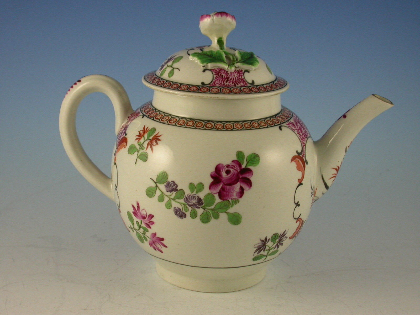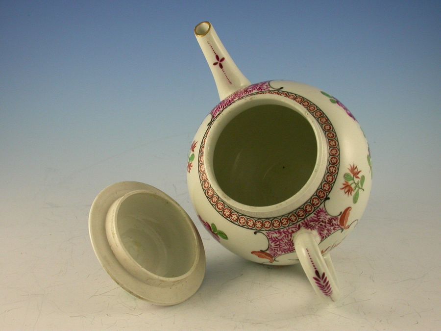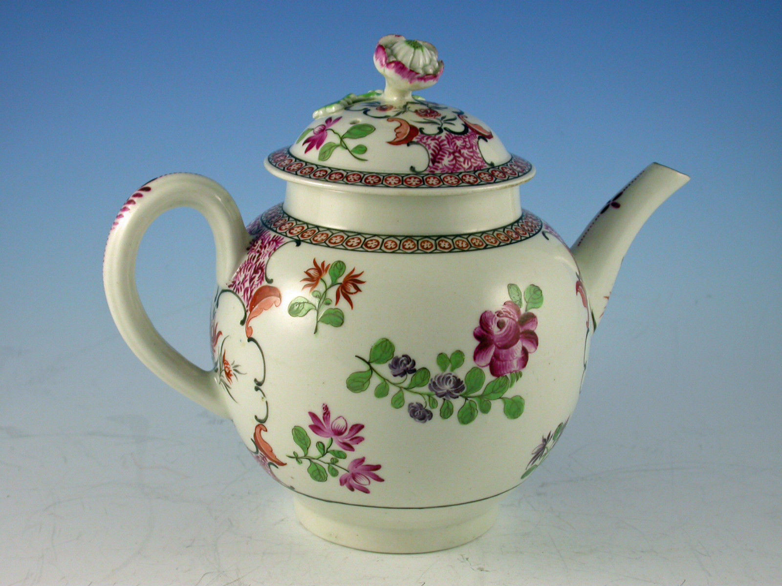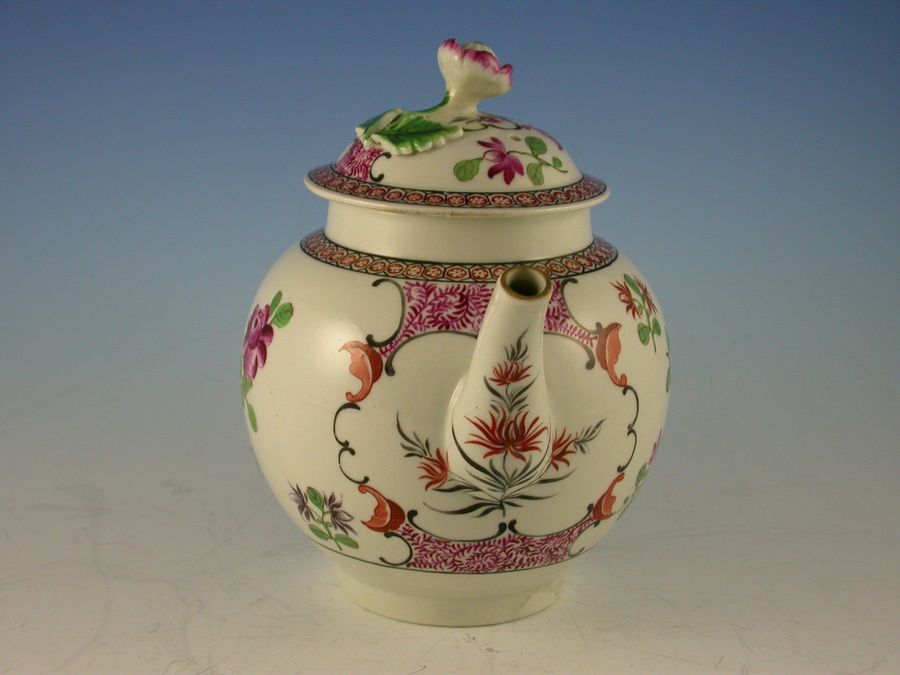 A First Period Worcester globular shaped Teapot and Cover decorated in polychrome enamels with the so called ""Compagne des Indes"" pattern.