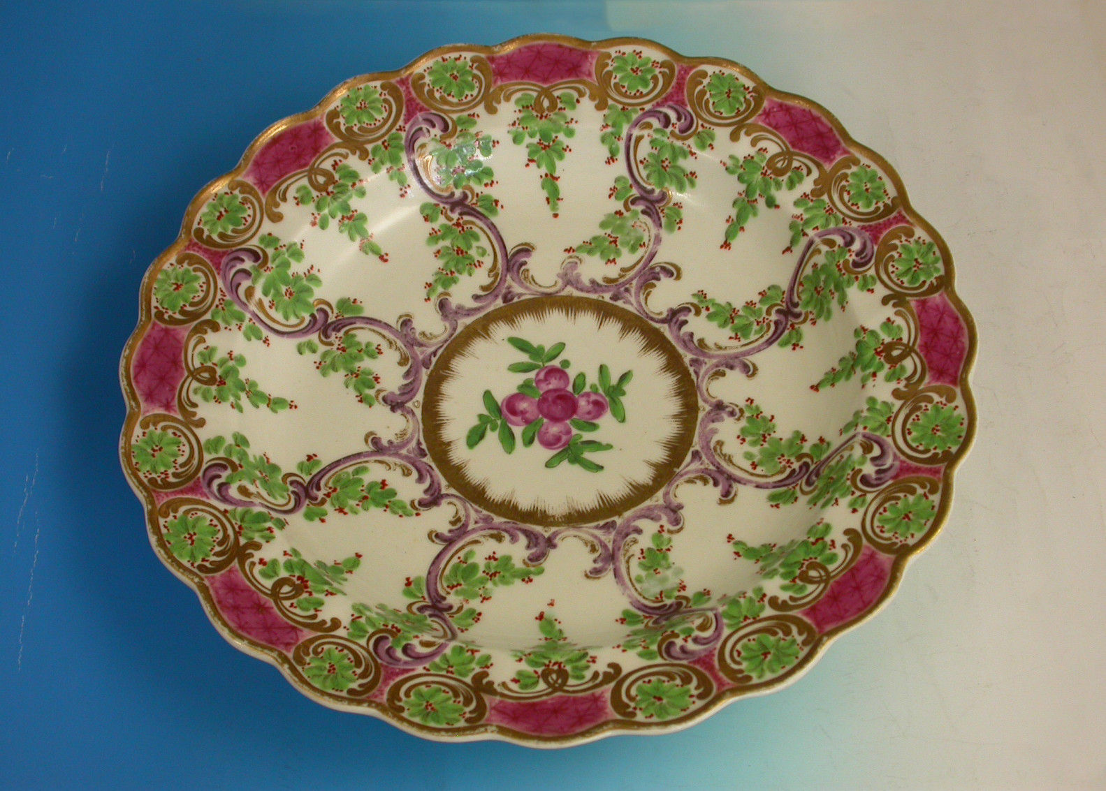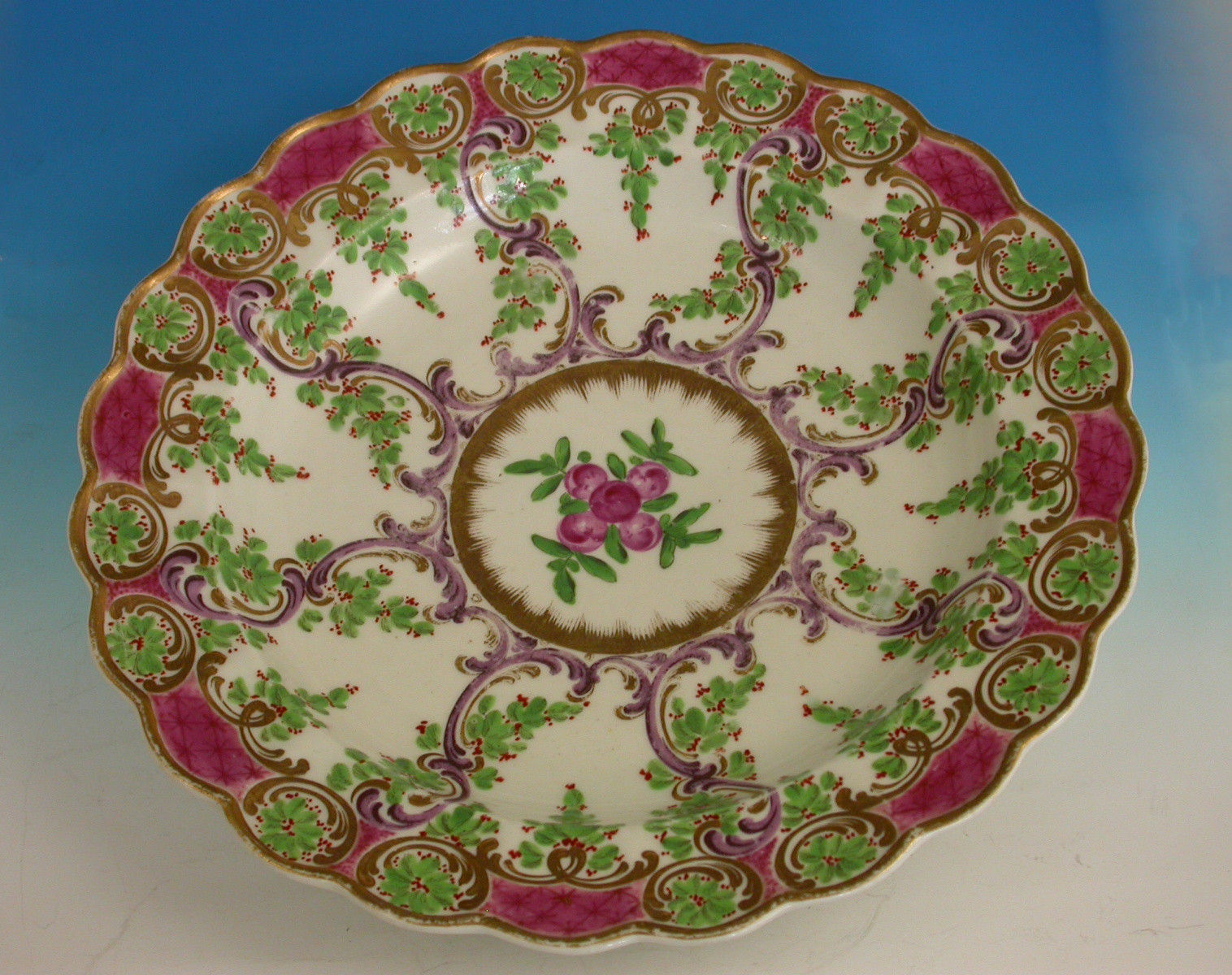 A fine First Period Worcester dessert plate with scalloped rim, painted with the 'Earl Manvers' pattern with berried garlands strung on puce C-scrolls, the border with further berried leaves in C-scroll cartouches reserved on a pink diaper pattern ground, with gilt-line rim.