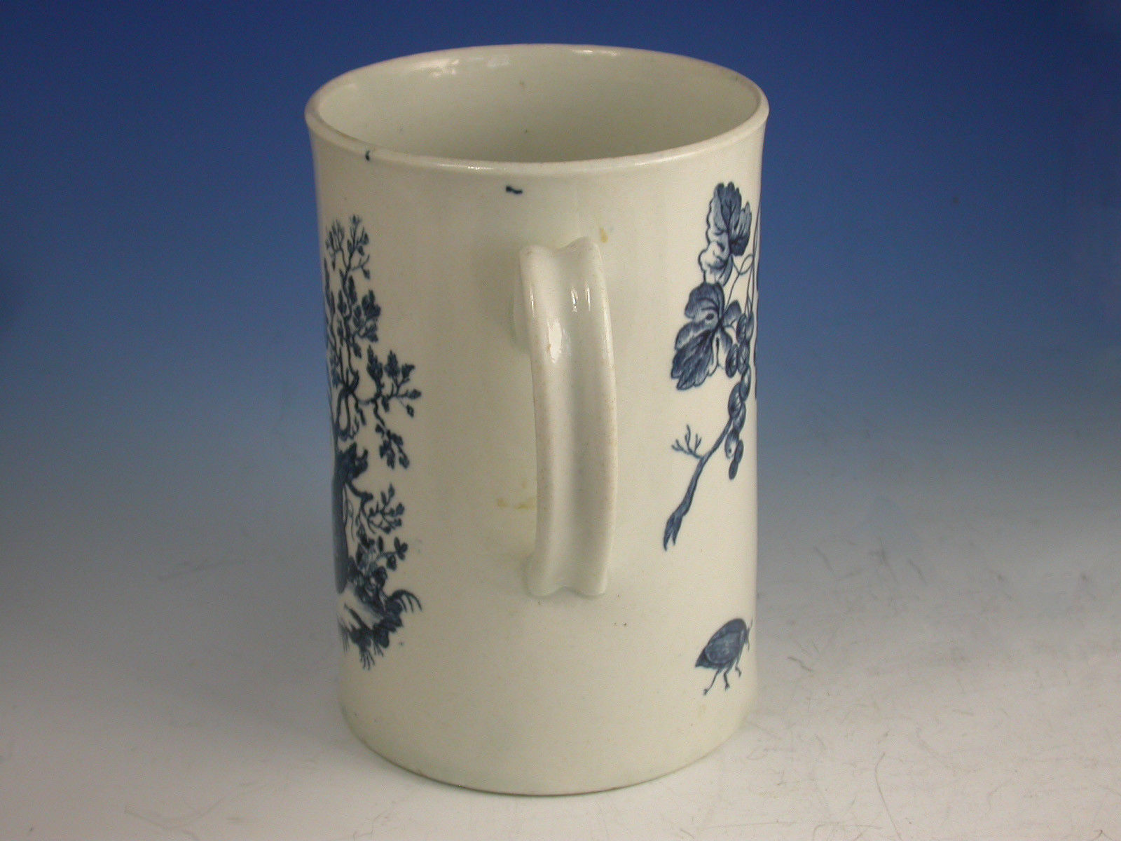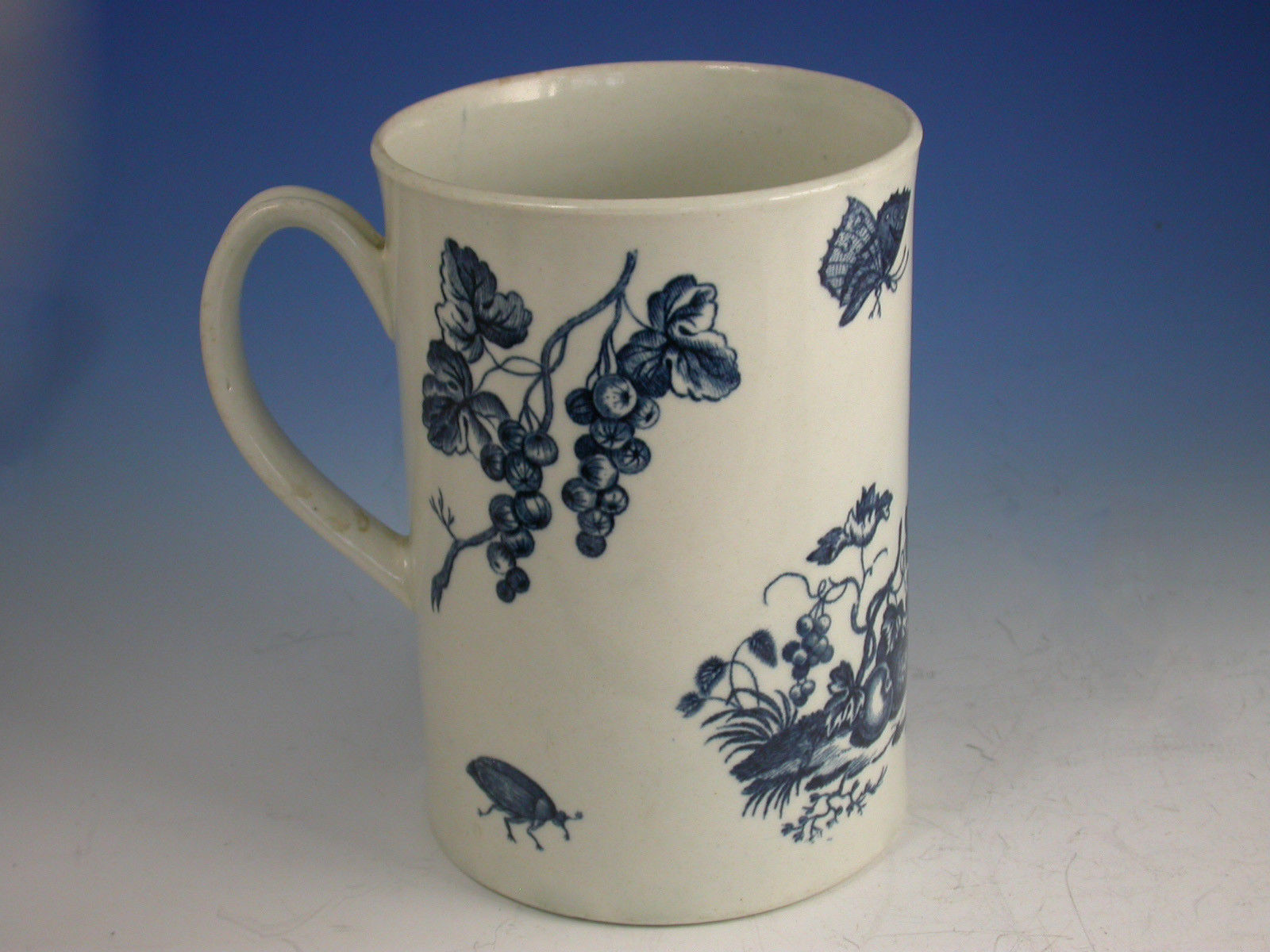 A fine First Period Worcester cylindrical Tankard of large size with grooved strap handle, printed in under-glaze blue with the second version of the Parrot Pecking Fruit pattern, 11B23 in Worcester Blue and White Porcelain, By BFS.