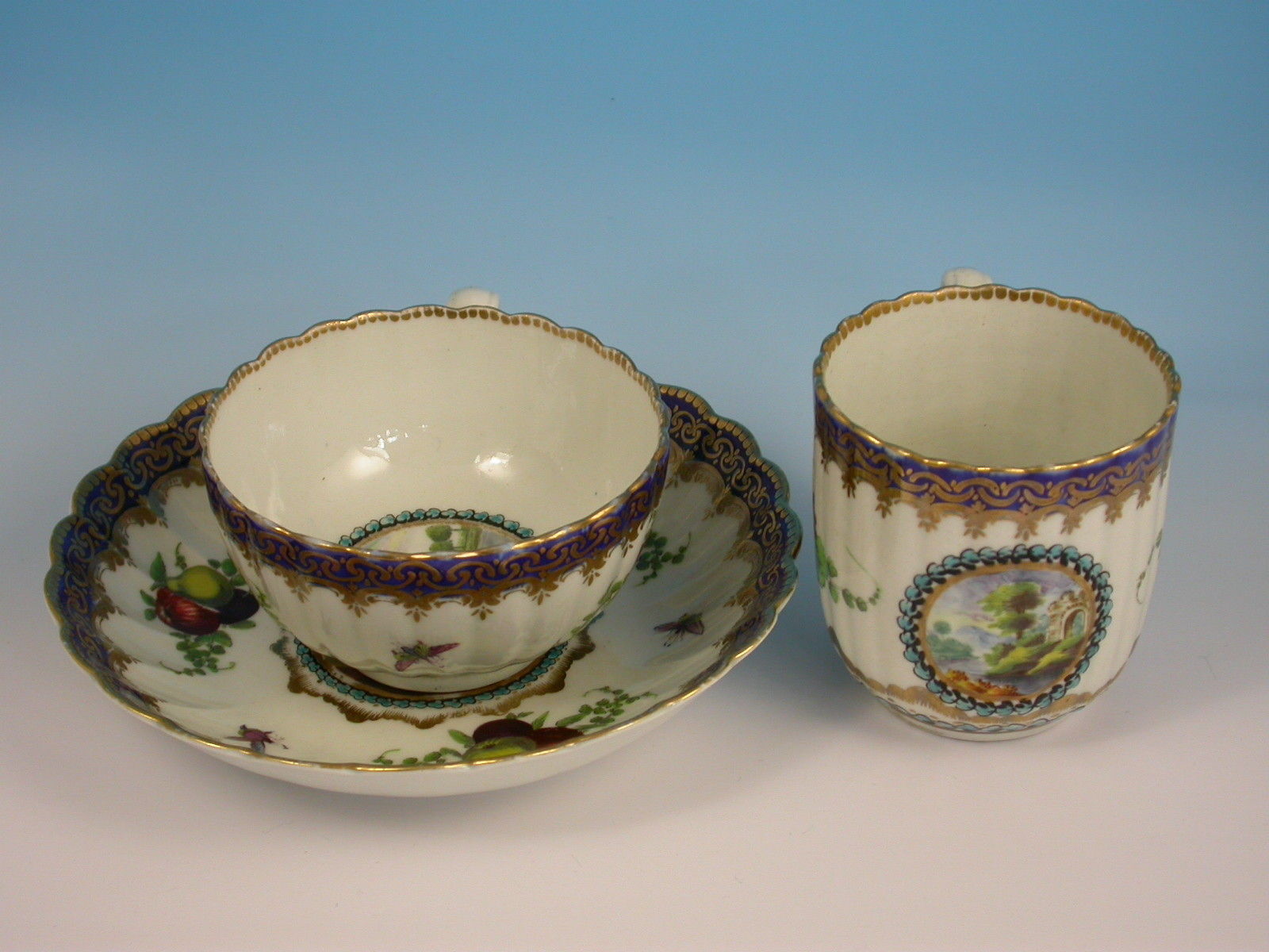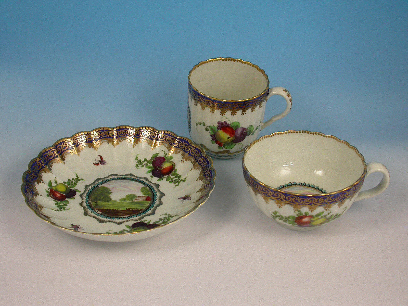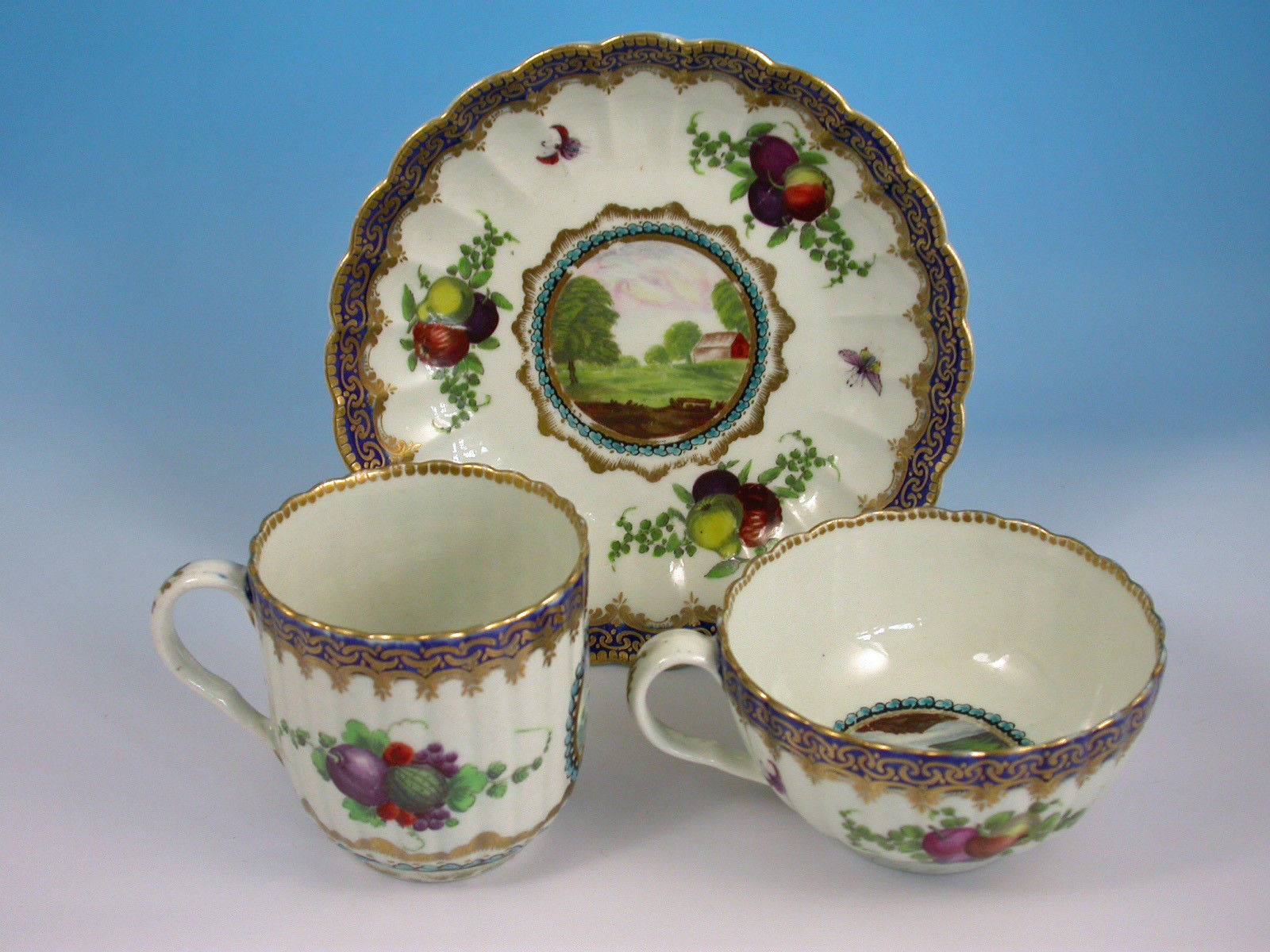 A fine First Period Worcester Trio of fluted form, painted in polychrome enamels with the Lord Henry Thynne pattern, depicting a central landscape reserve within sprays of fruits and insects all within a gilt enriched wet blue border, gilt dentil rims.