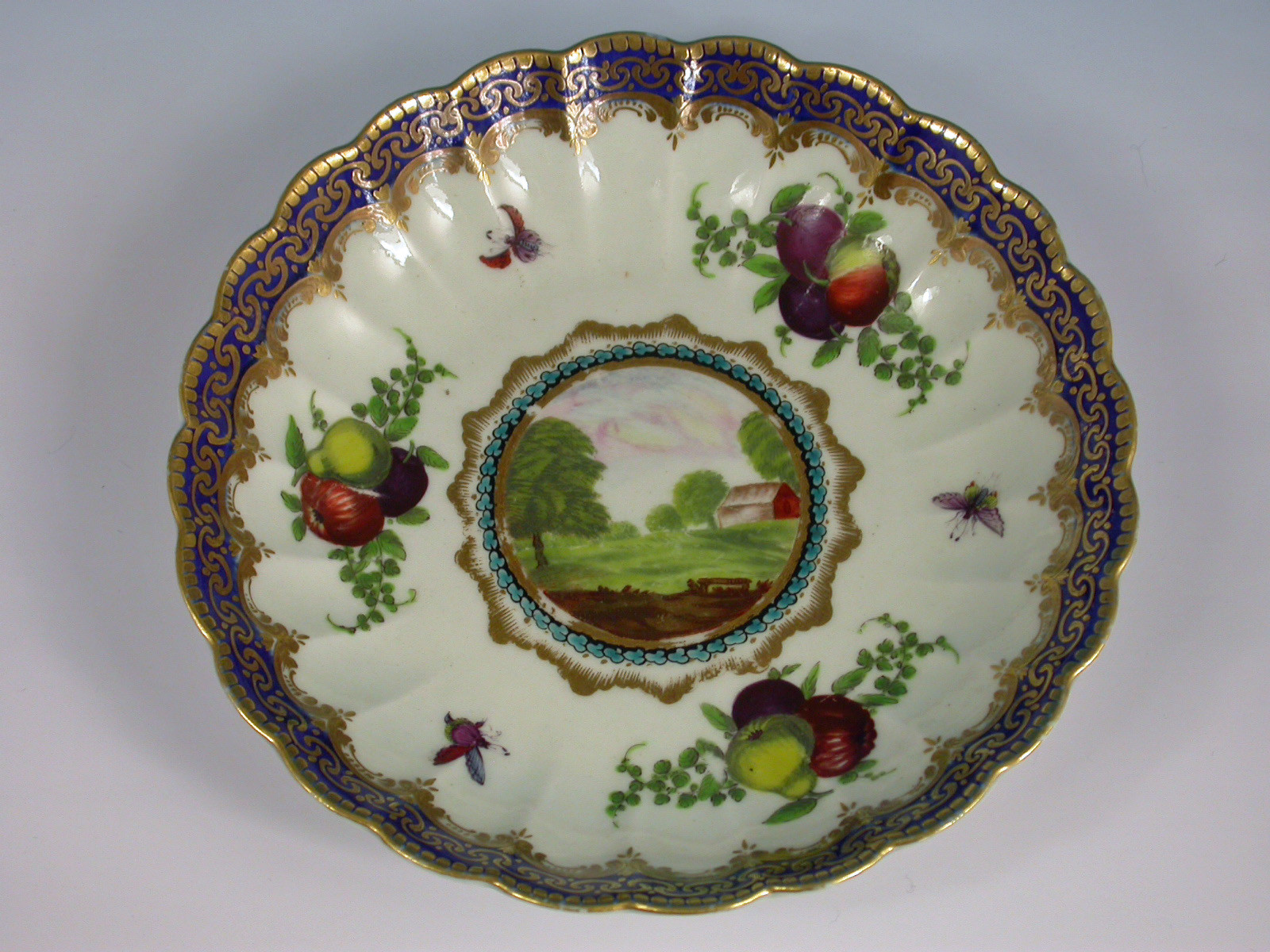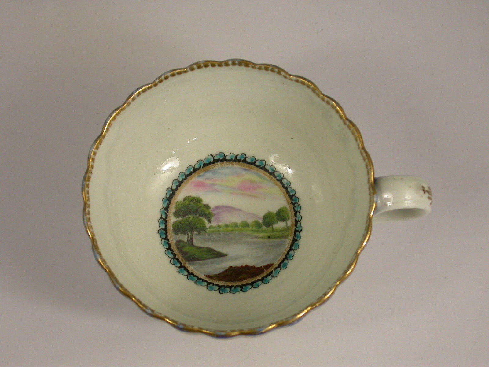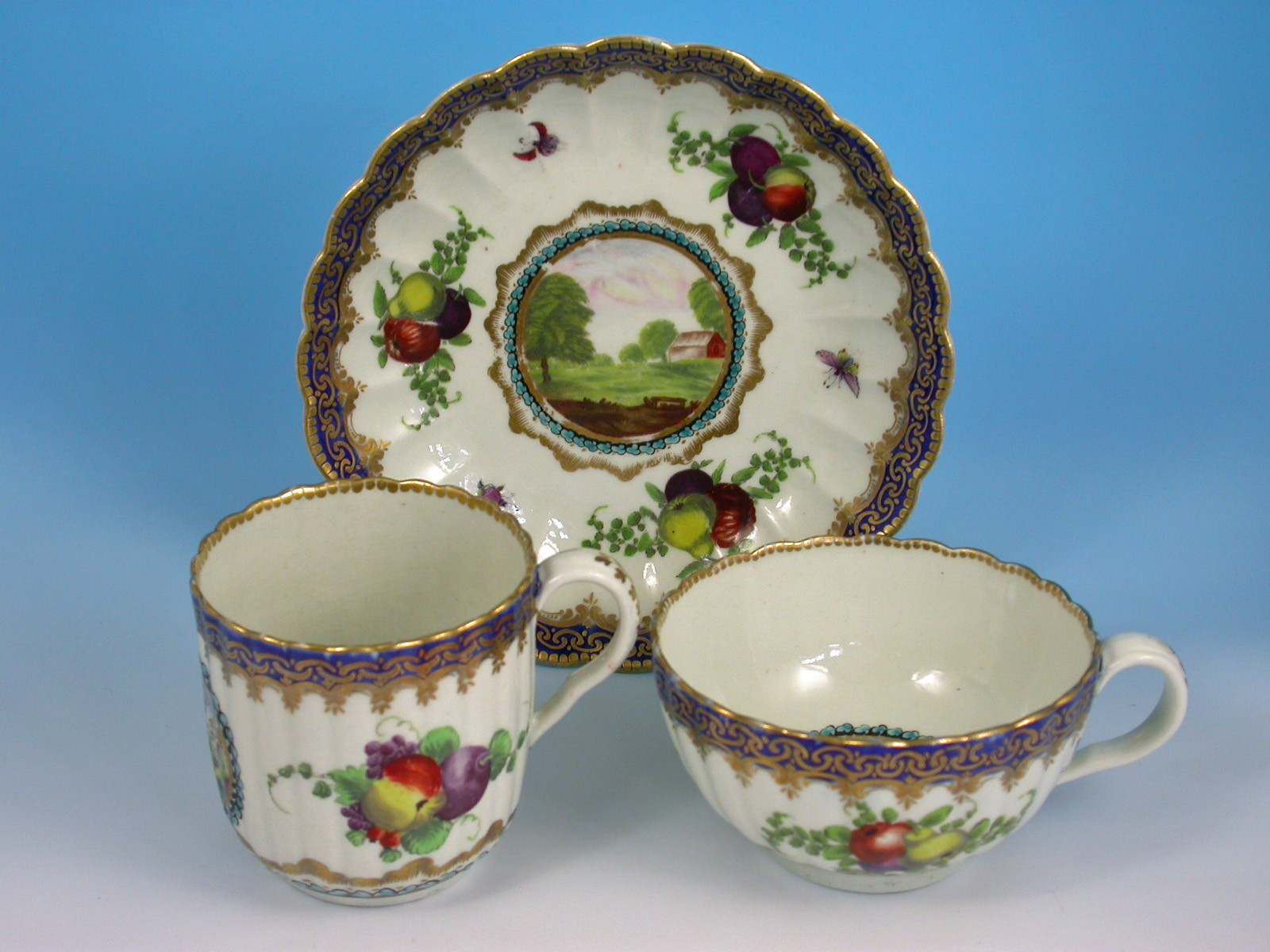 A fine First Period Worcester Trio of fluted form, painted in polychrome enamels with the Lord Henry Thynne pattern, depicting a central landscape reserve within sprays of fruits and insects all within a gilt enriched wet blue border, gilt dentil rims.