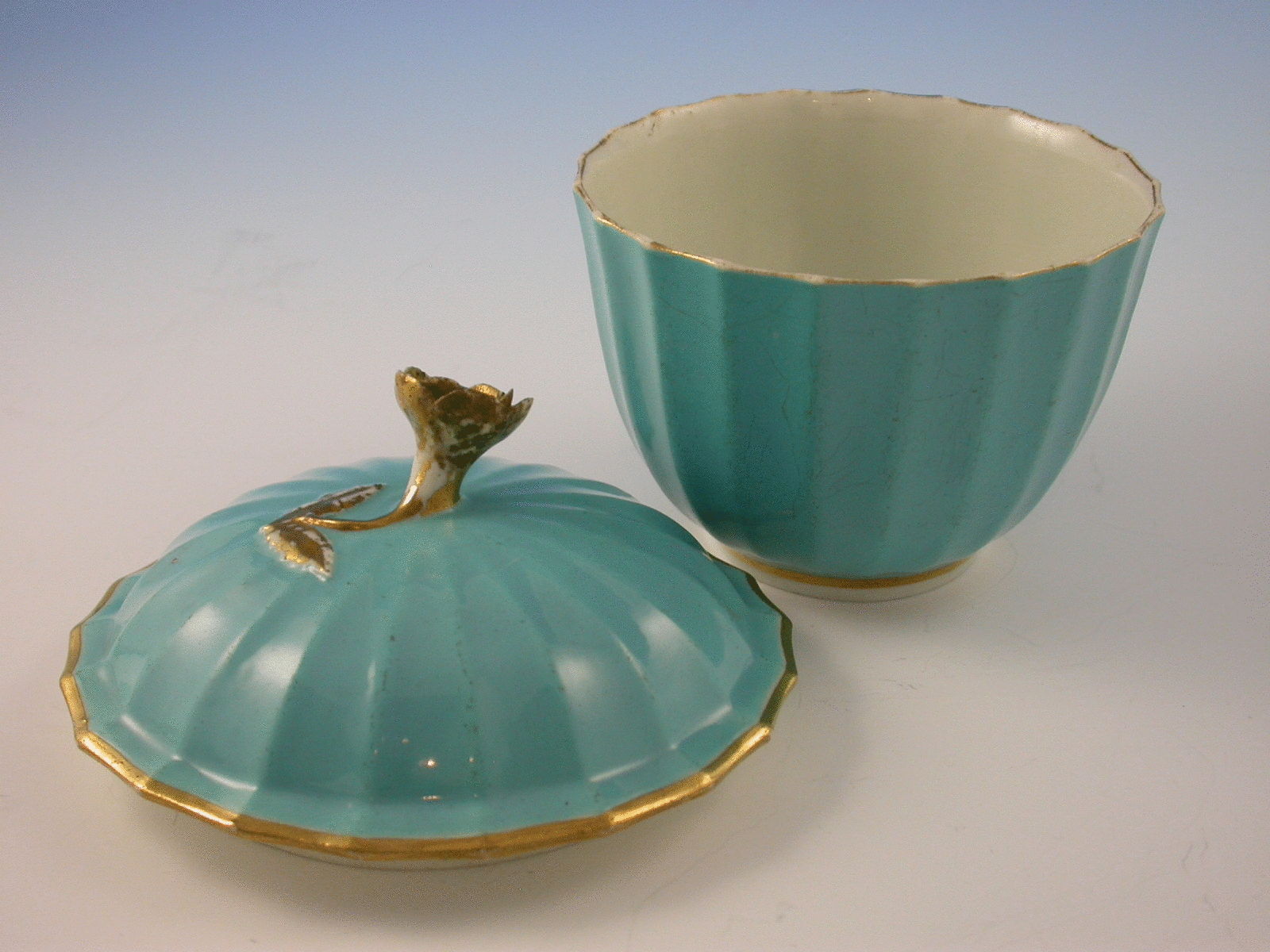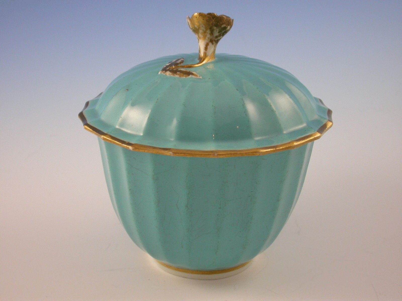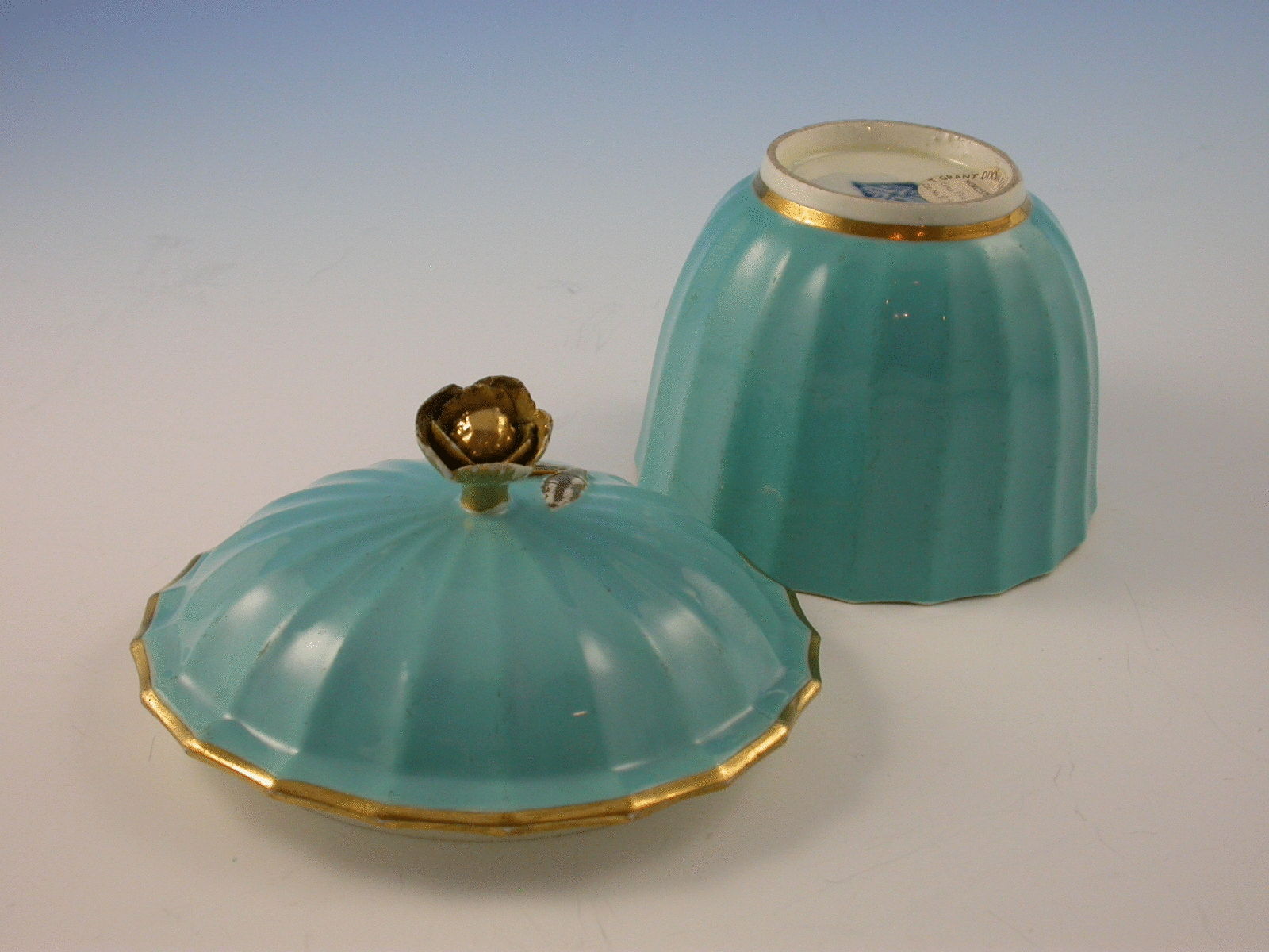 A good First Period Worcester flute moulded Sucrier & Cover with gilt enriched open flower bud knop, painted in the atelier of James Giles on a solid turquoise ground within a gilt line border to the rim.