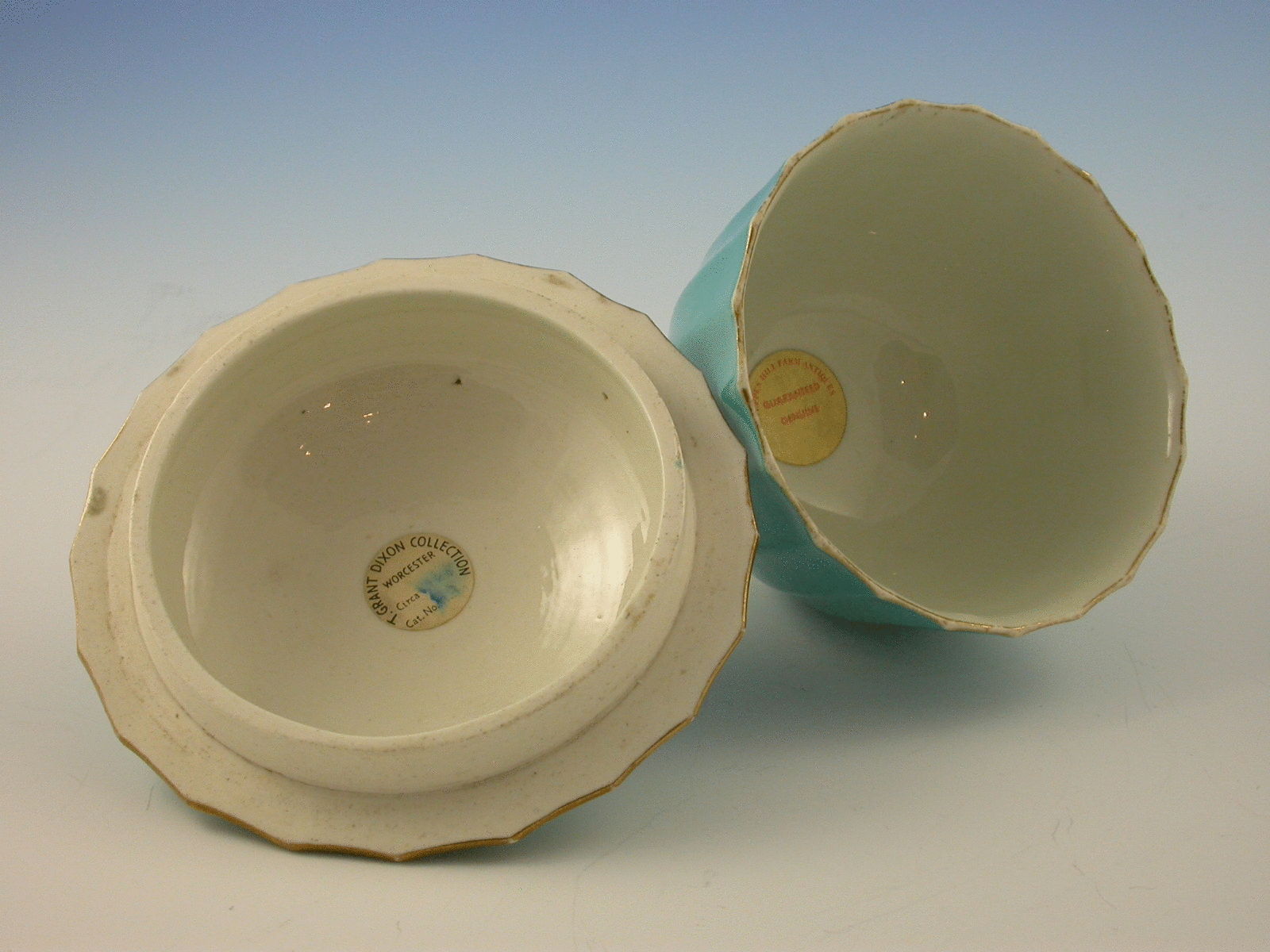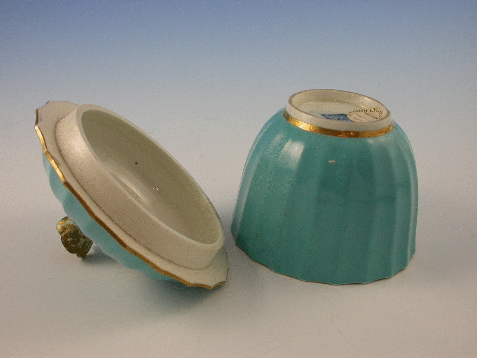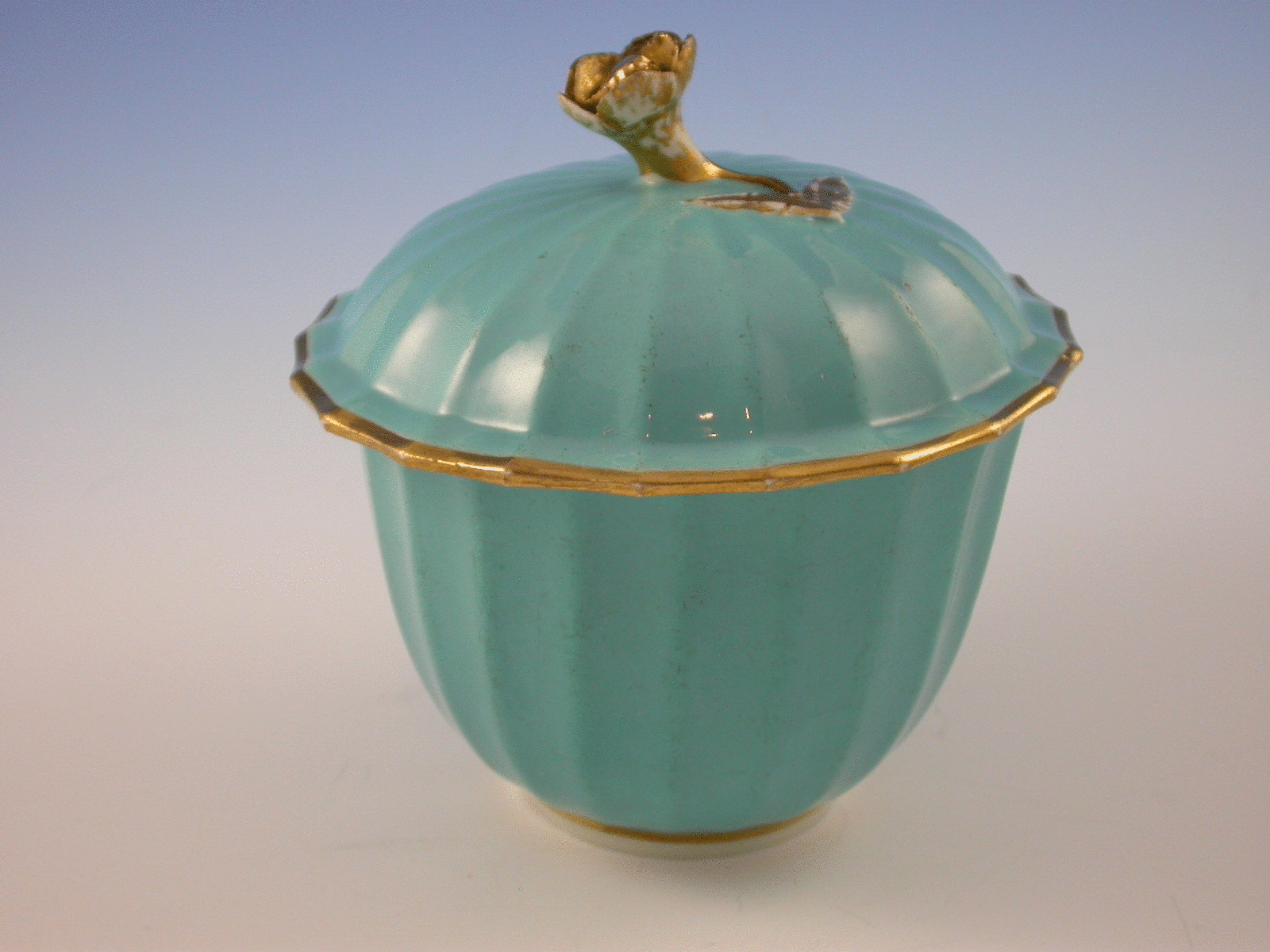 A good First Period Worcester flute moulded Sucrier & Cover with gilt enriched open flower bud knop, painted in the atelier of James Giles on a solid turquoise ground within a gilt line border to the rim.