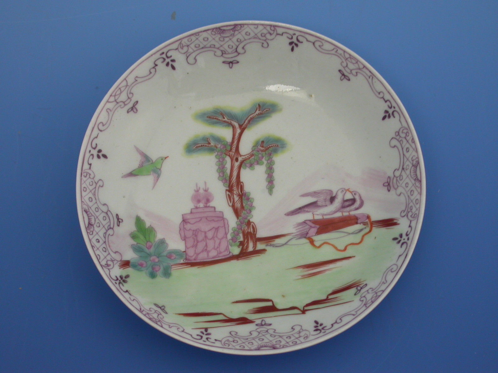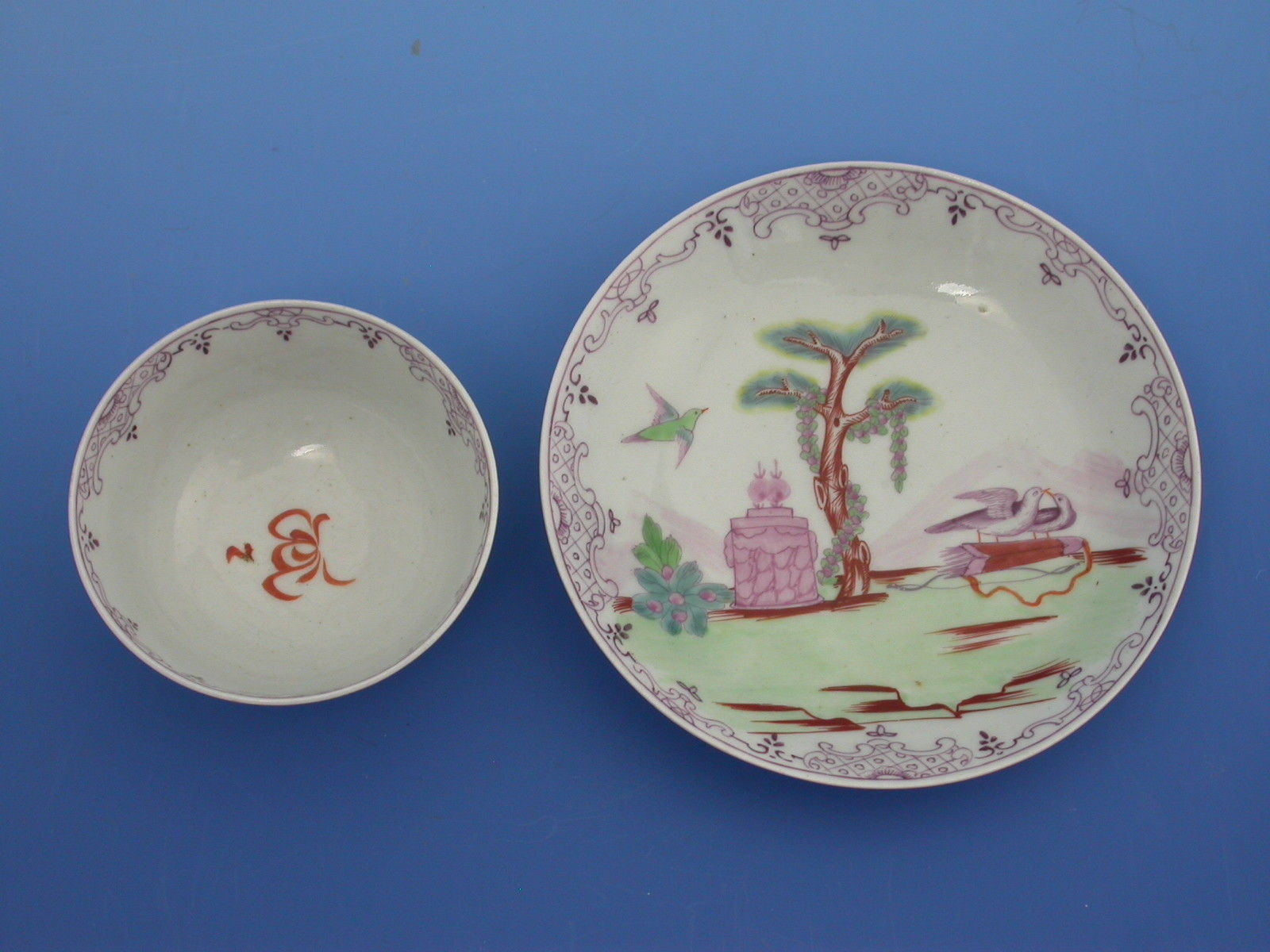 A fine First Period Worcester Teabowl and Saucer, painted in polychrome enamels with the ""Valentine pattern"", depicting two billing doves standing on a quiver of arrows with a leafy tree and a cauldron to the side, all within a puce scroll and diaper border.