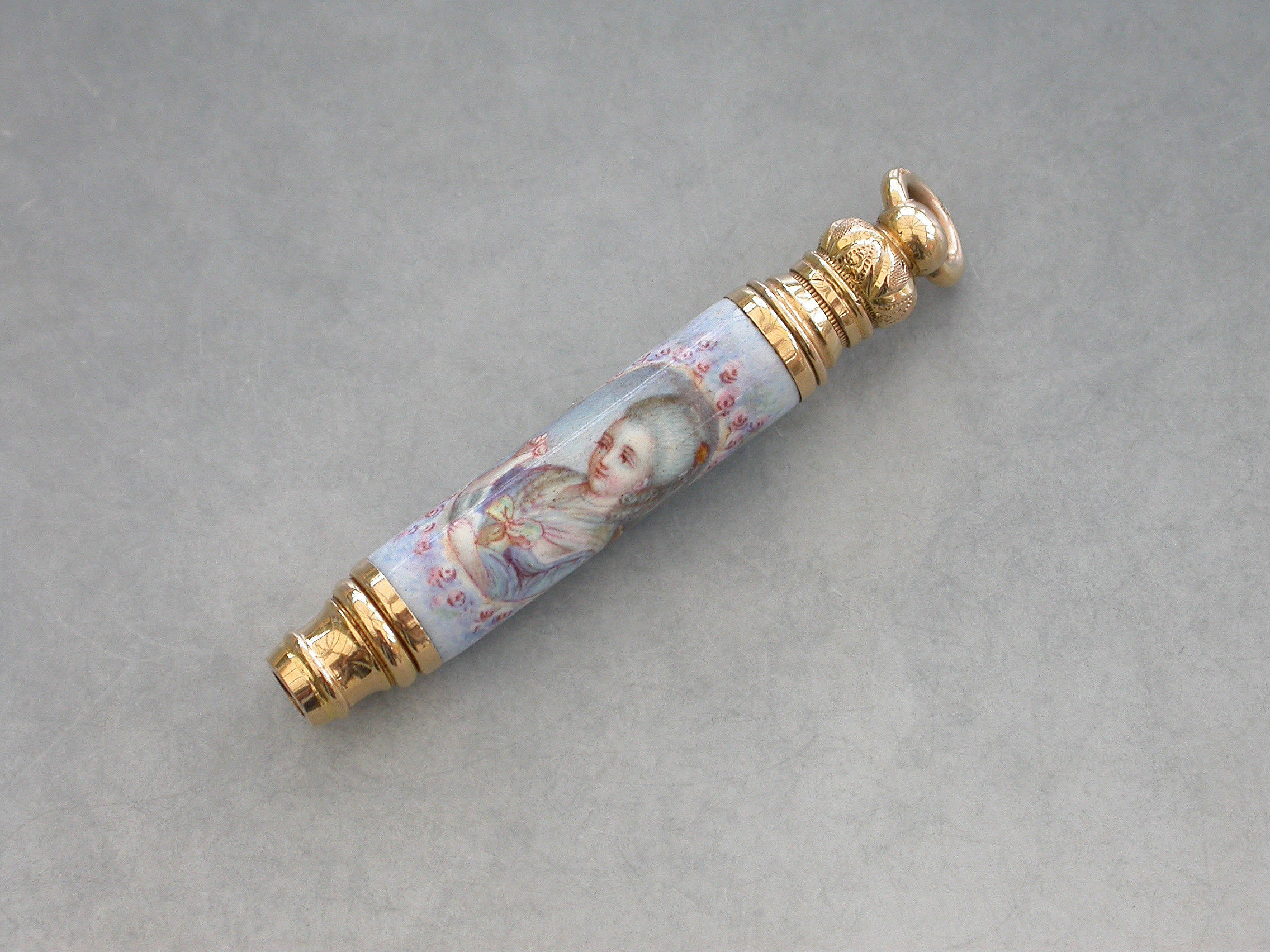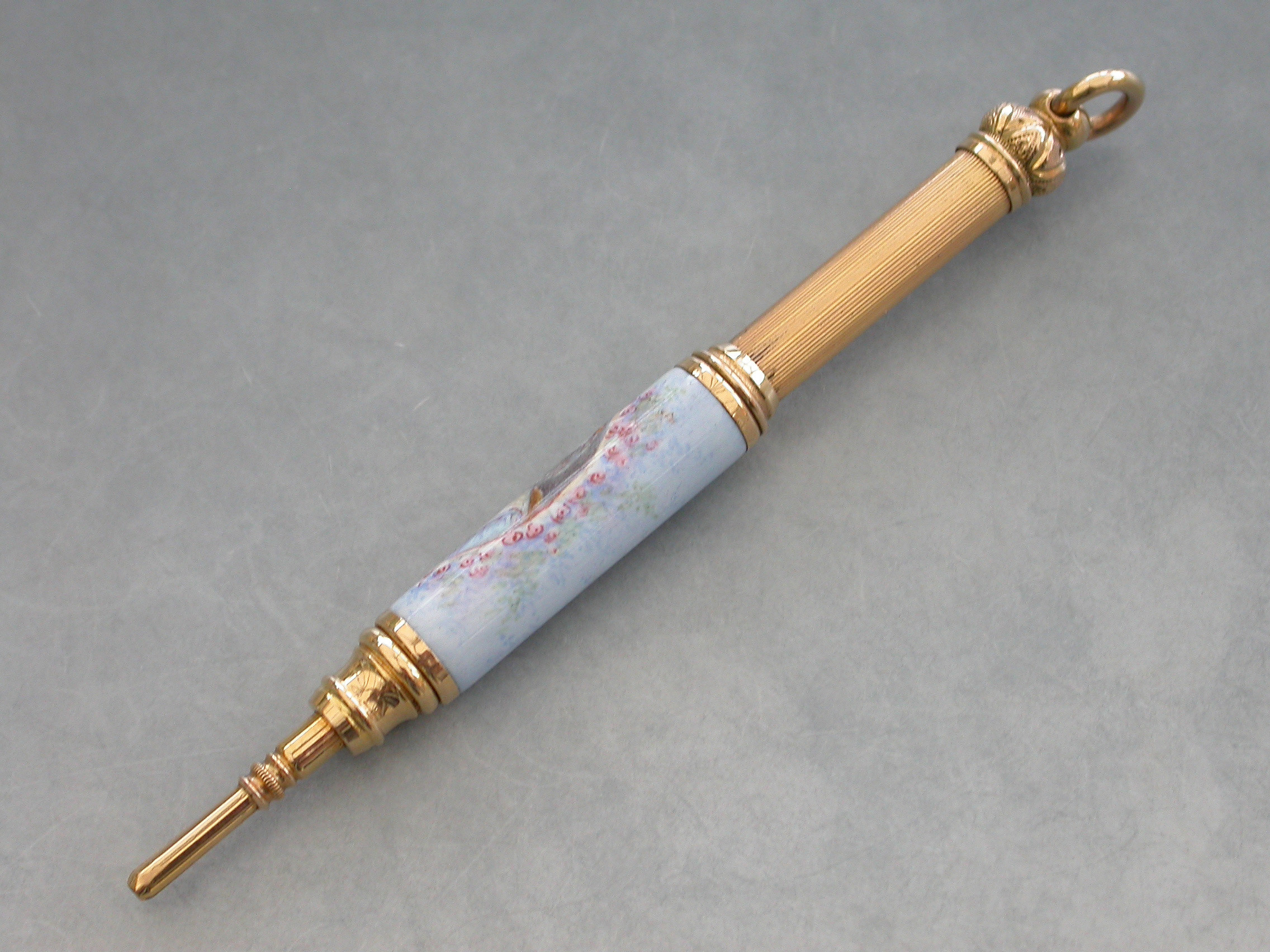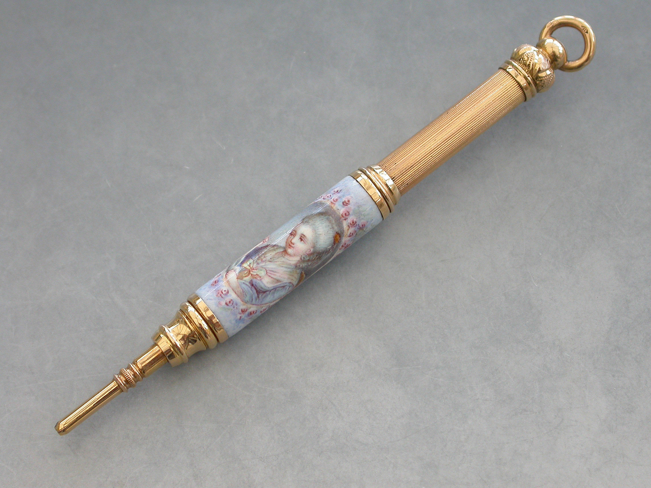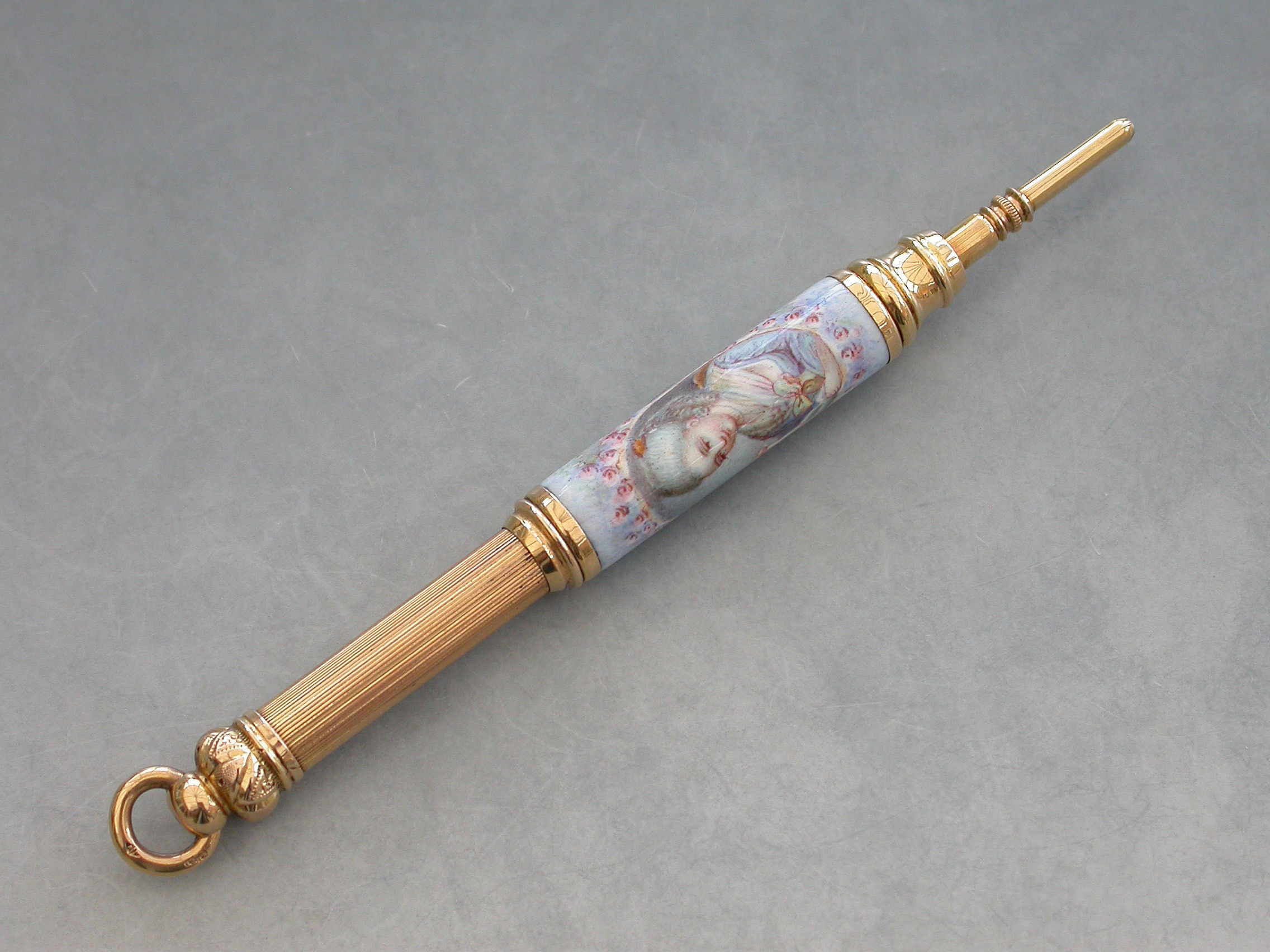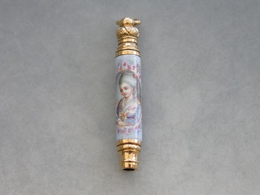 A fine quality late 19th century French high carat gold and enamel telescopic Propelling Pencil decorated with a portrait of a lady in an oval reserve surrounded by flowers on a pale blue ground.