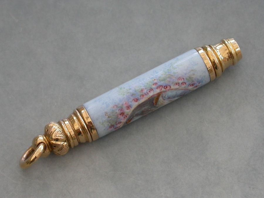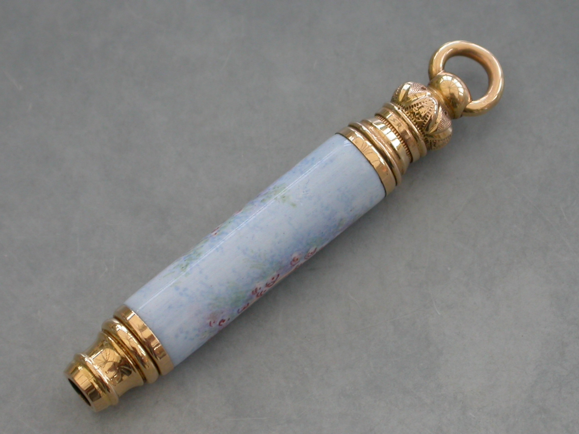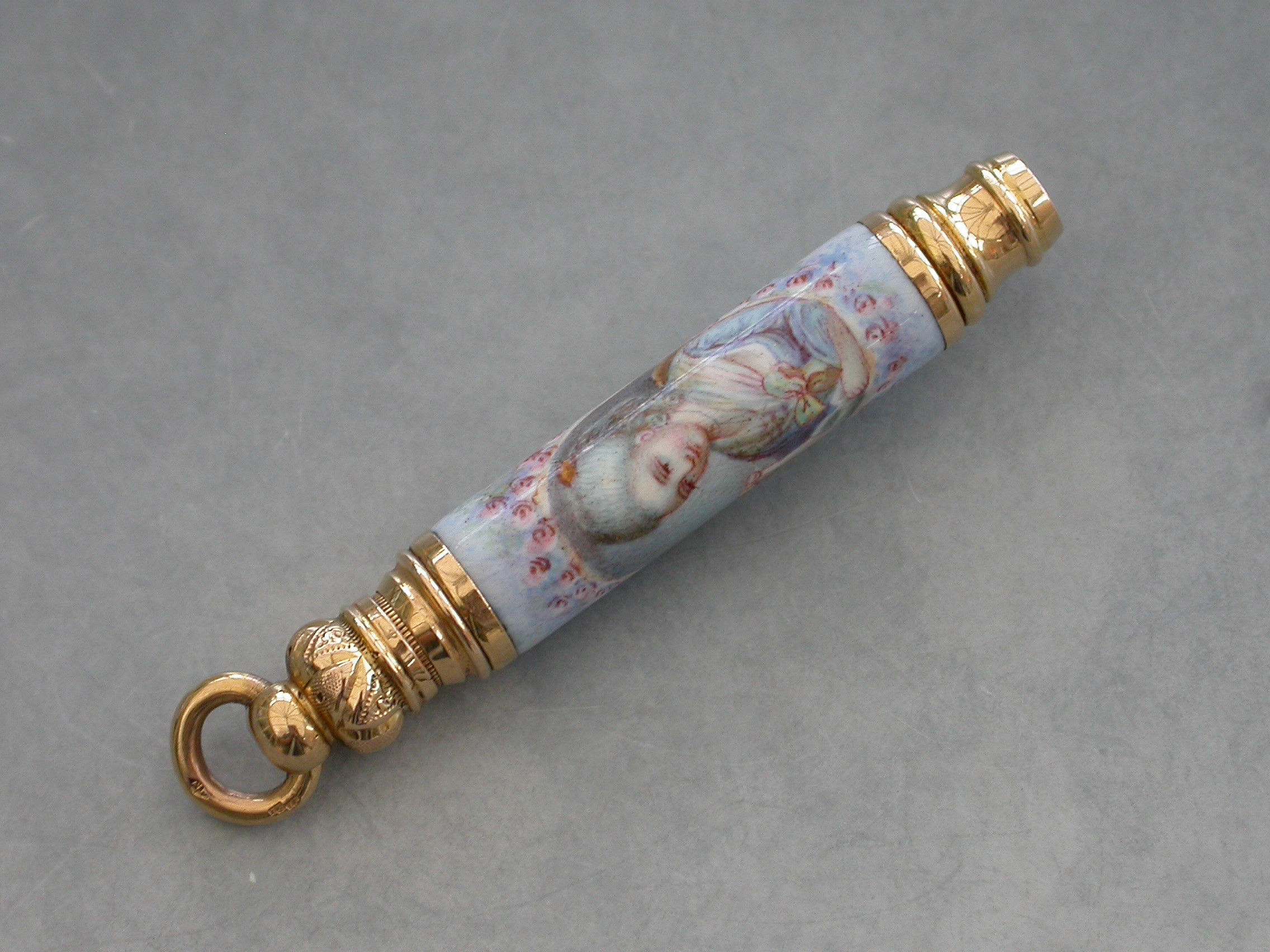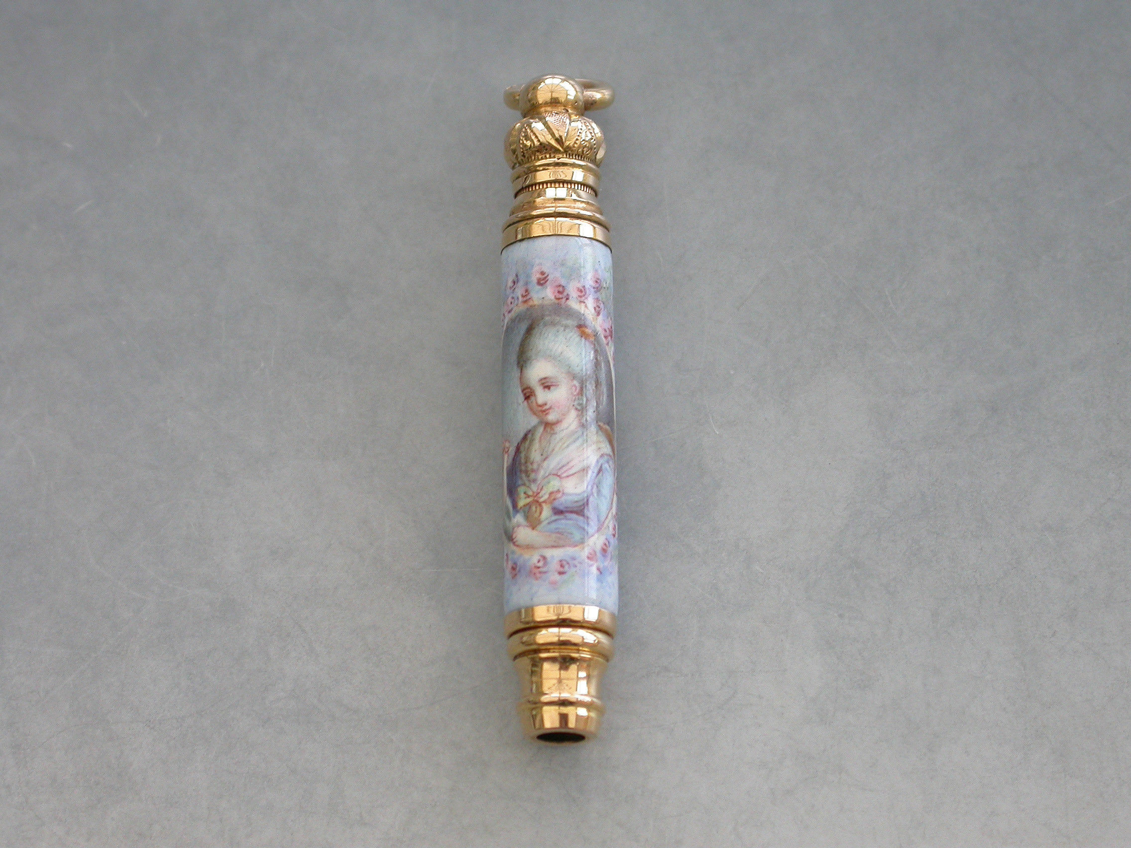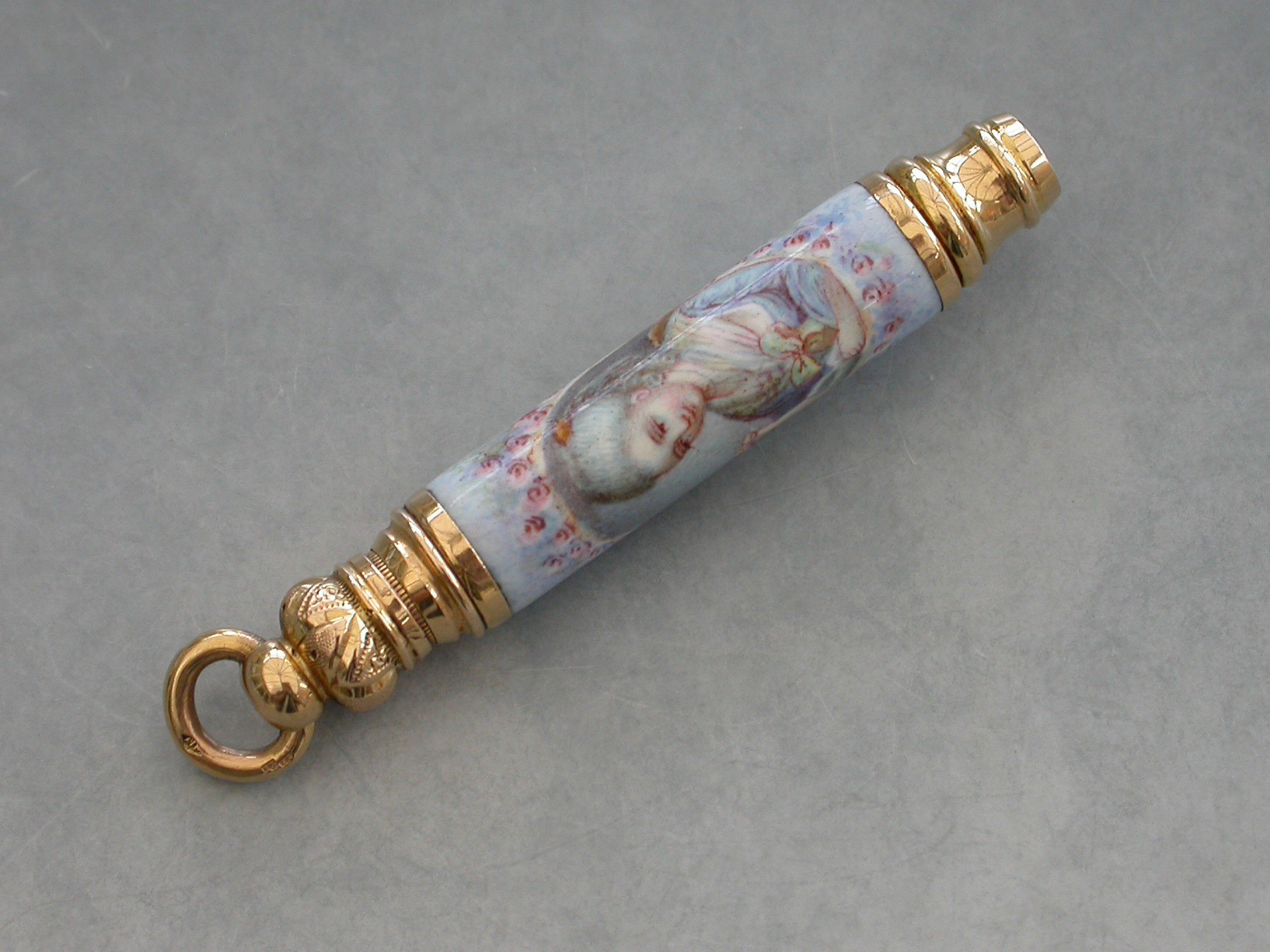 A fine quality late 19th century French high carat gold and enamel telescopic Propelling Pencil decorated with a portrait of a lady in an oval reserve surrounded by flowers on a pale blue ground.