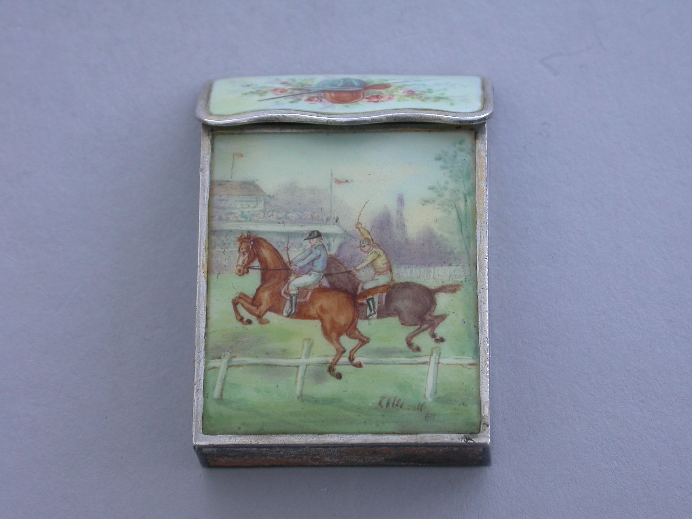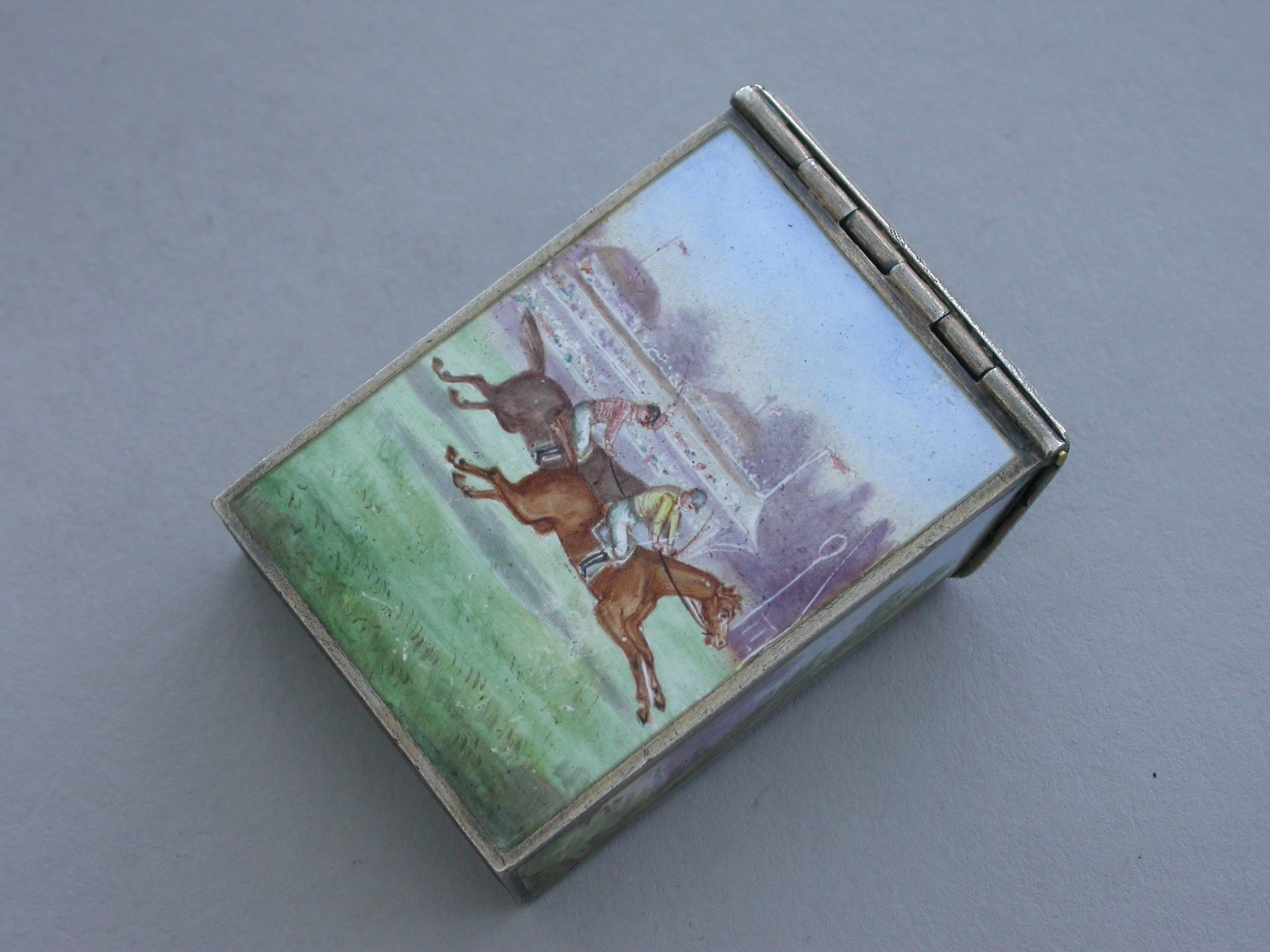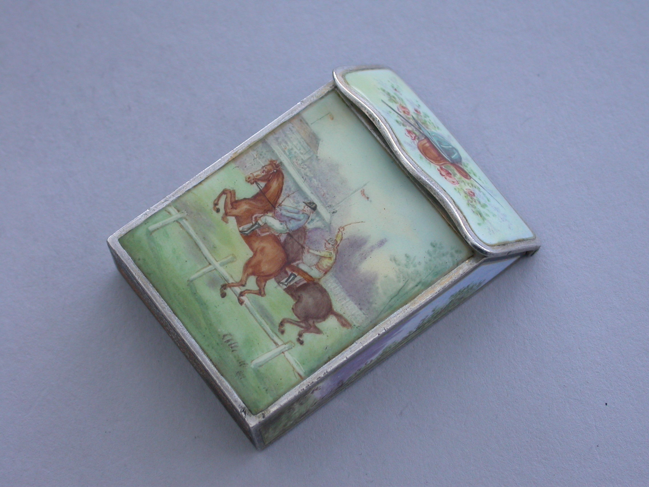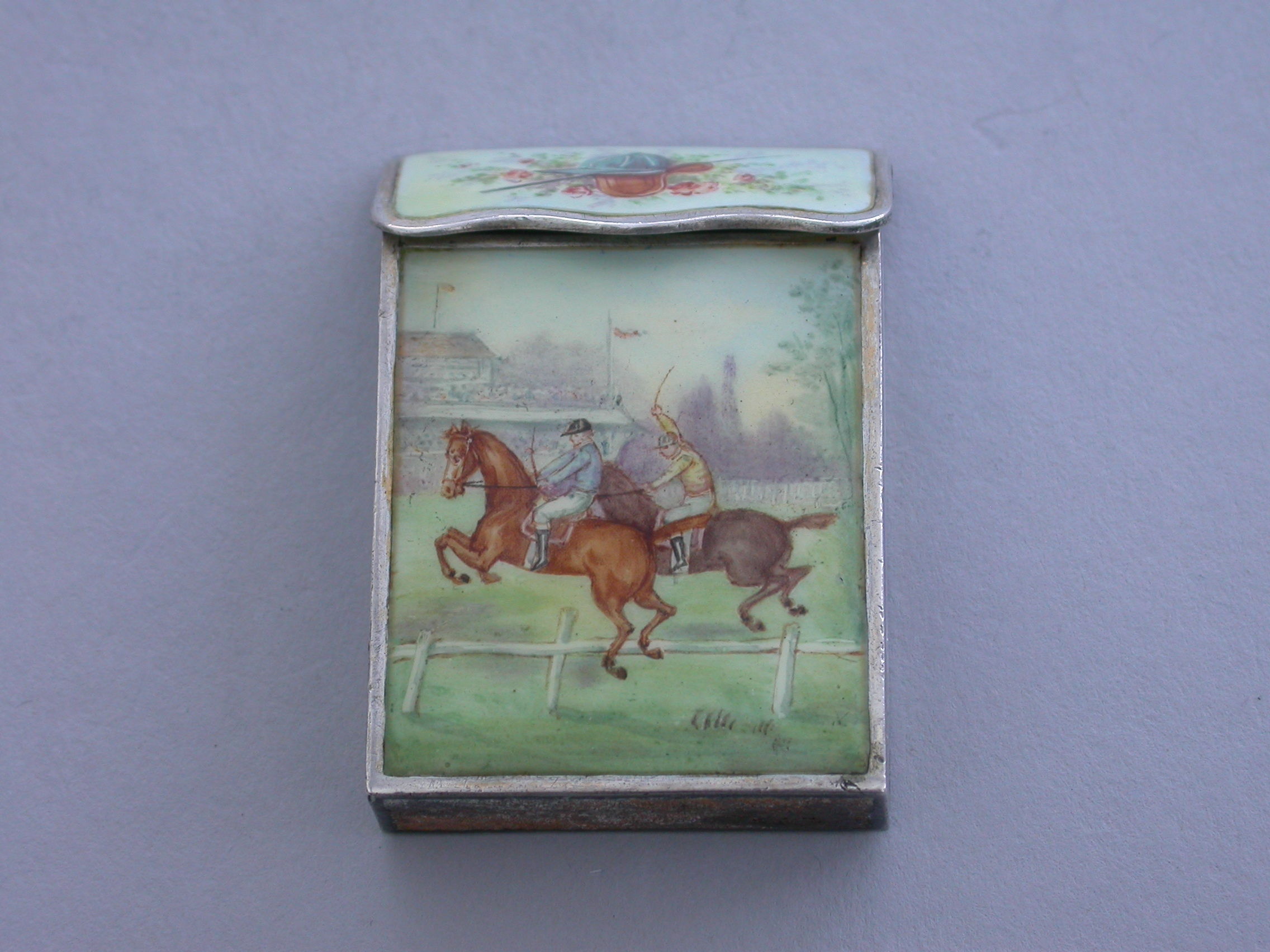 A fine quality late 19th century French silver and enamel Vesta Case of rectangular form with sloping sprung hinged lid, enamelled on all surfaces apart from the base, with horse racing and landscape scenes, including both flat and national hunt type horse racing.