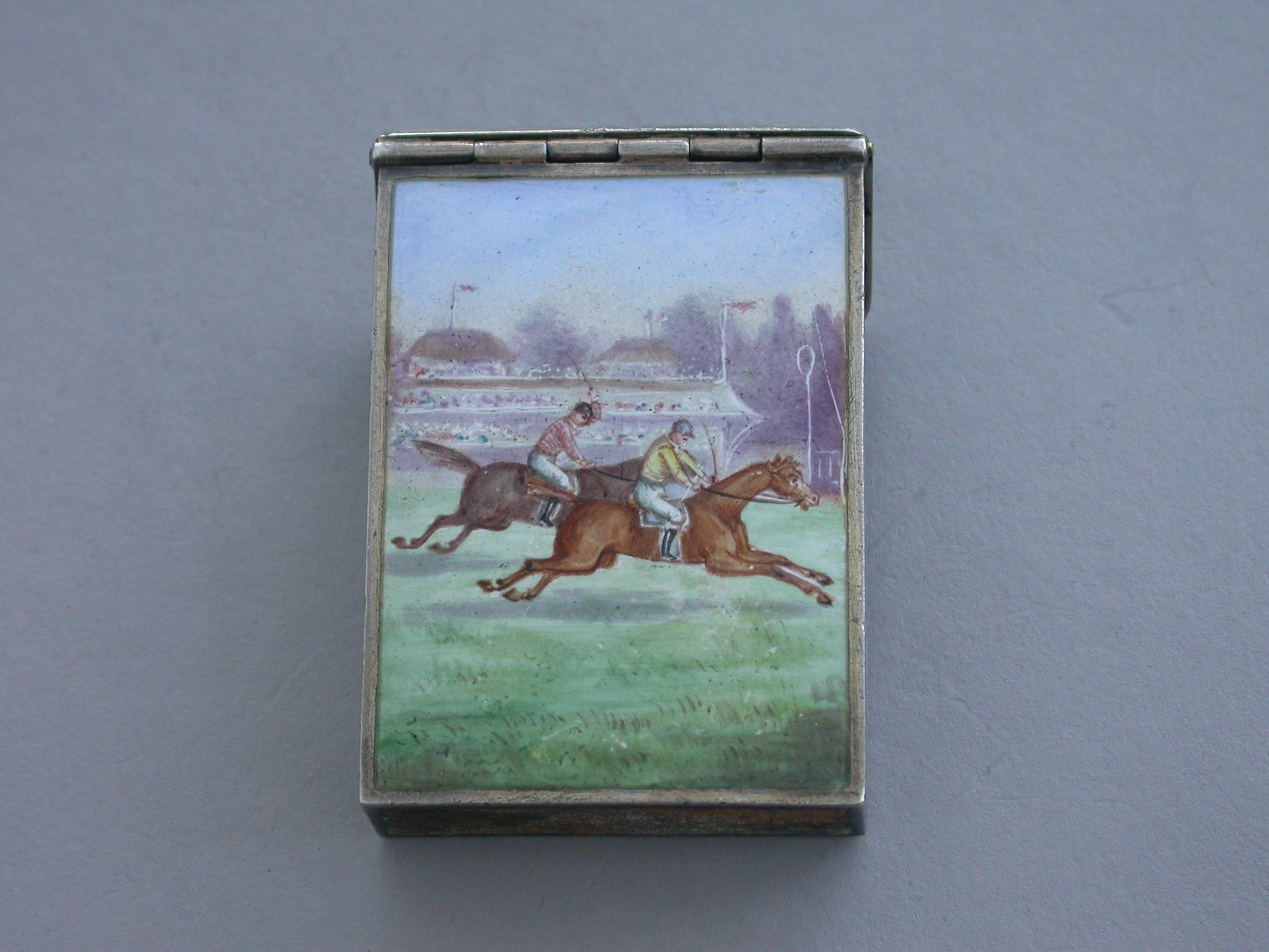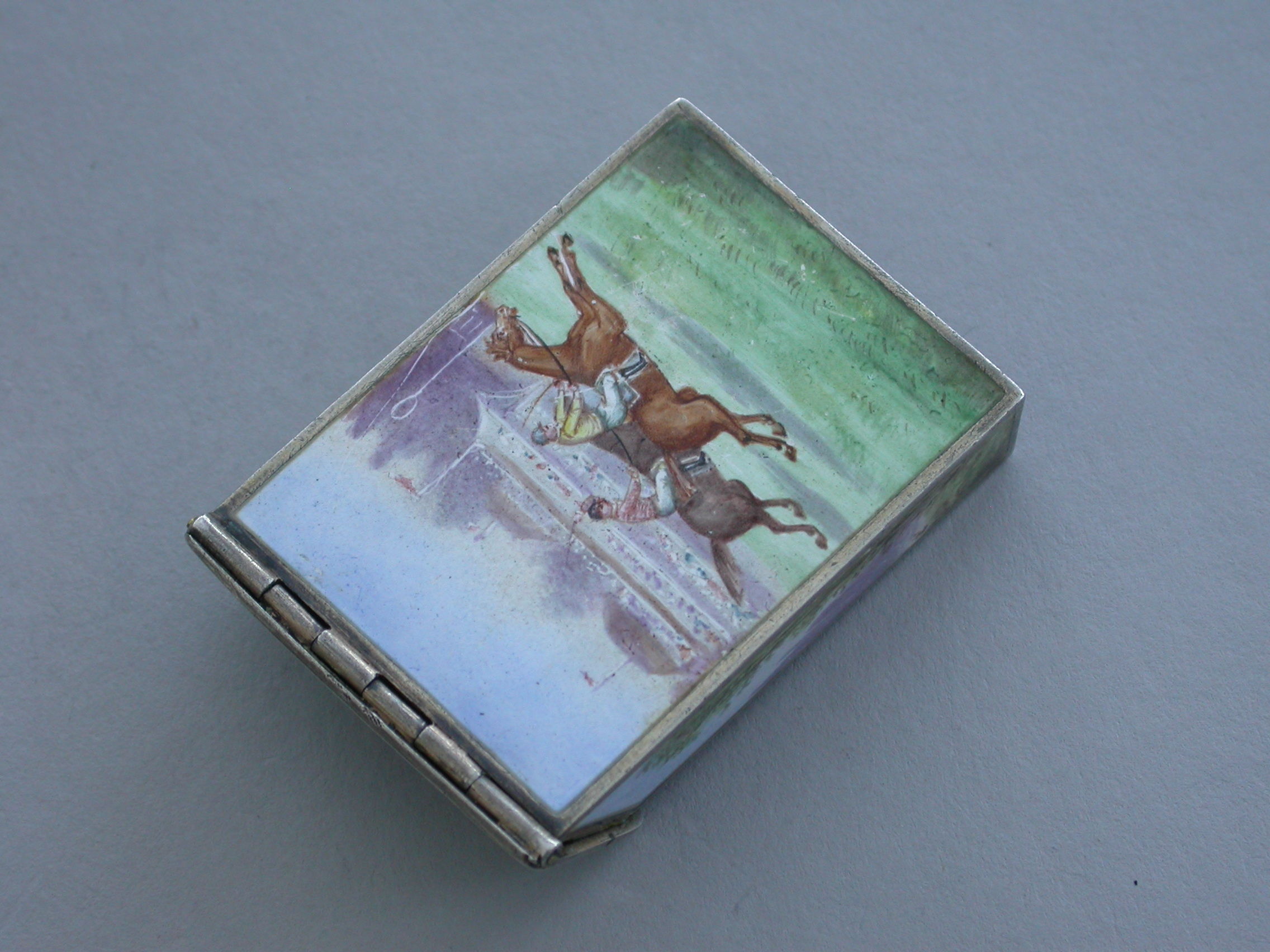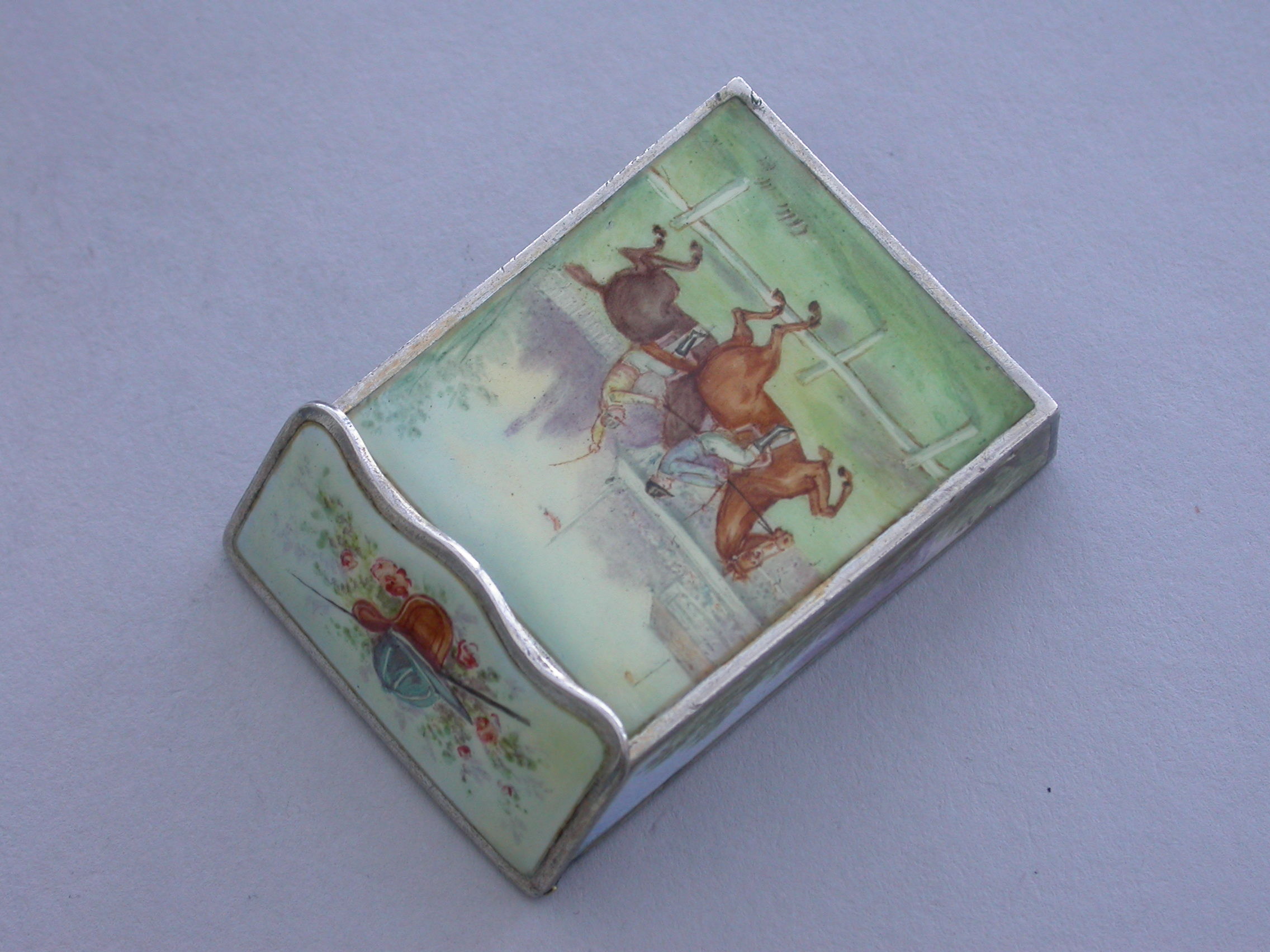 A fine quality late 19th century French silver and enamel Vesta Case of rectangular form with sloping sprung hinged lid, enamelled on all surfaces apart from the base, with horse racing and landscape scenes, including both flat and national hunt type horse racing.
