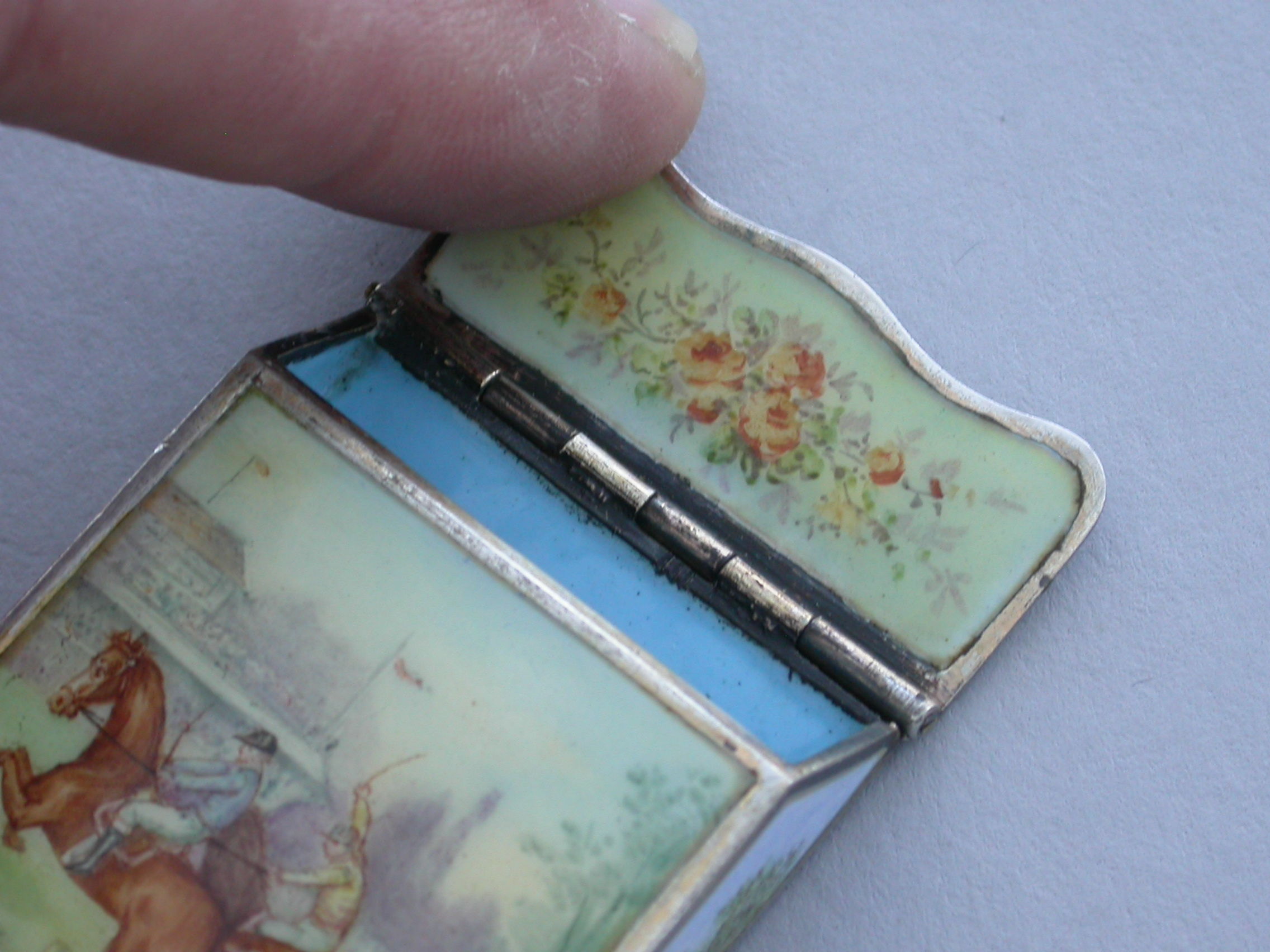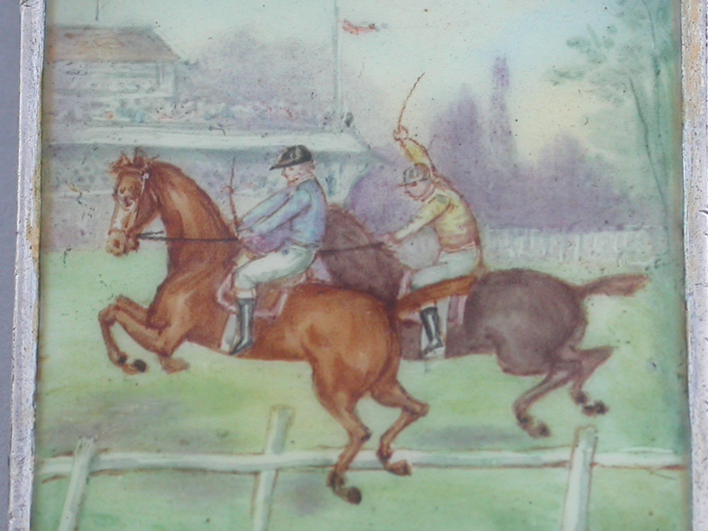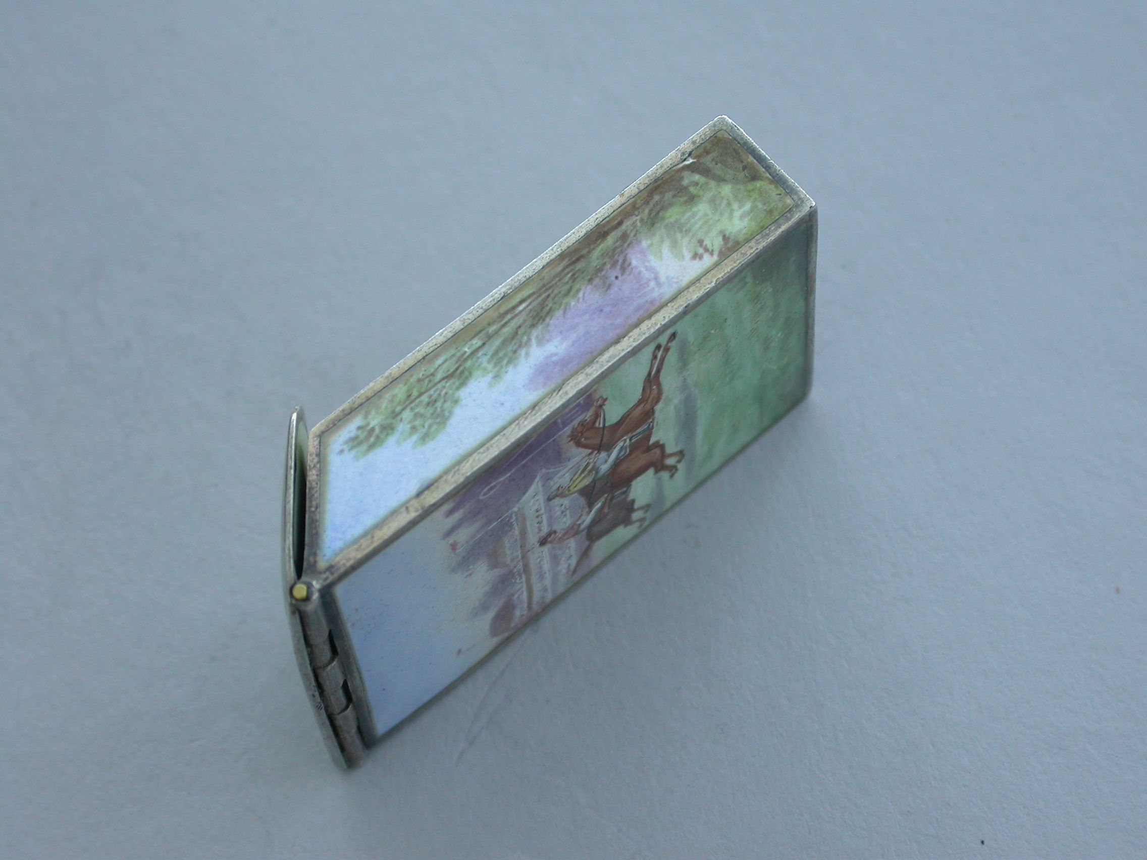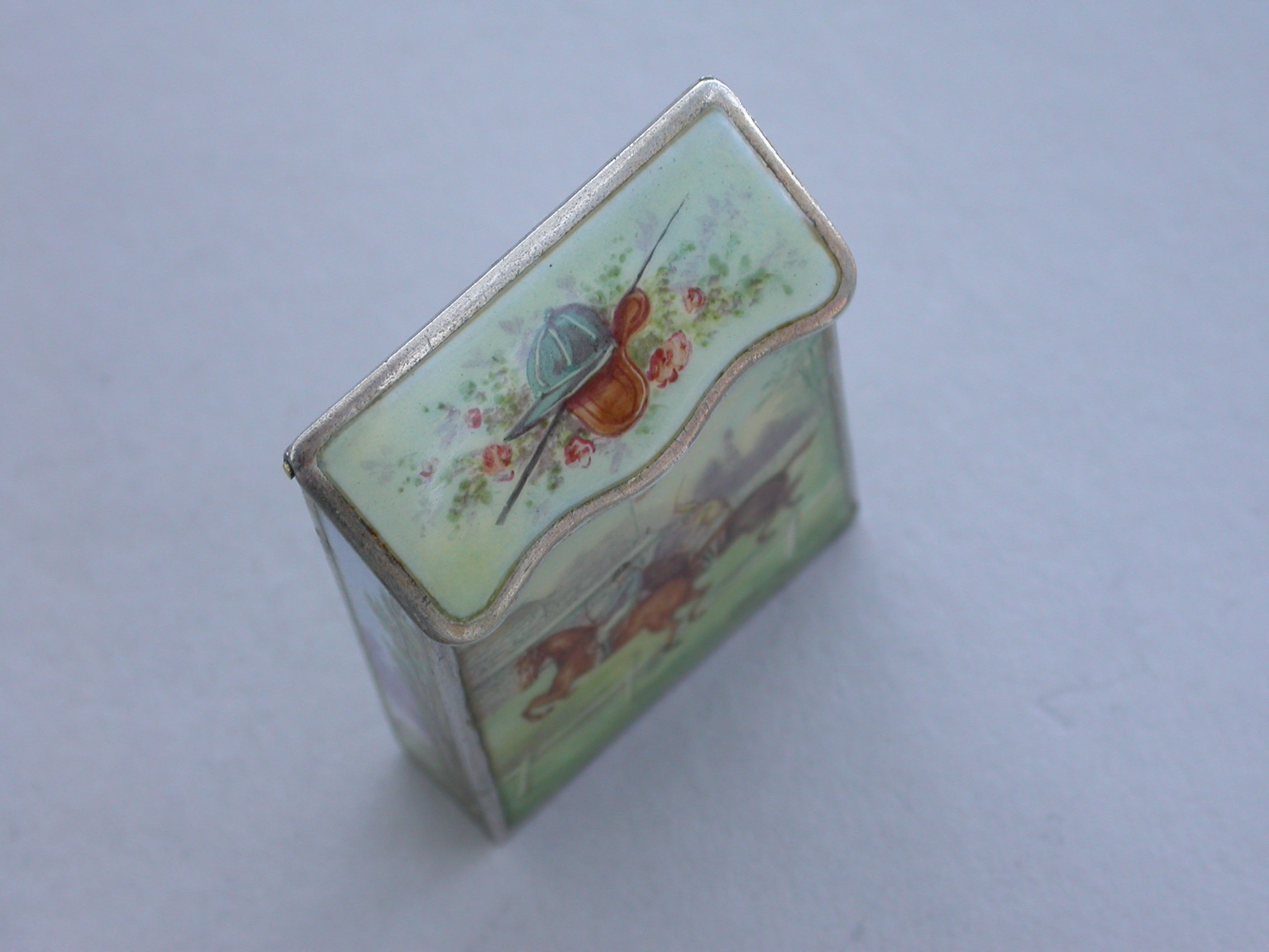 A fine quality late 19th century French silver and enamel Vesta Case of rectangular form with sloping sprung hinged lid, enamelled on all surfaces apart from the base, with horse racing and landscape scenes, including both flat and national hunt type horse racing.