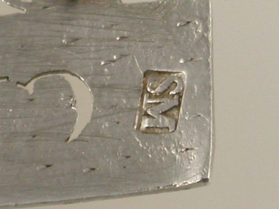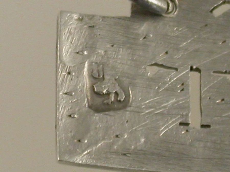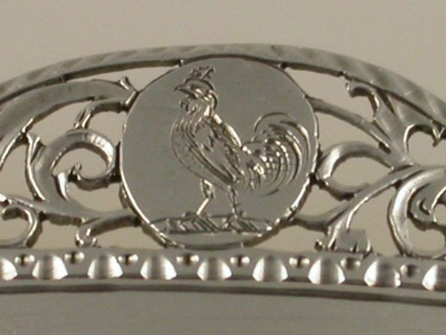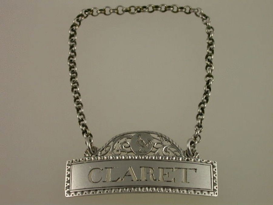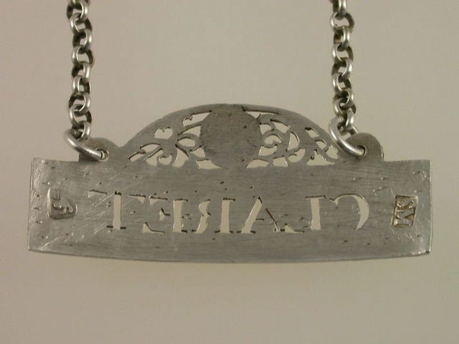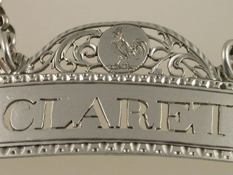 An extremely fine George III 18th century silver Wine Label “fret topped” domed rectangular form, with bright-cut engraved border, the pierced domed surmount with oval cartouche engraved with Cockerel crest, pierced for CLARET.