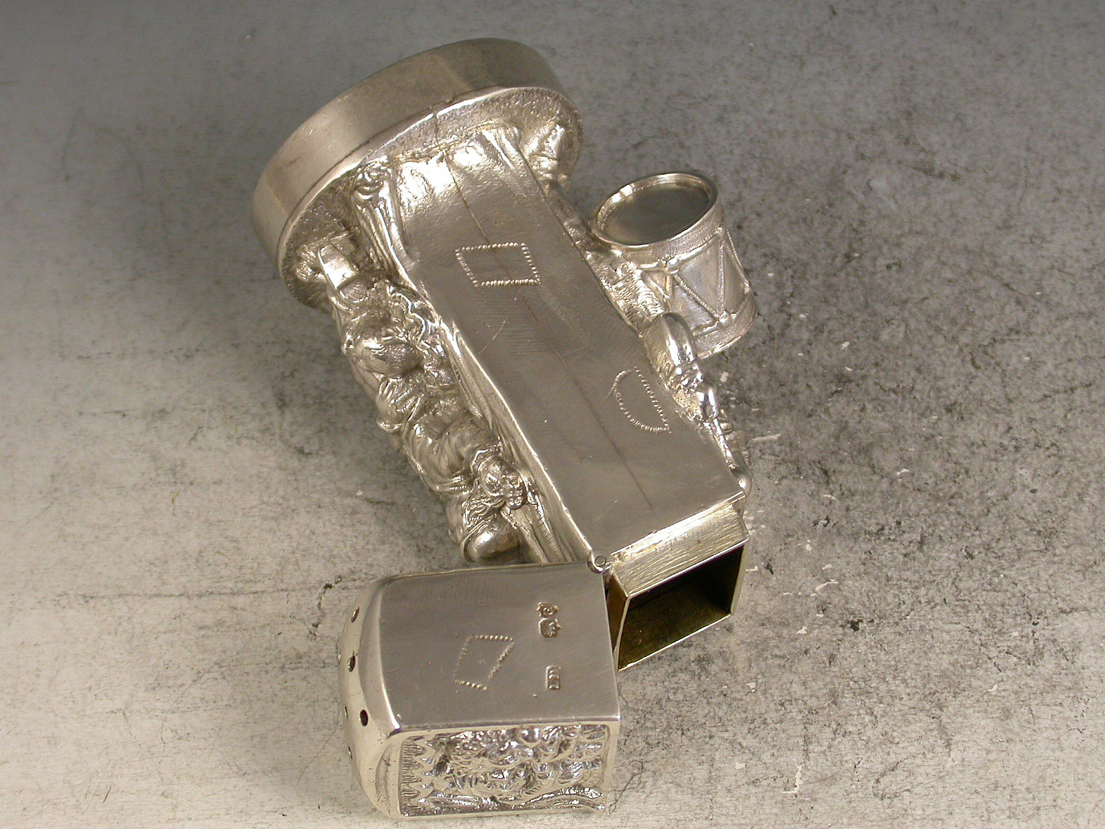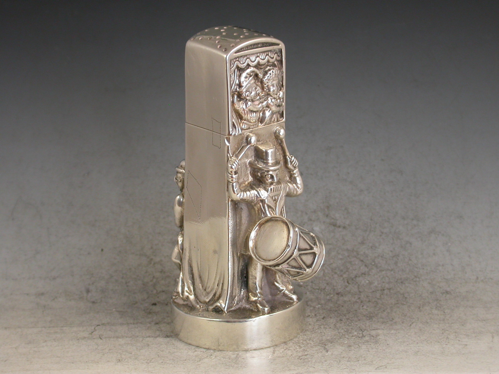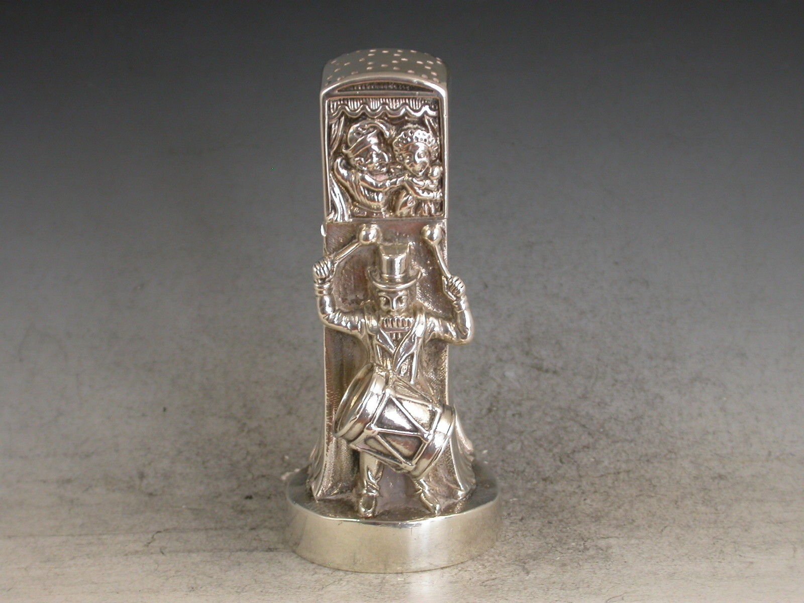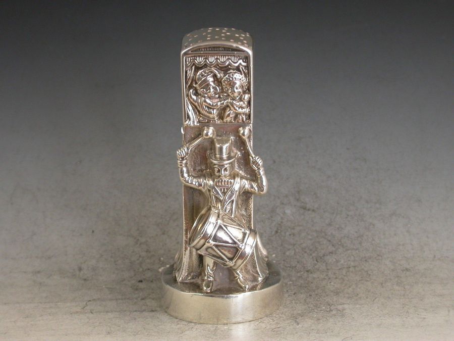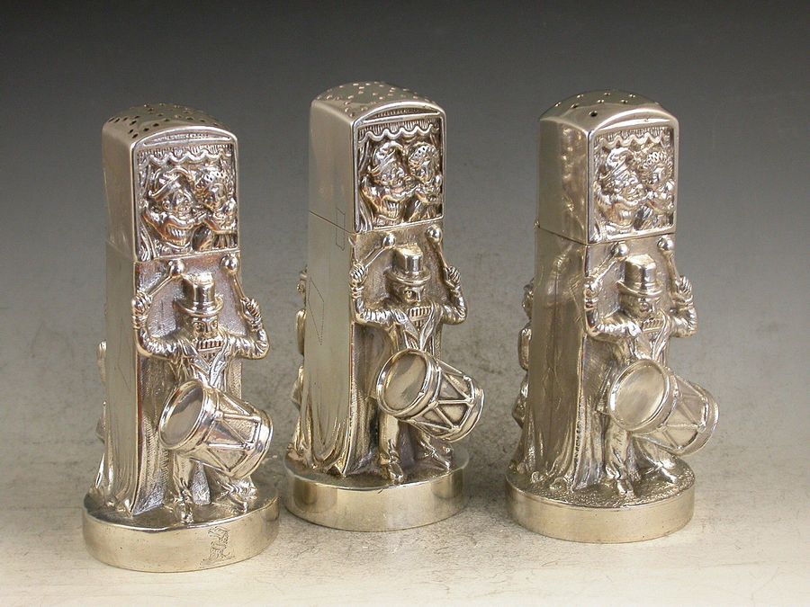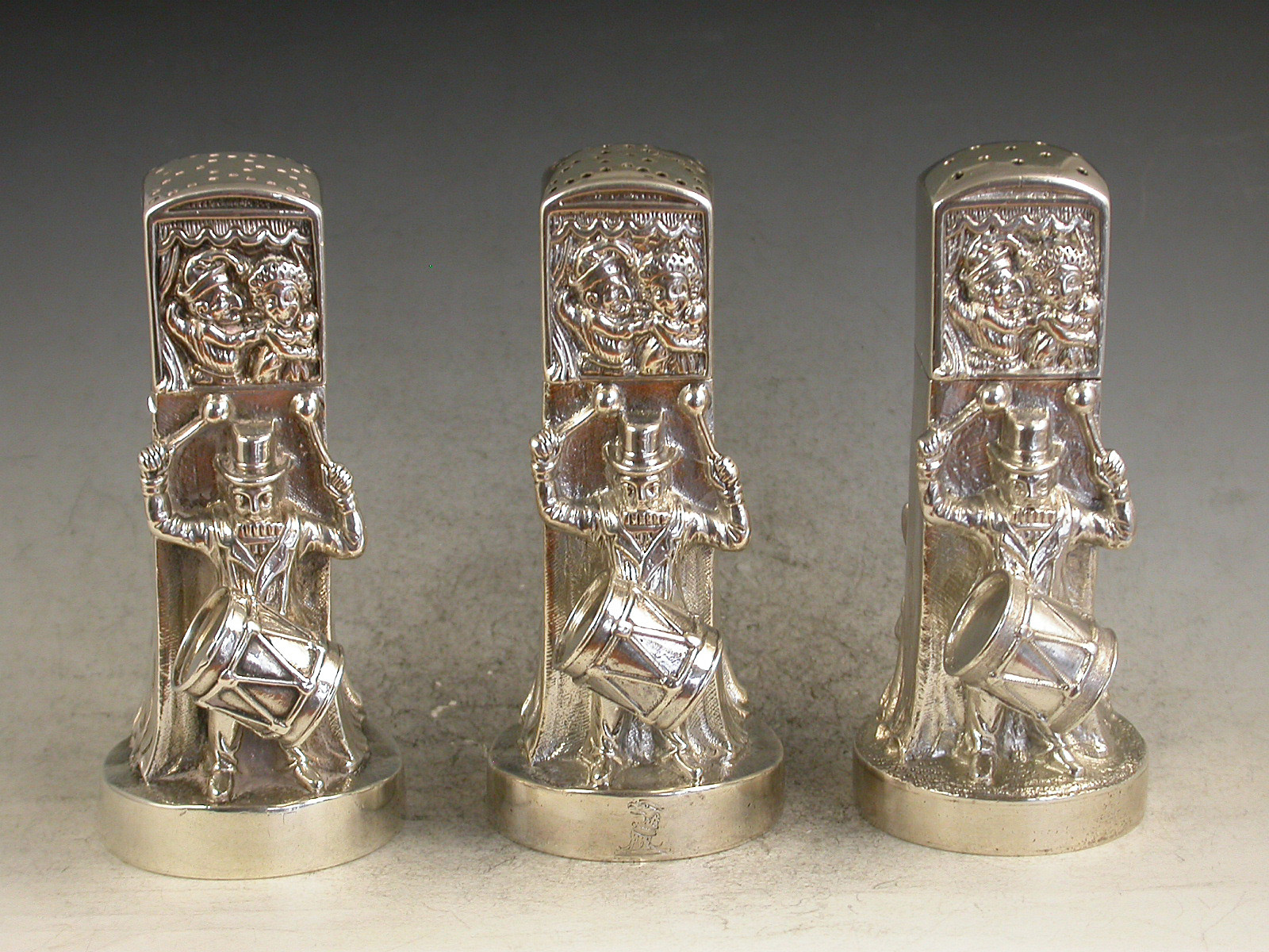 A very fine and unusual Garniture or matched set of three heavy Victorian cast silver Pepper Pots made in the form of Punch and Judy Puppet Booths with Punch and Judy holding the baby to the front along with a ""Bottler"" playing drums and a mouth organ, Toby the dog appears from the back of the booth biting the leg of a fleeing boy.