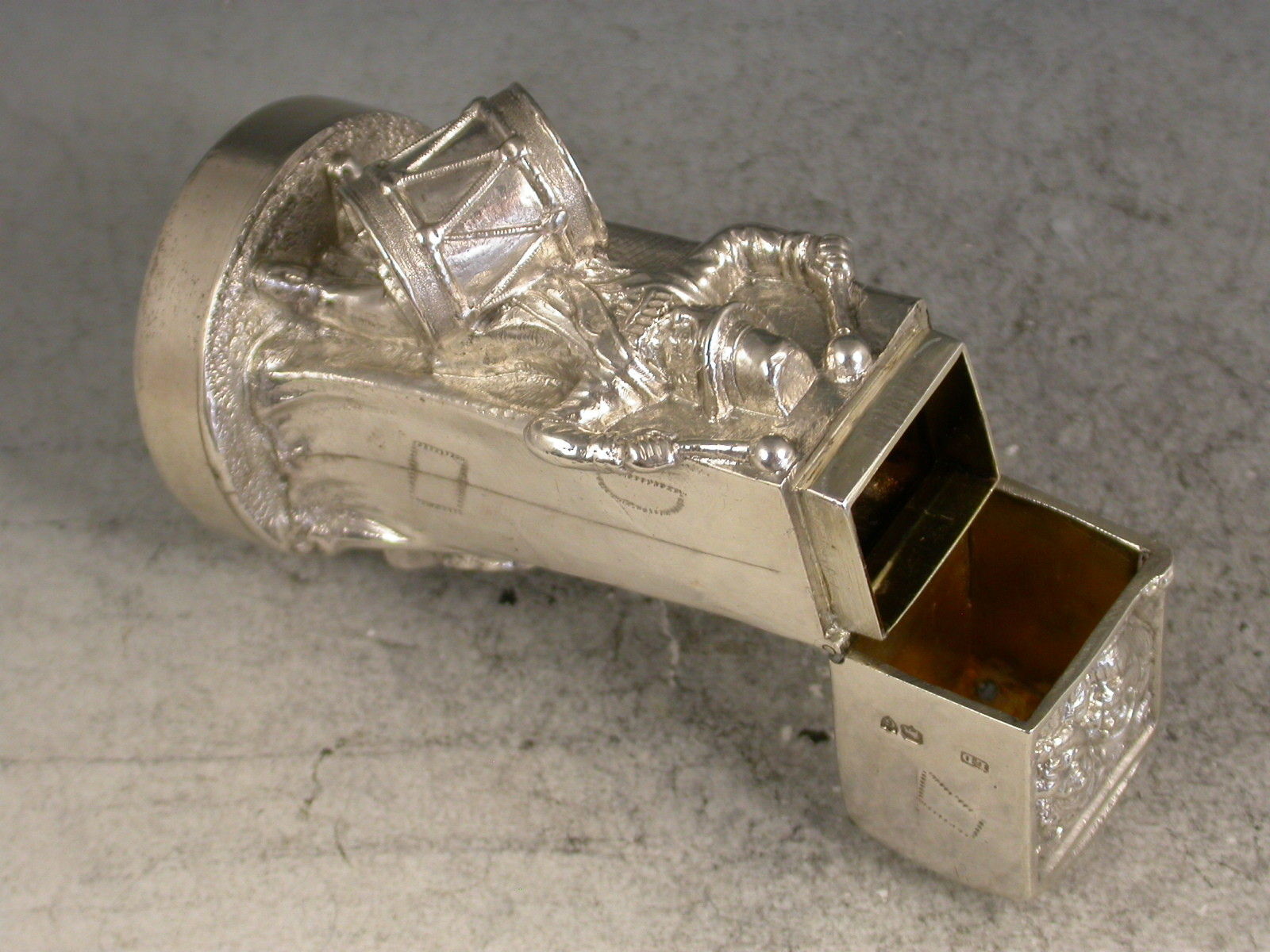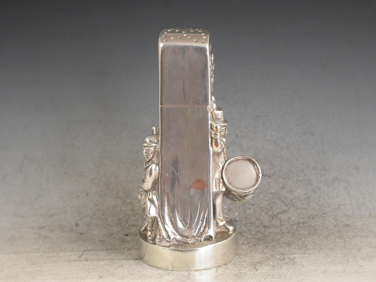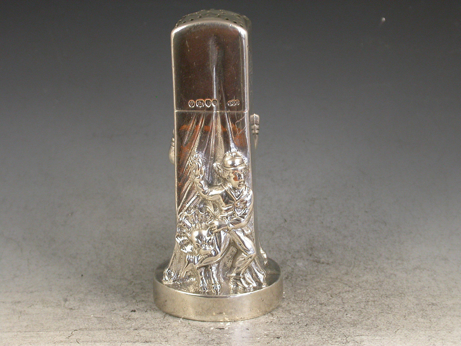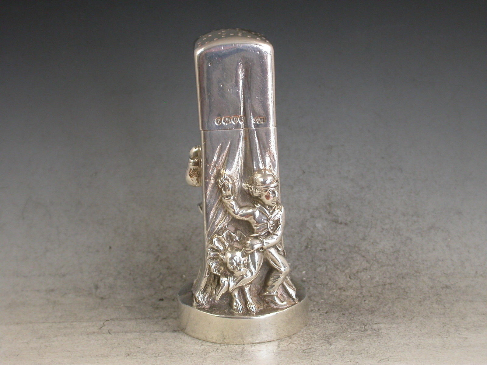 A very fine and unusual Garniture or matched set of three heavy Victorian cast silver Pepper Pots made in the form of Punch and Judy Puppet Booths with Punch and Judy holding the baby to the front along with a ""Bottler"" playing drums and a mouth organ, Toby the dog appears from the back of the booth biting the leg of a fleeing boy.