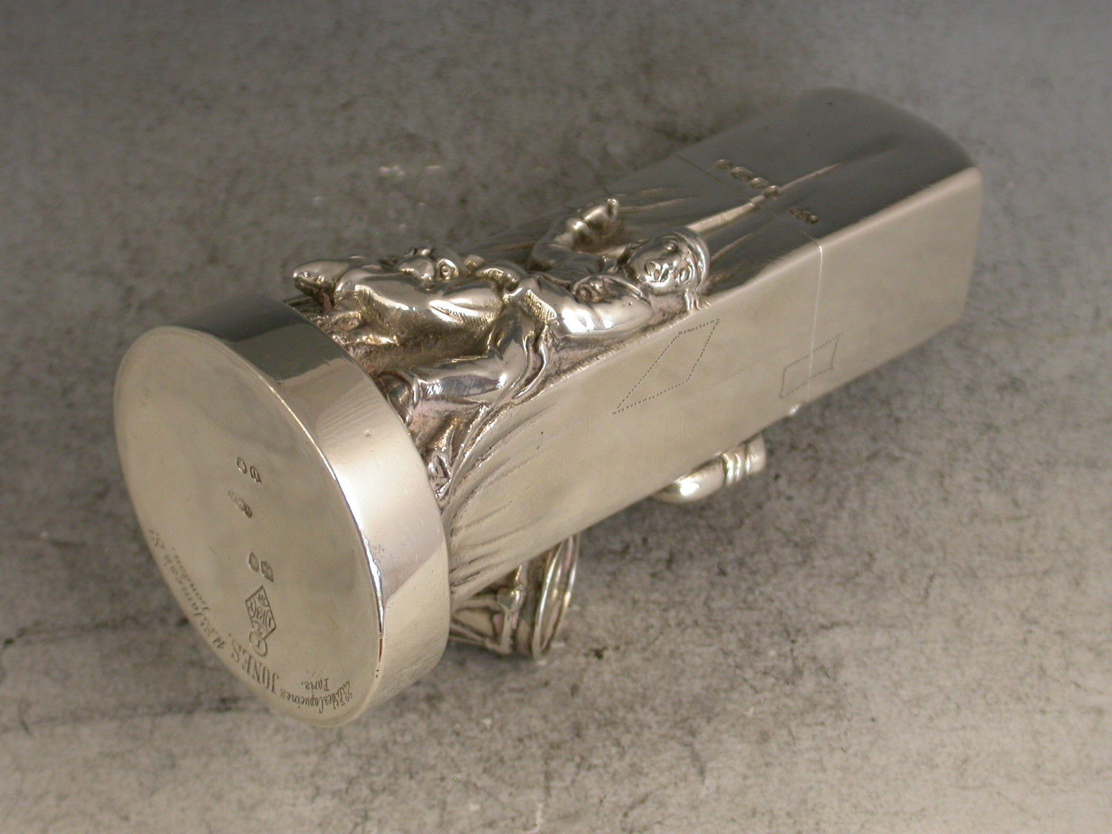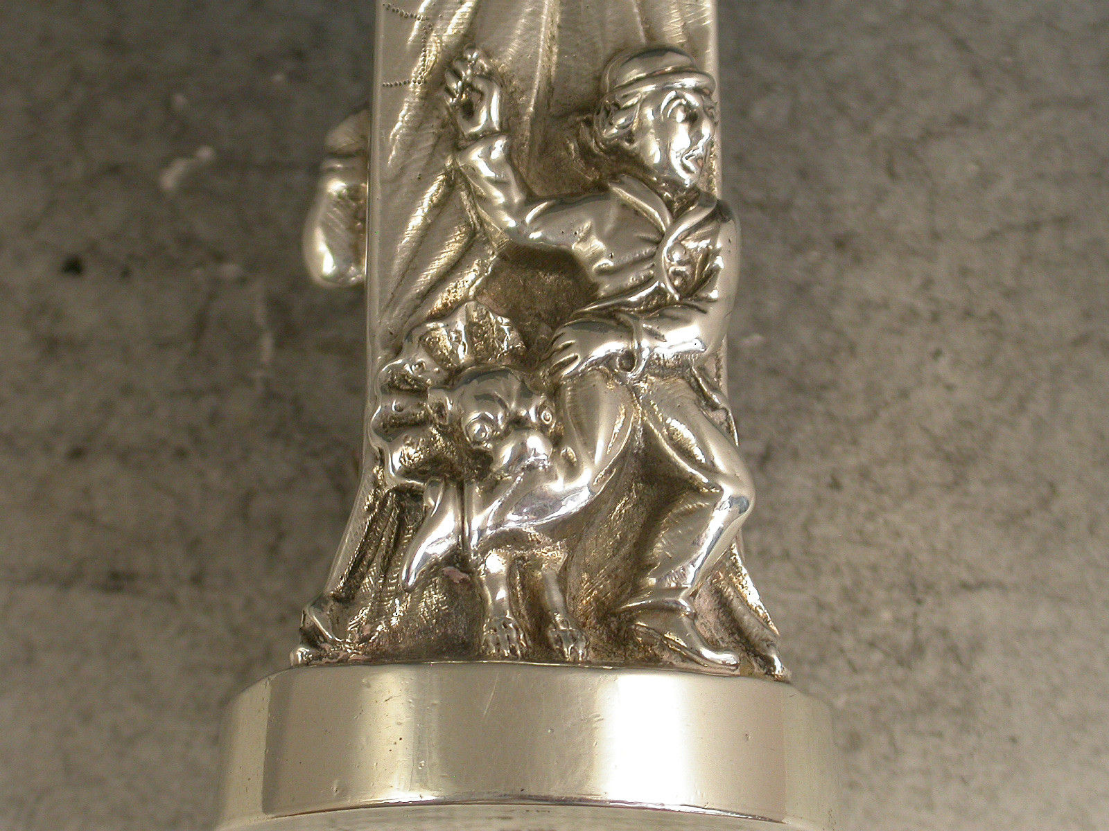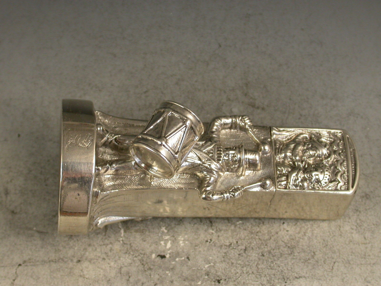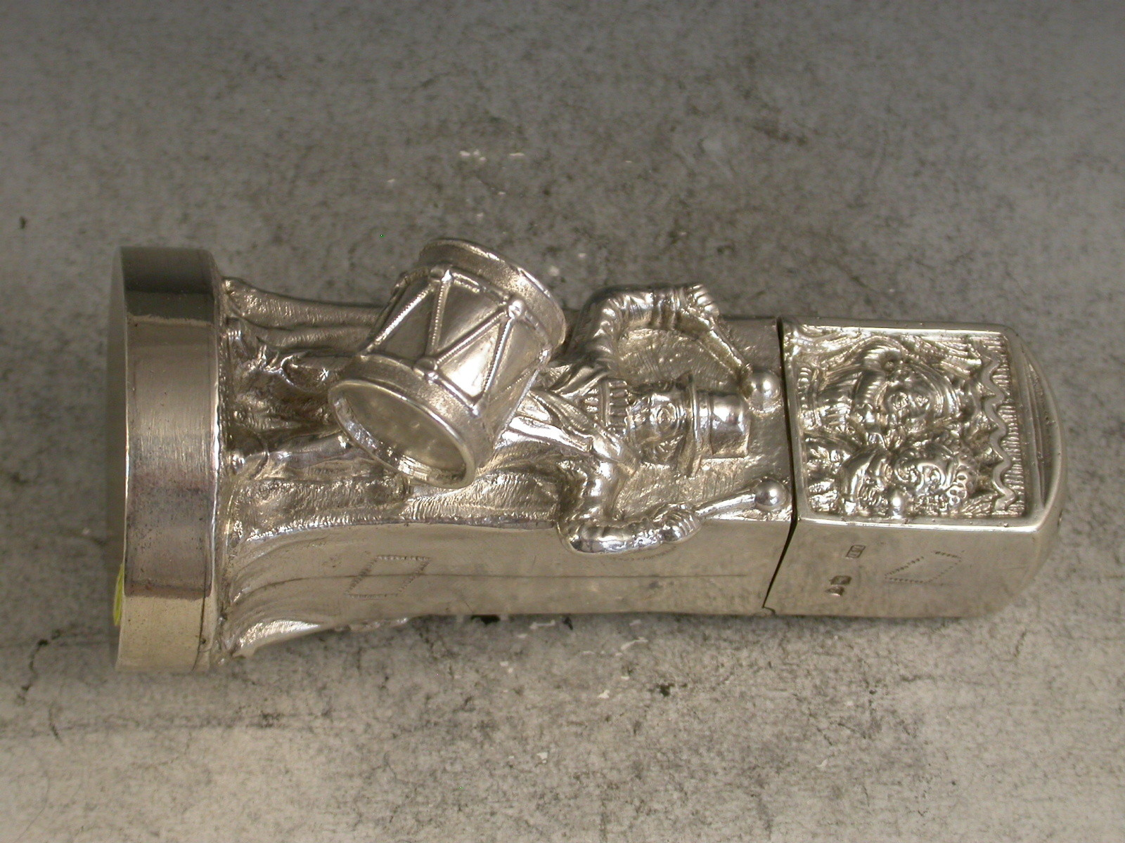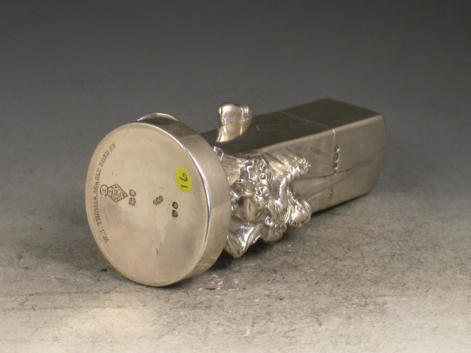 A very fine and unusual Garniture or matched set of three heavy Victorian cast silver Pepper Pots made in the form of Punch and Judy Puppet Booths with Punch and Judy holding the baby to the front along with a ""Bottler"" playing drums and a mouth organ, Toby the dog appears from the back of the booth biting the leg of a fleeing boy.