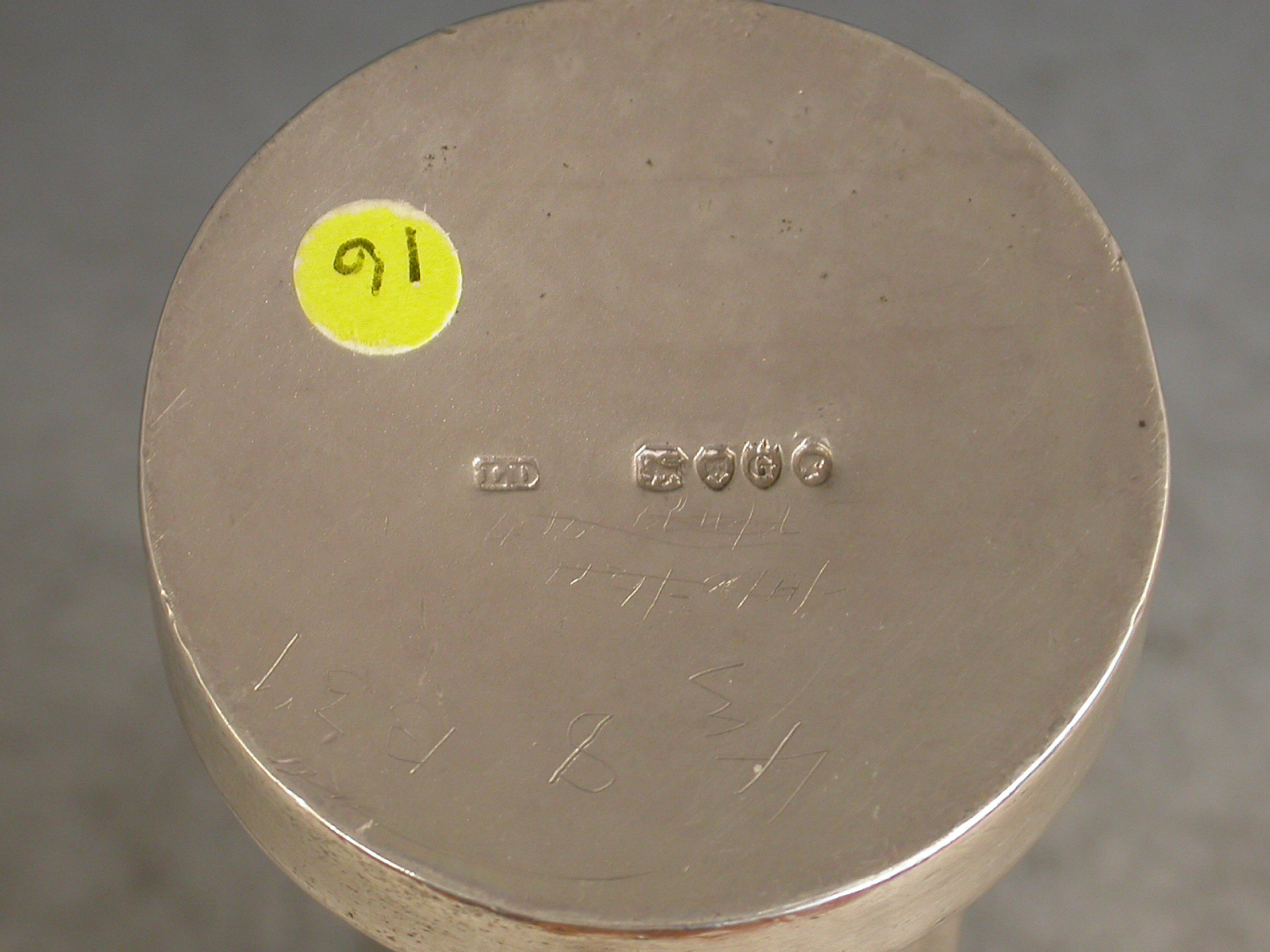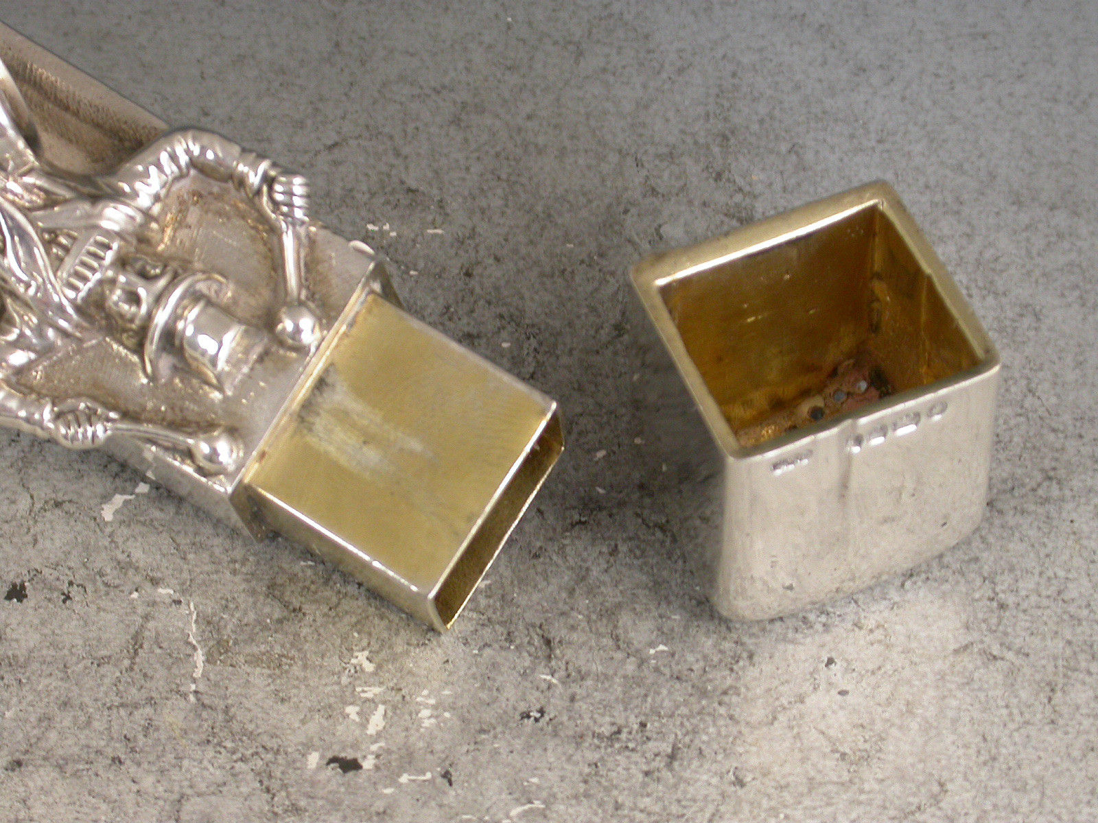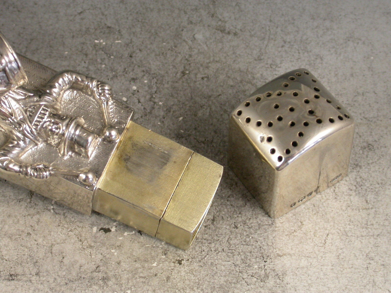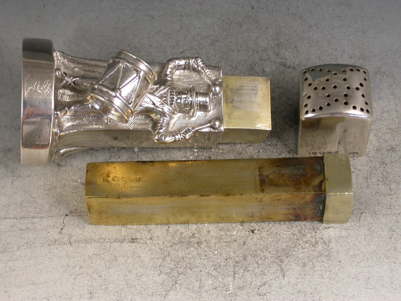 Although the three were probably cast from the same mould there are differences to the covers of each pepper. One with a pull off cover, one with a hinged cover and one with a pull off cover revealing a tubular insert. All with silver gilt interiors. Slight differences to the piercing on the L.Dee example.
