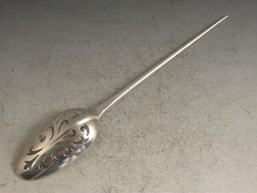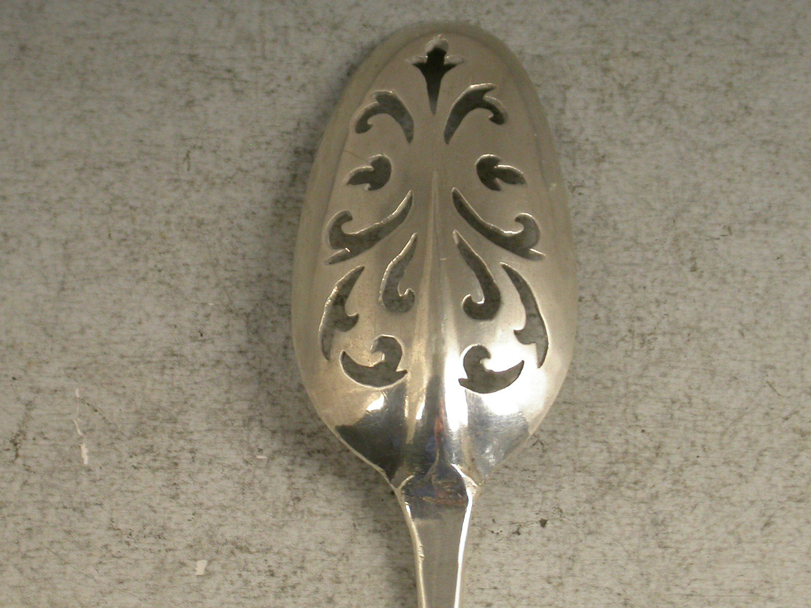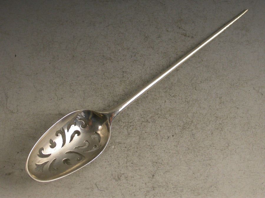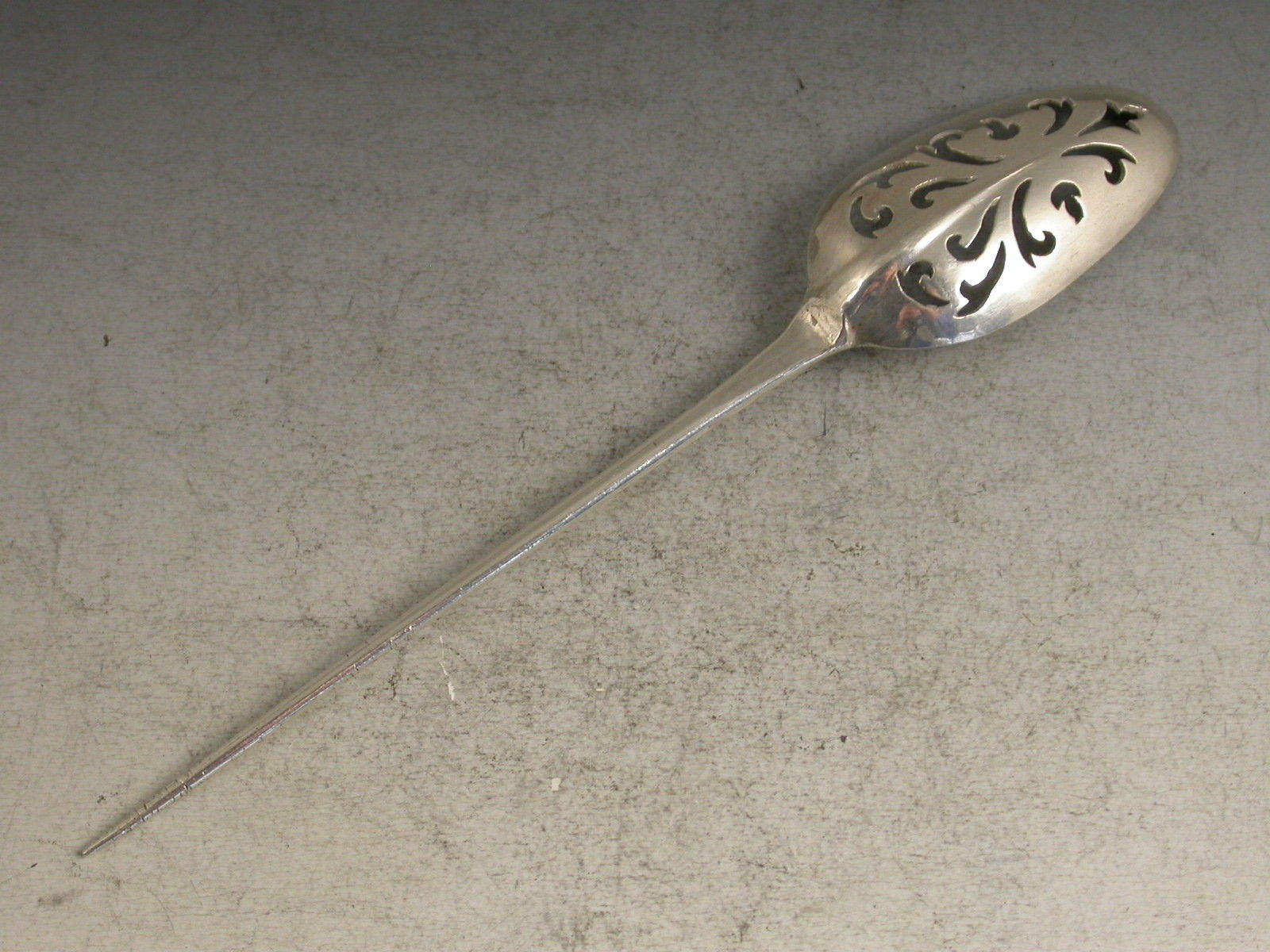A rare George I early 18th century silver Mote Spoon, the plain tapering handle terminating in a point with no barb or finial, the oval bowl with plain rat-tail and pierced with scrolls, mushrooms and a fleur-de-lys in a relatively spaced out manner.