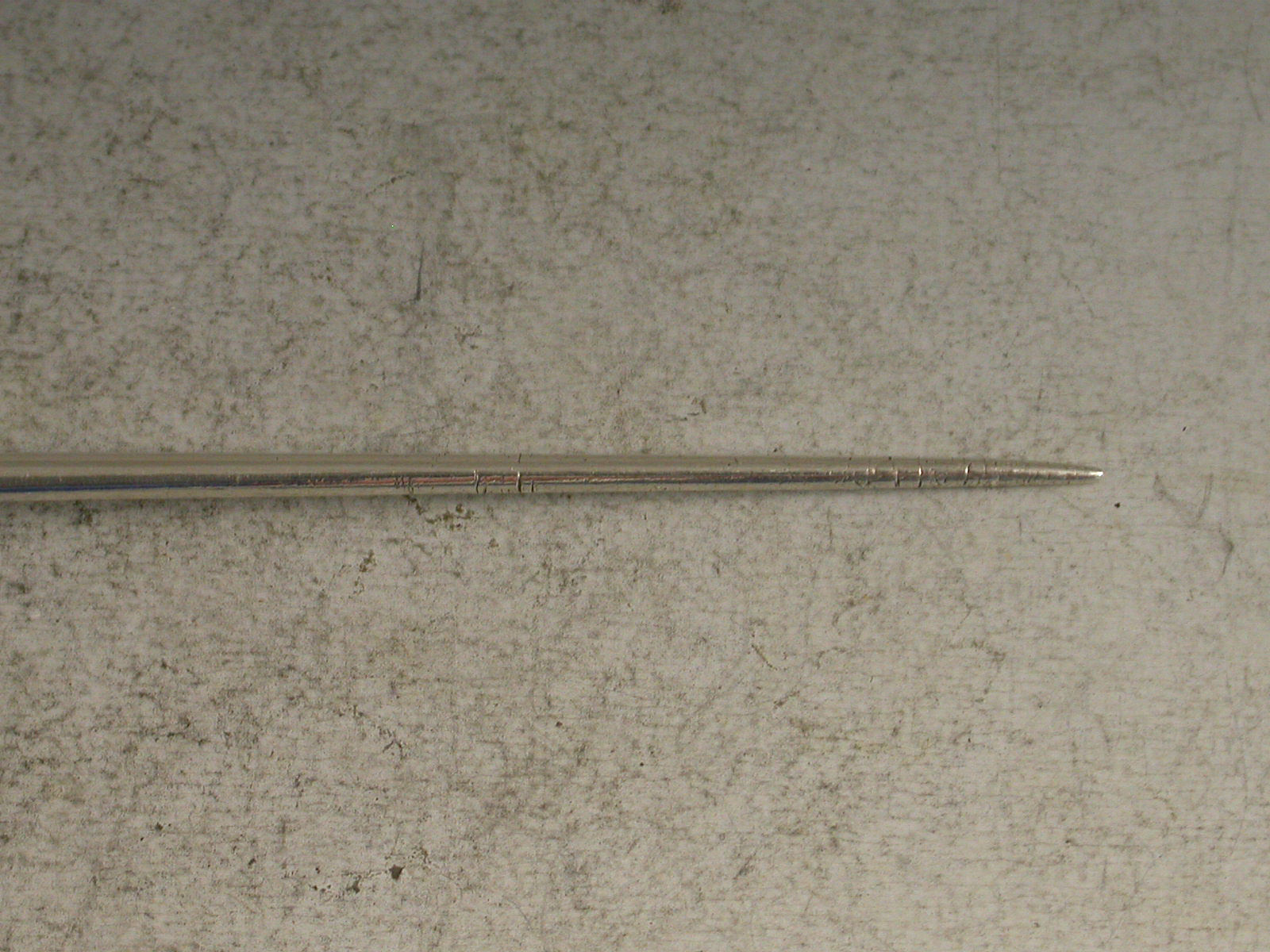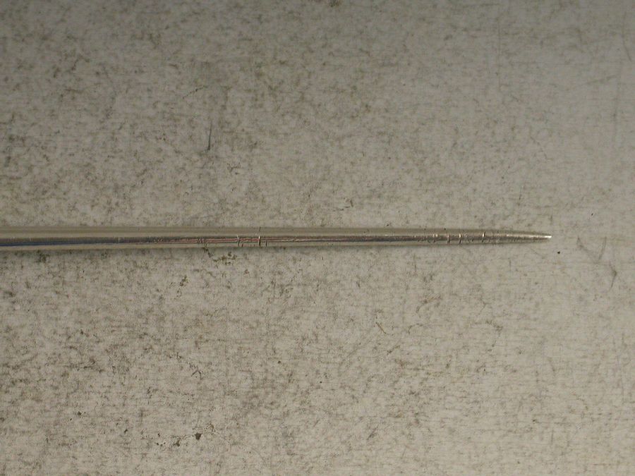 In good condition with no damage or repair, the pointed terminal with a few scuffs and nicks where it has been used for its purpose of clearing the spout grill inside a teapot.