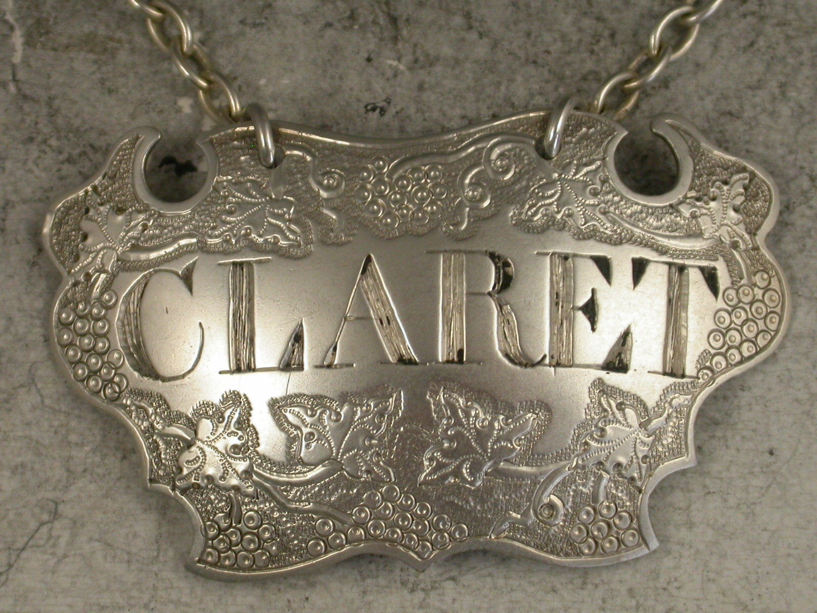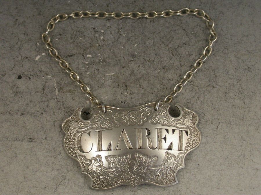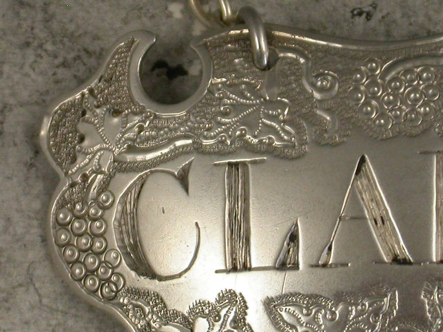 A good George II silver Wine Label of flat-chased escutcheon form, incised for Claret between vine leaf and grape decoration on a textured background.