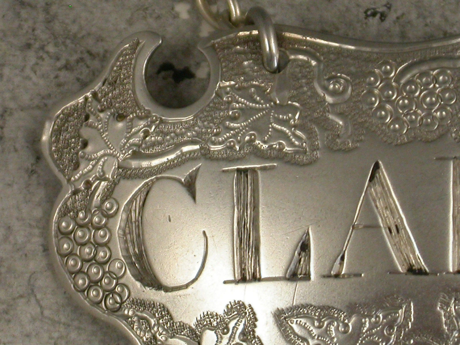 George II Antique Silver Chased Escutcheon Wine Label 'Claret'