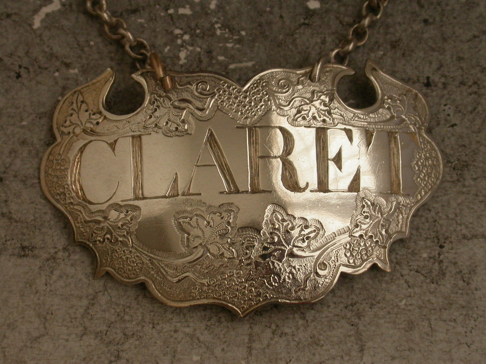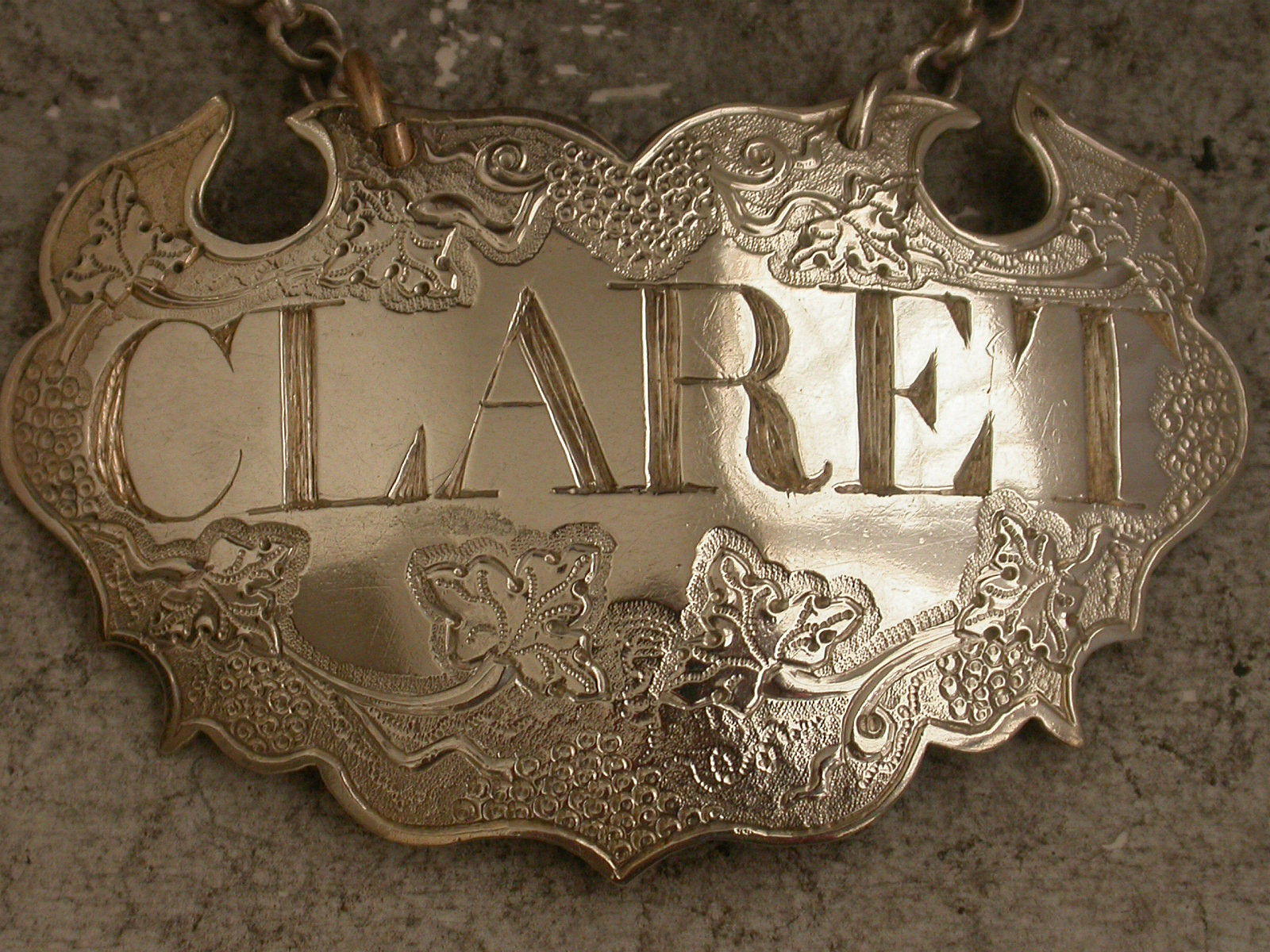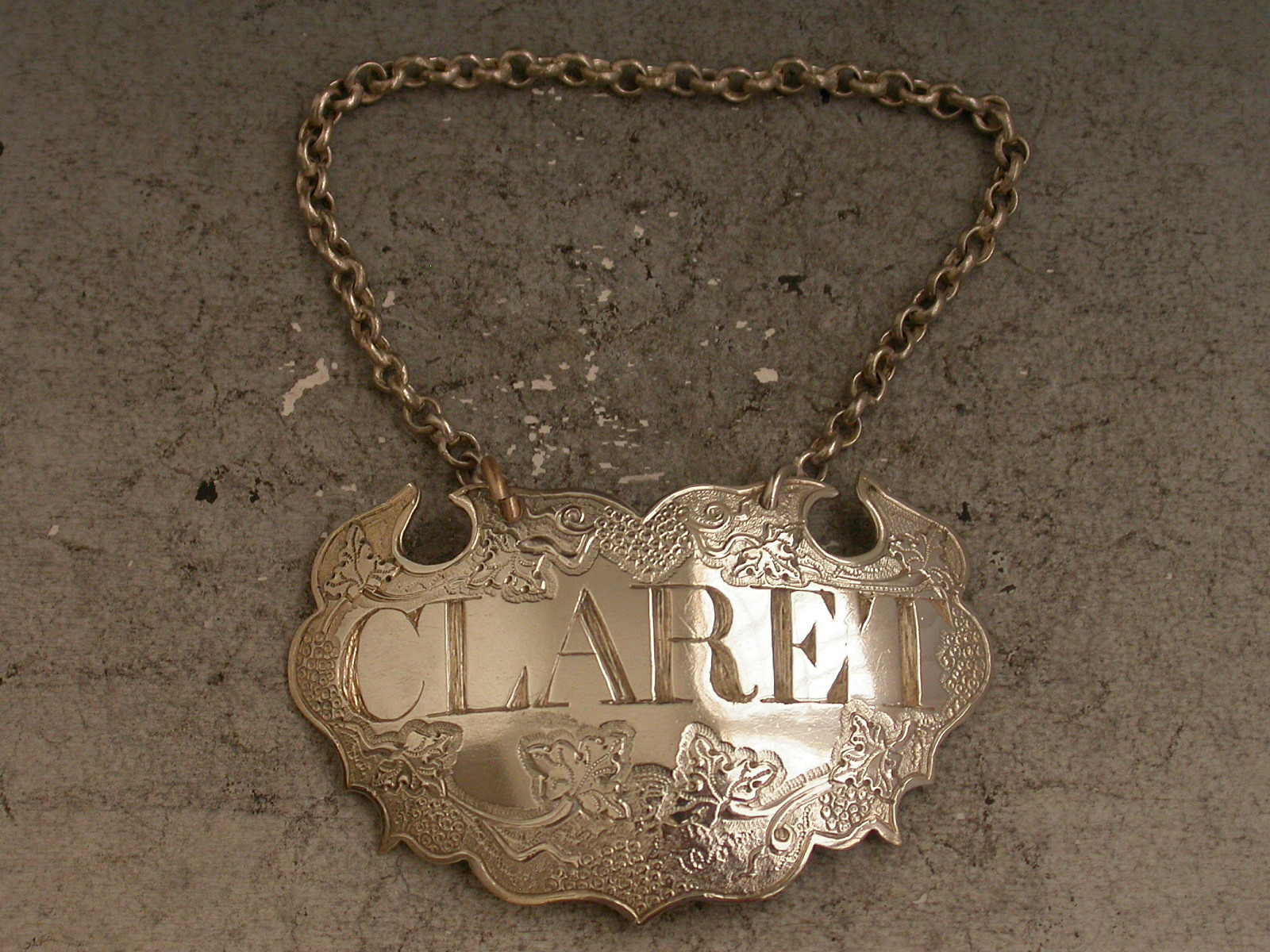 A fine George II silver Wine Label of chased escutcheon form decorated with vine leaves and grapes on a matt background, incised for Claret in bold large letters.