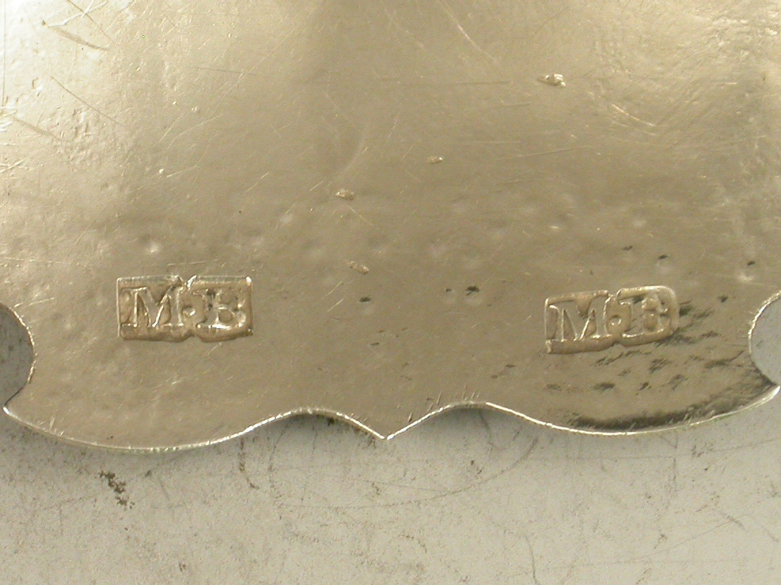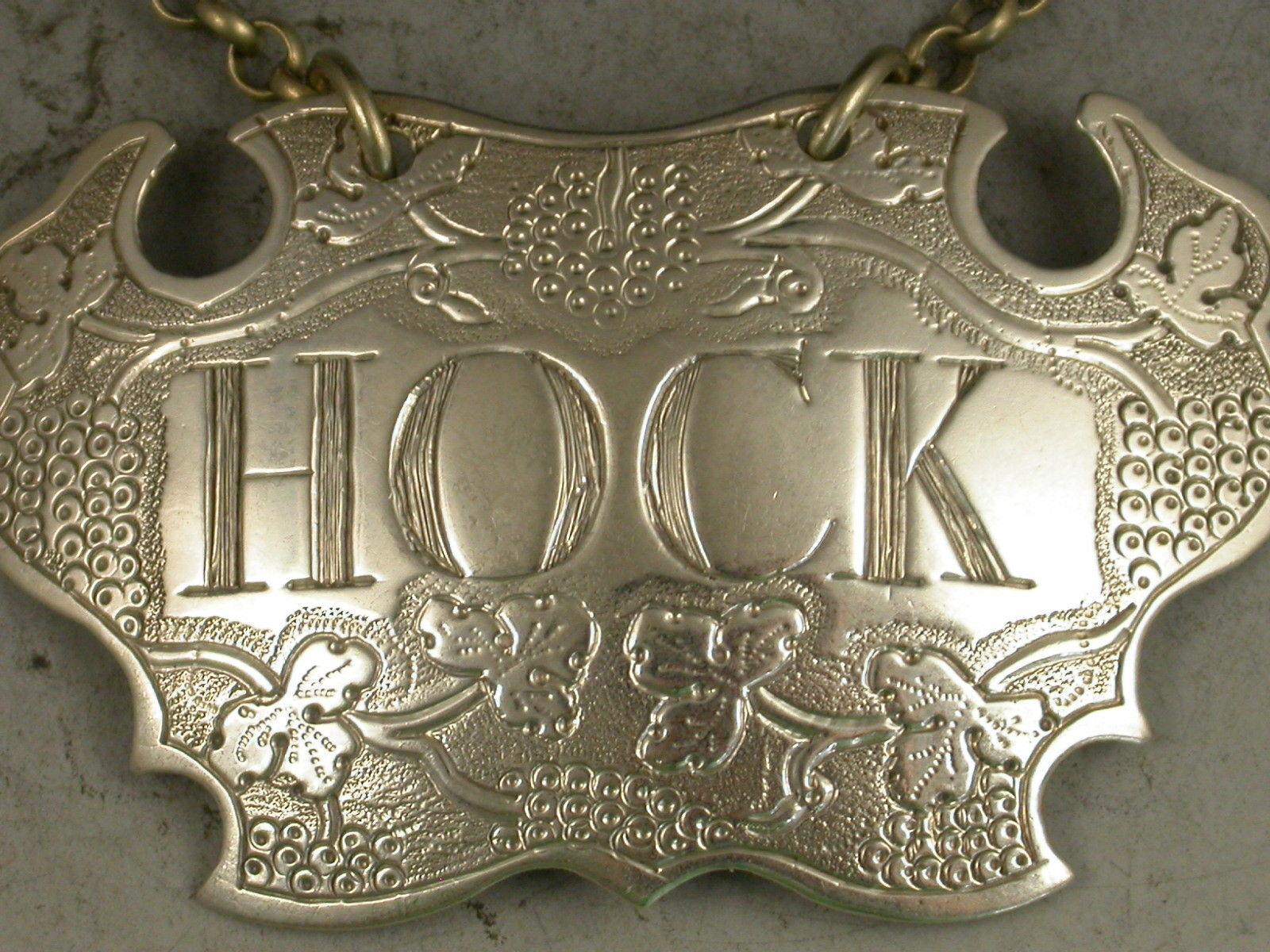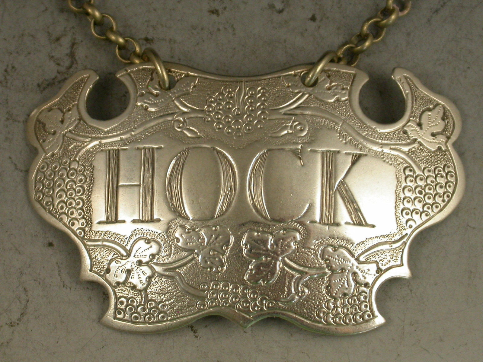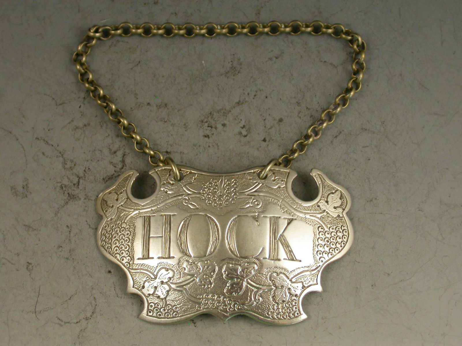 A good George II silver Wine Label of chased escutcheon form, incised for Hock between vine leaf and grape decoration on a textured background.