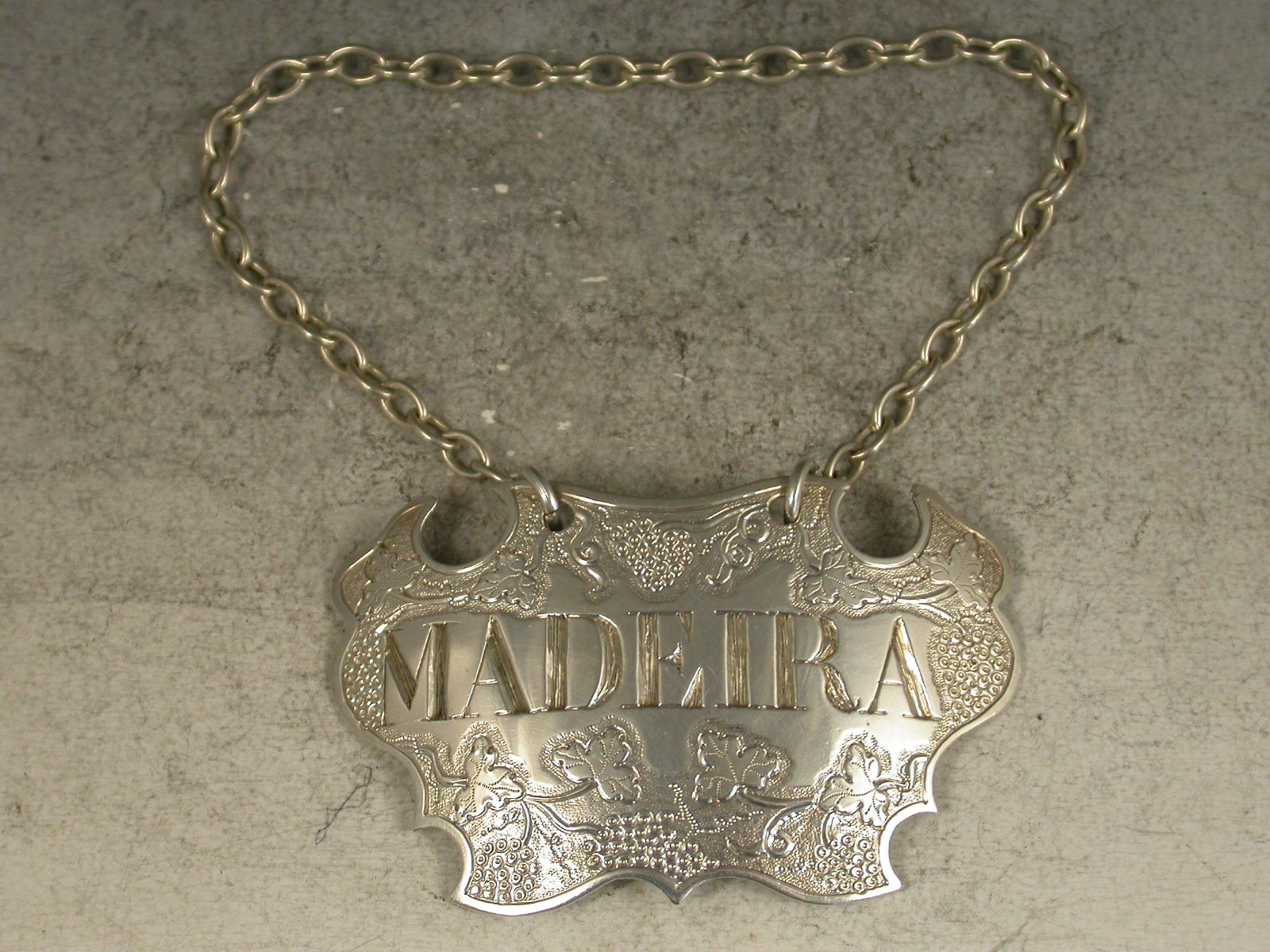 A good George II silver Wine Label of flat-chased escutcheon form, incised for Madeira between vine leaf and grape decoration on a textured background.