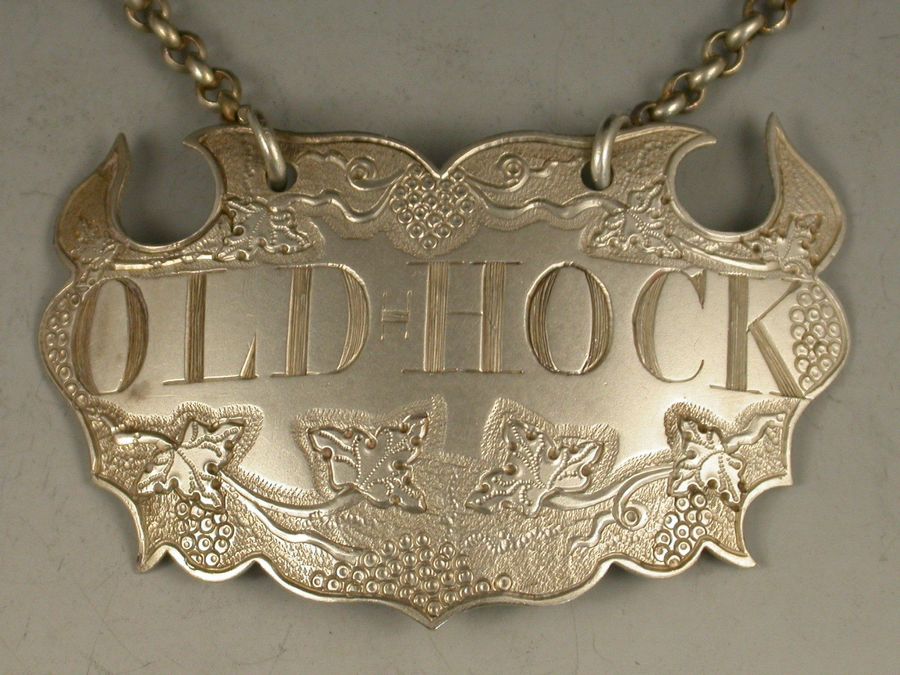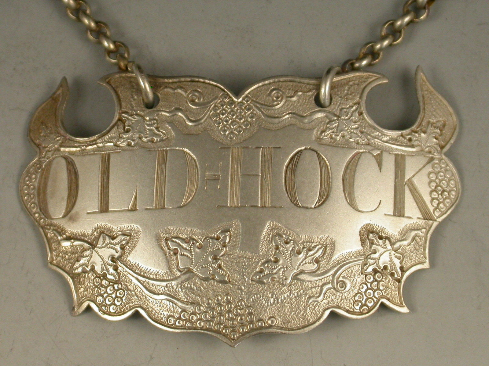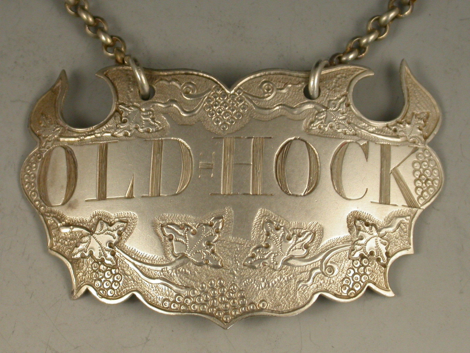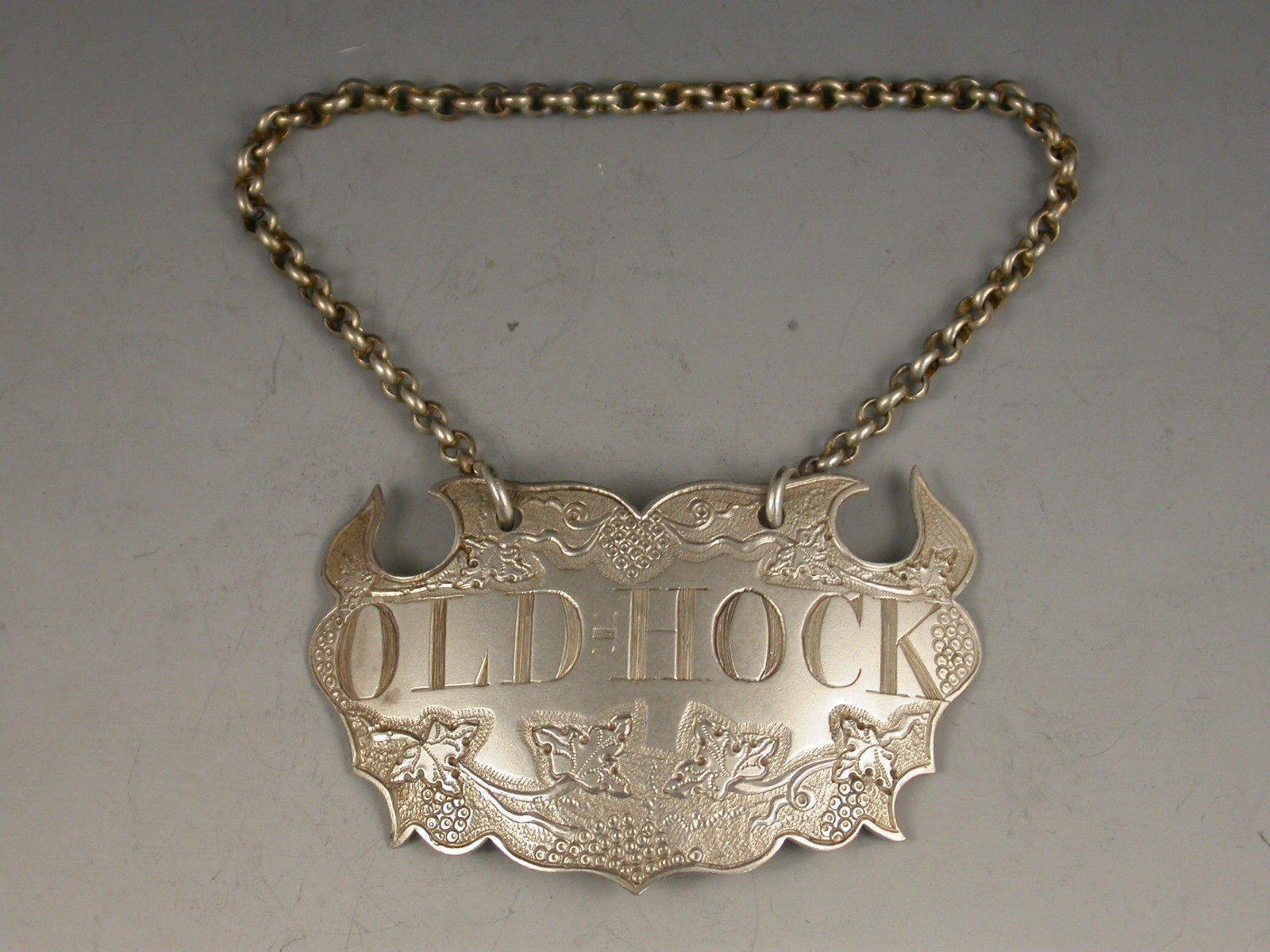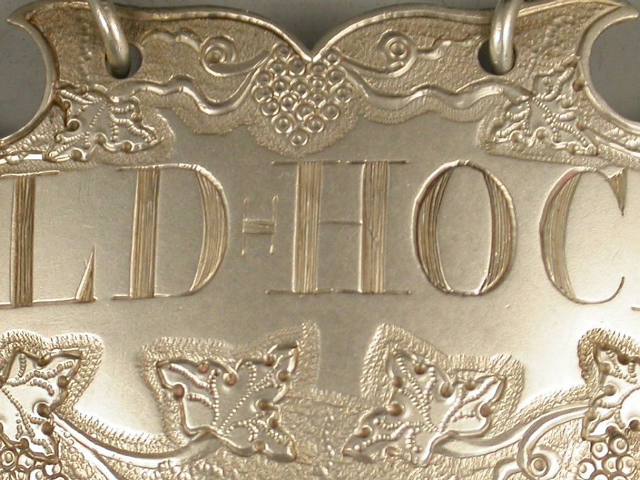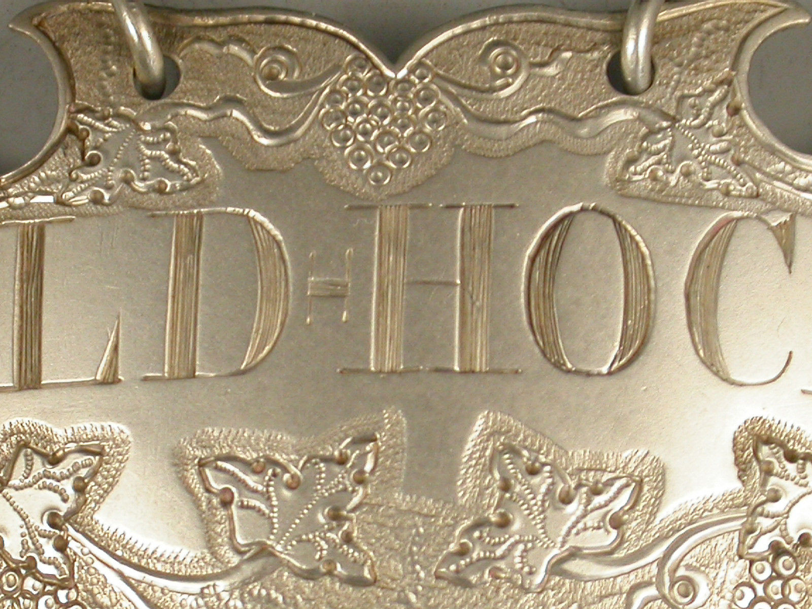 A fine George II silver Wine Label of chased escutcheon form, decorated with vine leaves and grapes on a textured background above and below the incised title for Old Hock.