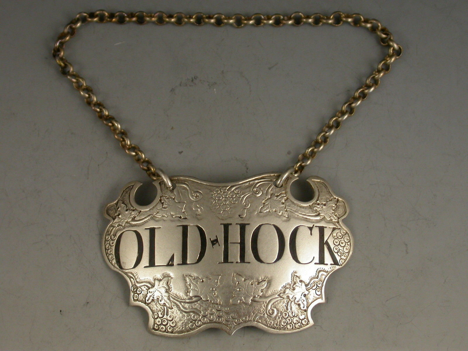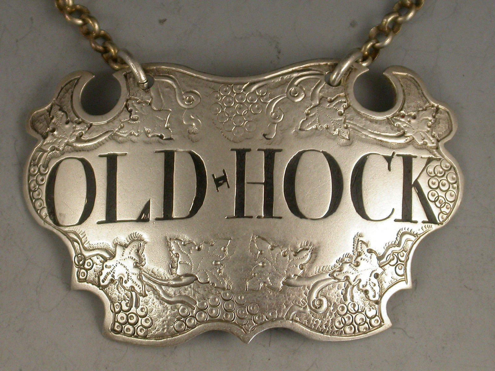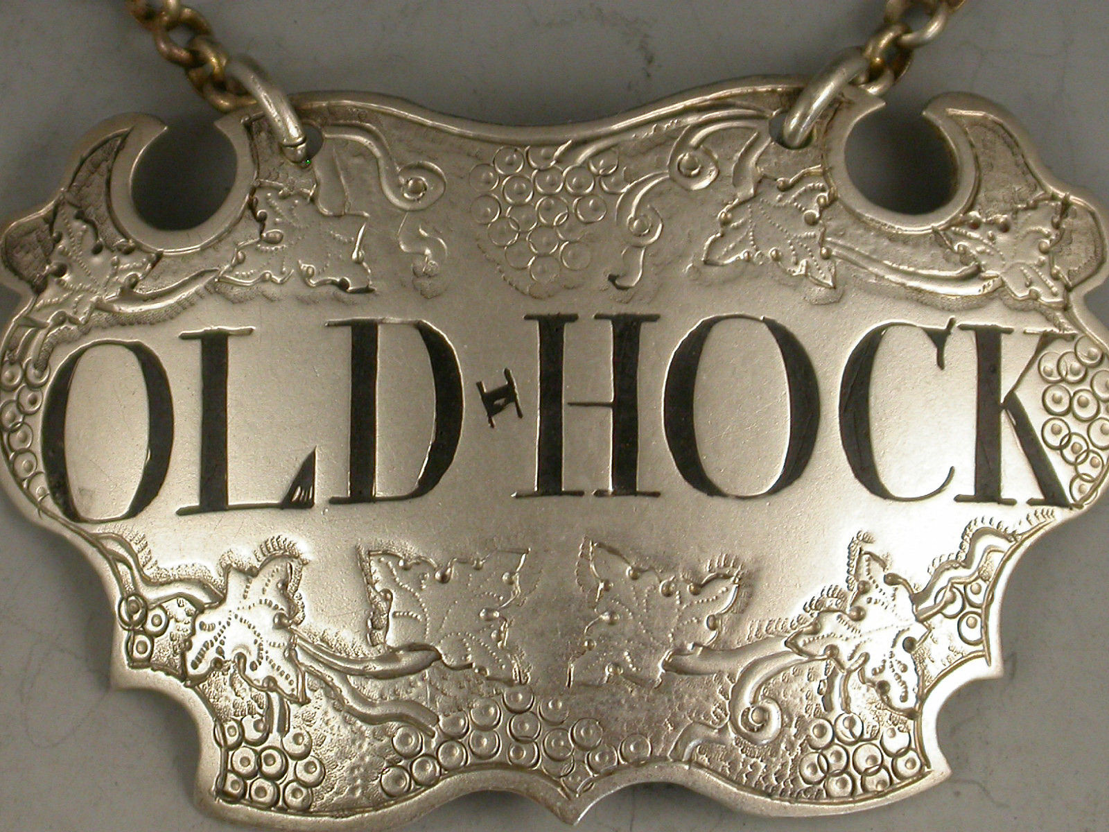 A fine George II silver Wine Label of chased escutcheon form, decorated with vine leaves and grapes on a textured background above and below the incised and niello filled title for Old Hock.