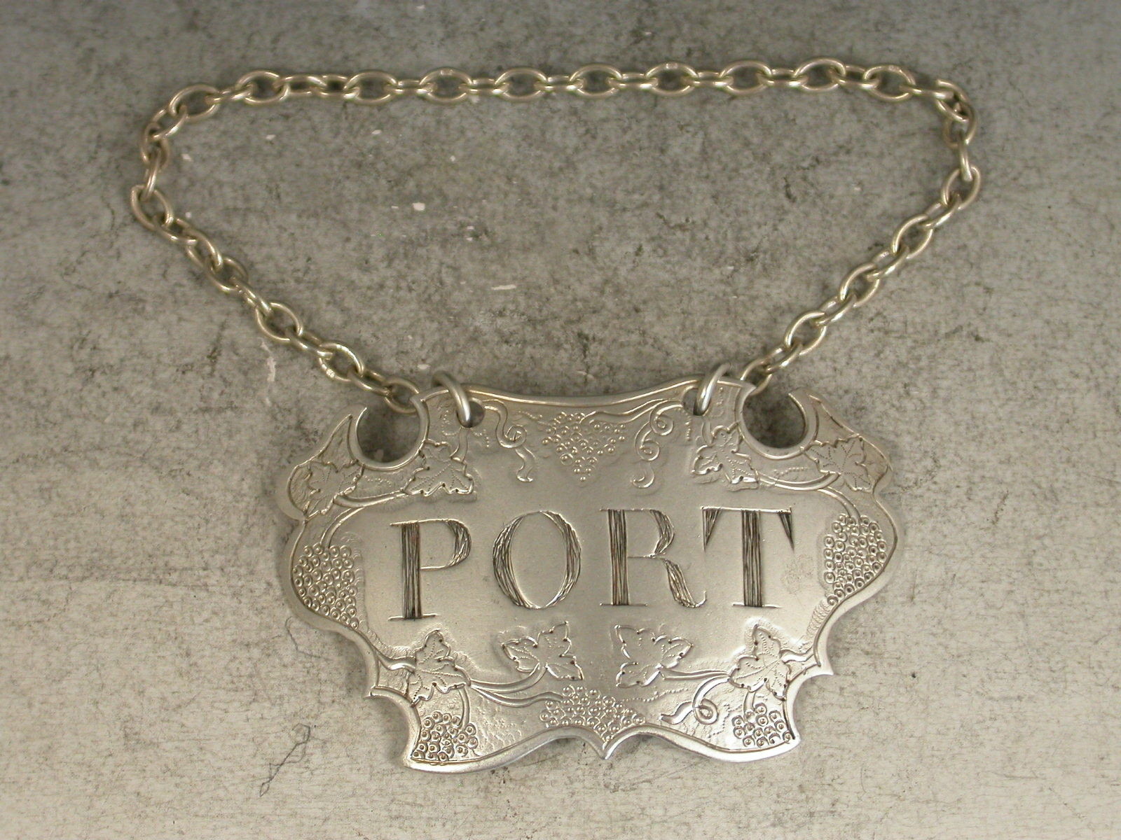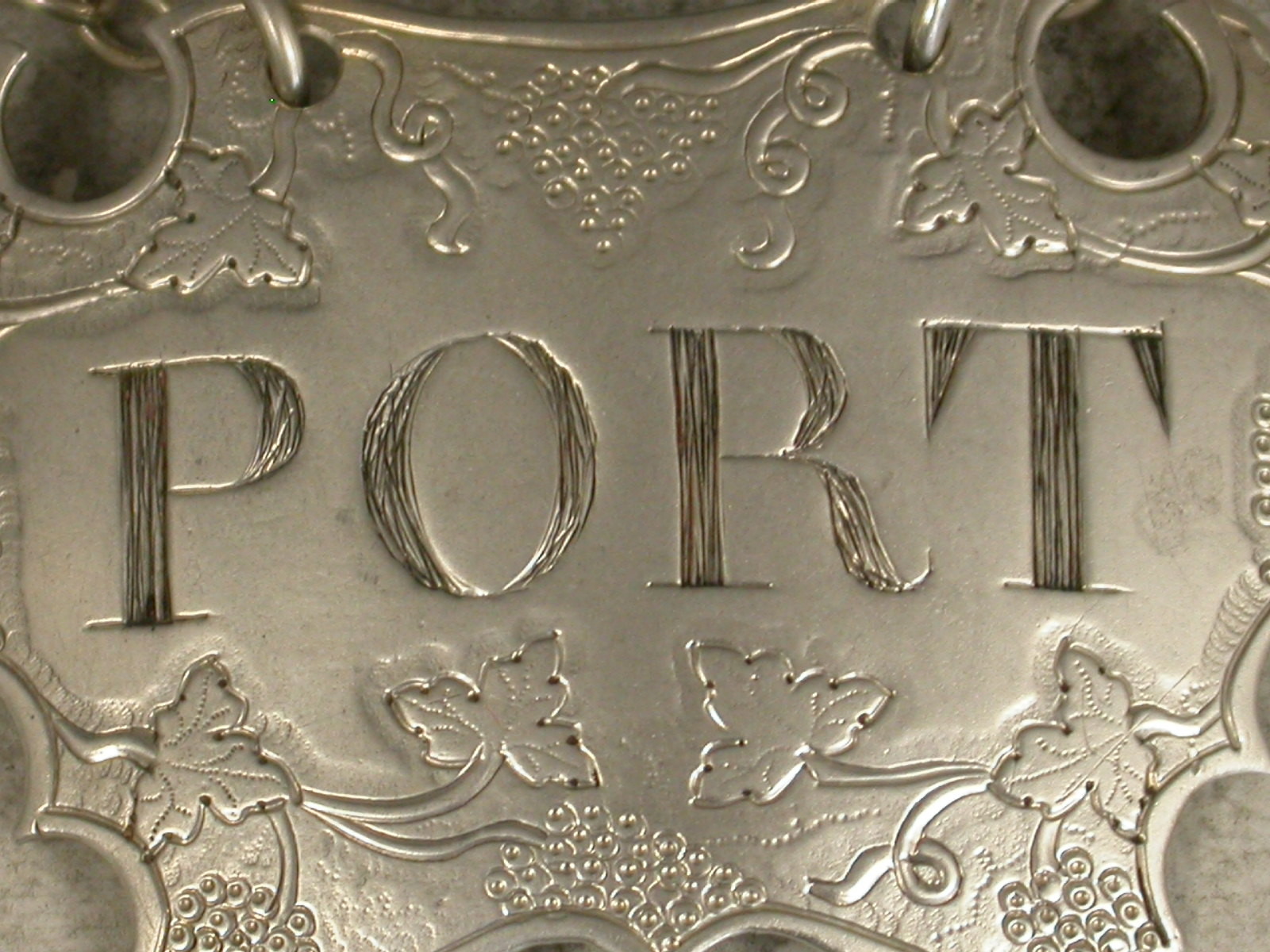 A good George II silver Wine Label of flat-chased escutcheon form, incised for Port between vine leaf and grape decoration on a textured background.