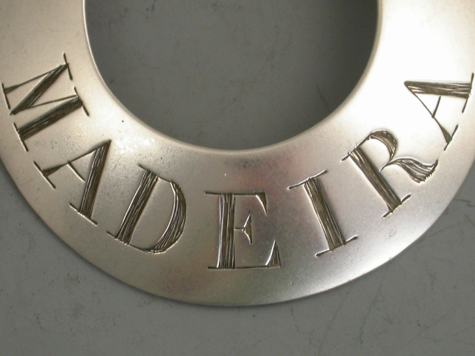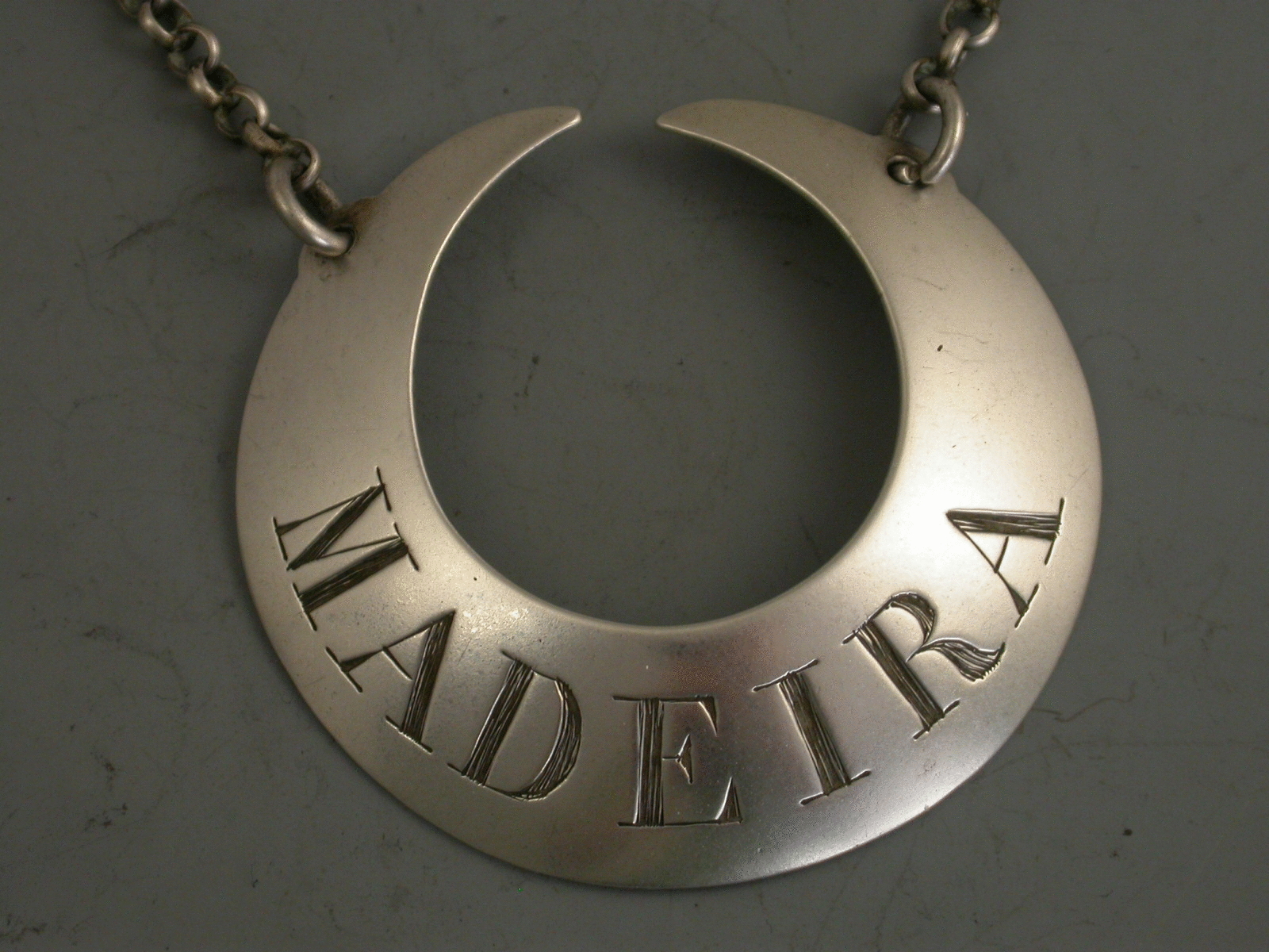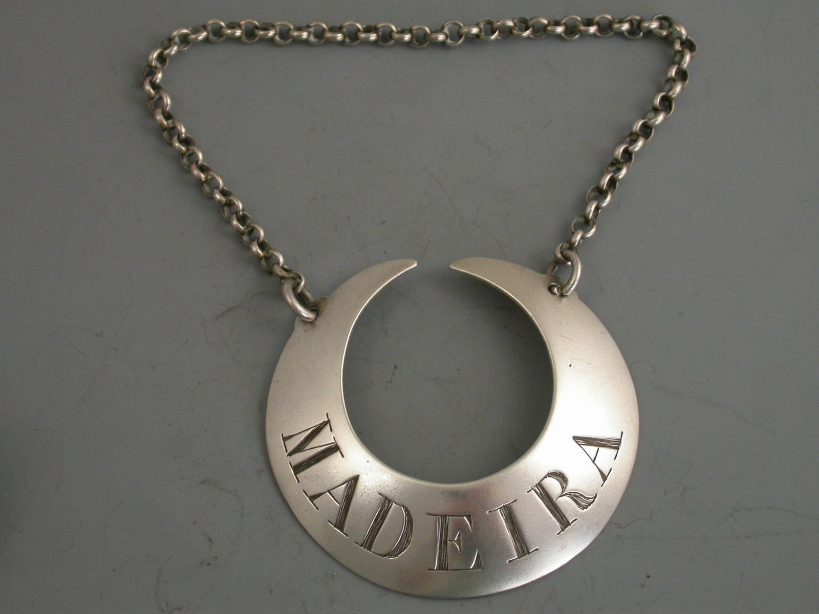 An extremely rare George II silver Wine Label of large plain crescent form with protruding ears holding the jumper rings for the suspension chain, incised for Madeira.